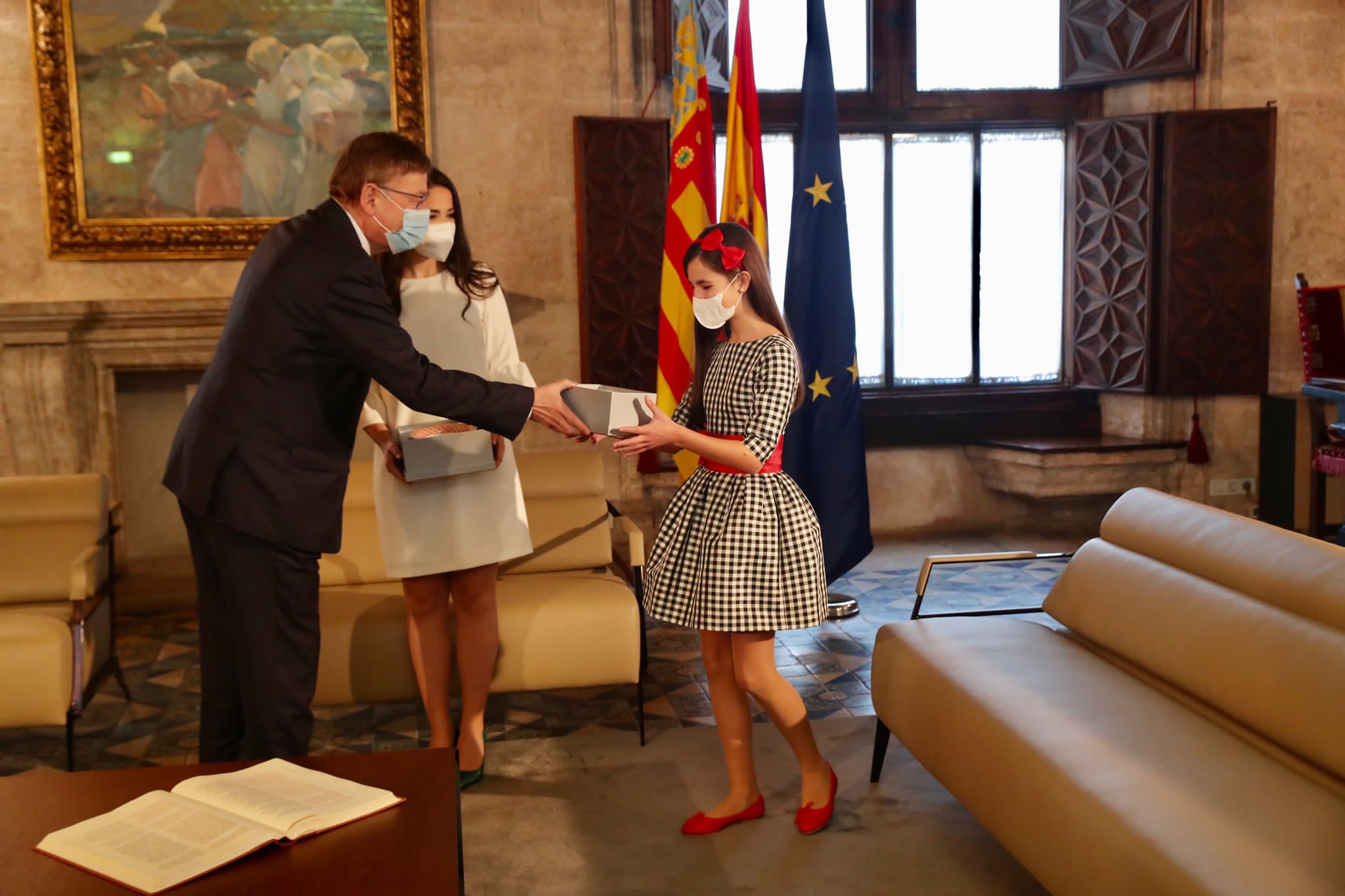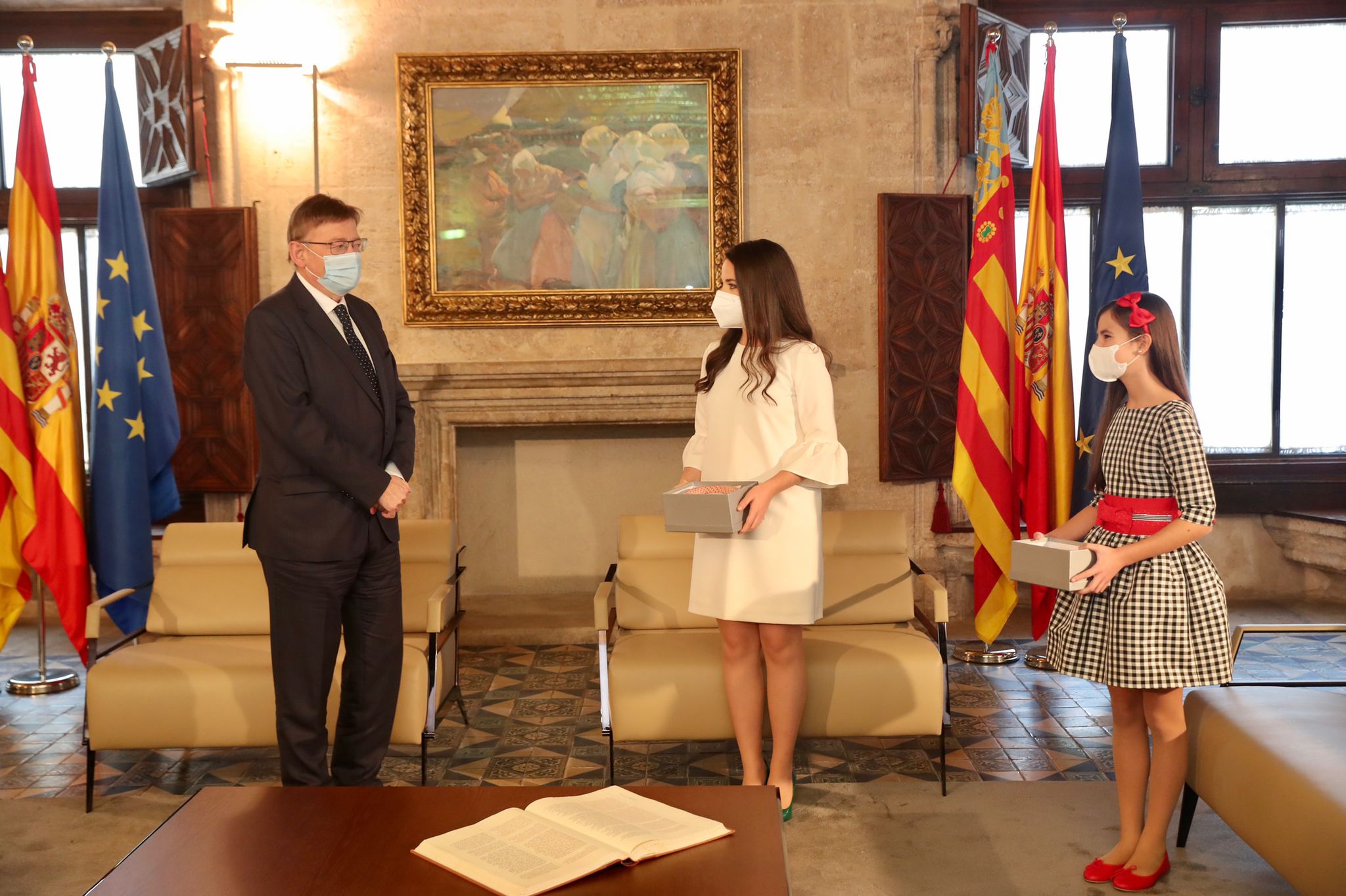 Carmen Martín y Nerea López, Falleras Mayores de València 2022 han empezado este miércoles la ronda de visitas institucionales en las que irán siendo recibidas por las prinicpales autoridades de la Comunitat Valenciana y de la ciudad de València. La primera cita ha sido en el Palau de la Generalitat, donde han sido recibidas por el president de la Generalitat, Ximo Puig, con el que han conversado durante unos minutos y han recibido un regalo. Después las máximas representantes de las Fallas han acudido a la Delegación del Gobierno en la Comunitat Valenciana, donde han mantenido un encuentro con la delegada Gloria Calero.