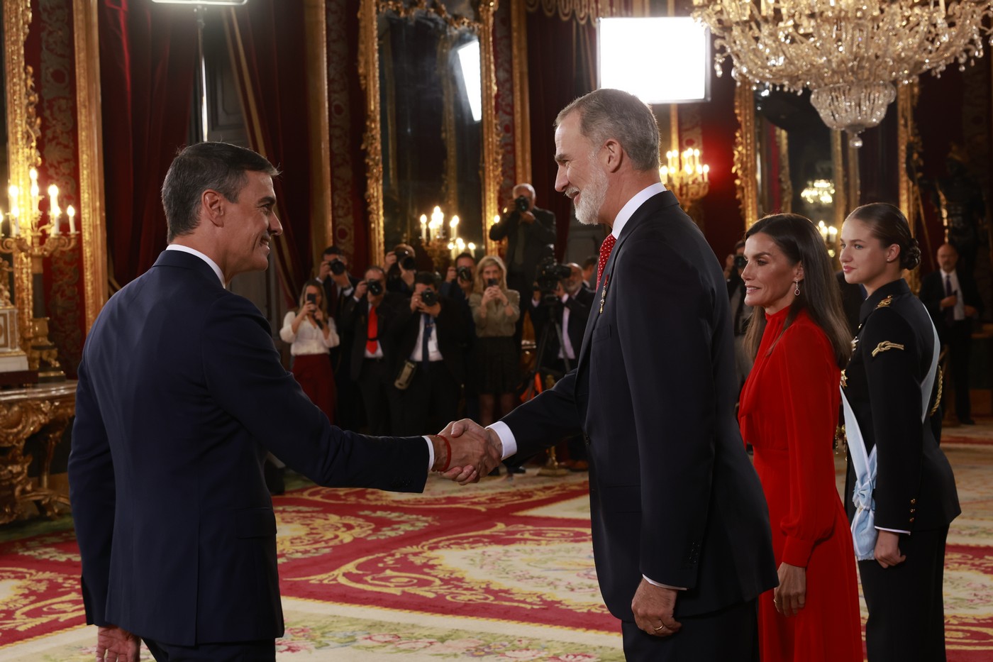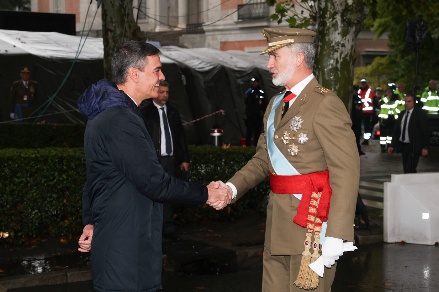 Sánchez, quien llegó unos minutos antes que los Reyes a la zona de autoridades, saludó brevemente a la presidenta de la Comunidad de Madrid, Isabel Díaz Ayuso, al alcalde José Luis Martínez Almeida, y a la ministra de Defensa, Margarita Robles. En ese momento, algunos asistentes ubicados en las inmediaciones de Neptuno, donde se situaba la tribuna real, aprovecharon para expresar su descontento con abucheos, a pesar de las adversas condiciones meteorológicas.
