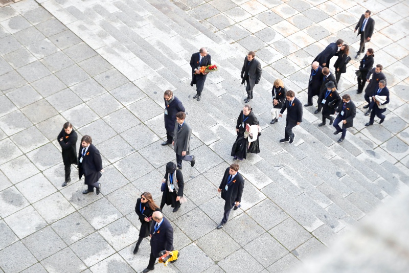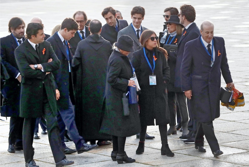 Los nietos y bisnietos de Franco, quienes lucían luto riguroso y lazos naranjas, portaban a hombros dicho féretro al sacarlo de la basílica y antes de introducirlo en uno de los dos helicópteros Puma del Estado preparados para el traslado hasta Mingorrubio.
