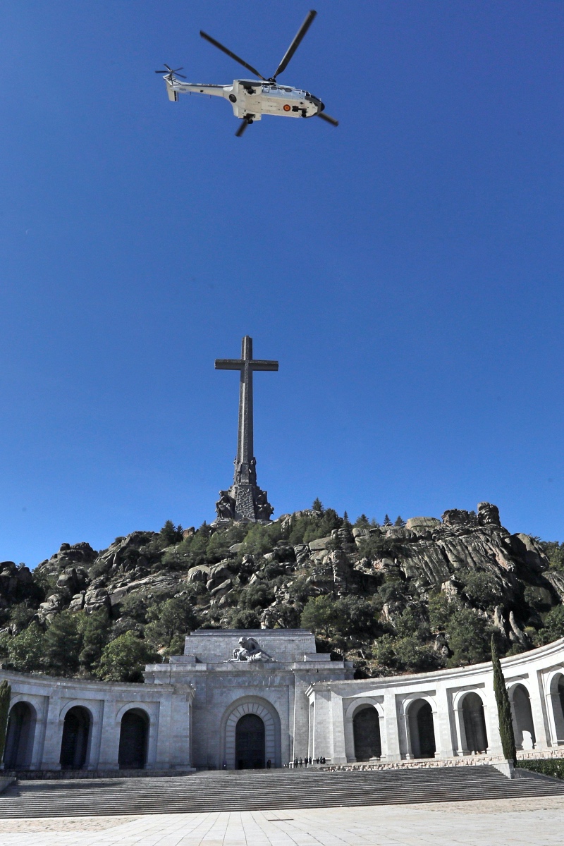 - El helicóptero Super Puma del Ejército del Aire que traslada los restos mortales de Francisco Franco, despega la Basílica del Valle de Los Caídos rumbo al cementerio de El Pardo-Mingorrubio donde se procederá a la reinhumación del dictador, en Madrid, a 24 de octubre de 2019. 24 octubre 2019 10/24/2019