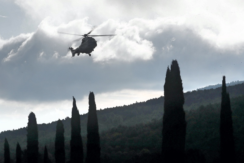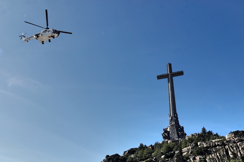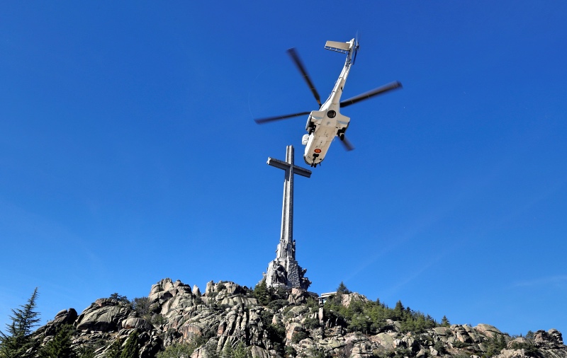 - Vista del helicóptero que traslada los restos de Francisco Franco tras su exhumación del Valle de los Caídos camino del cementerio de El Pardo-Mingorrubio para su reinhumación, en Madrid, a 24 de octubre de 2019. 24 octubre 2019 10/24/2019
