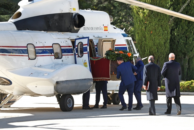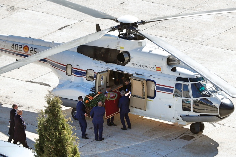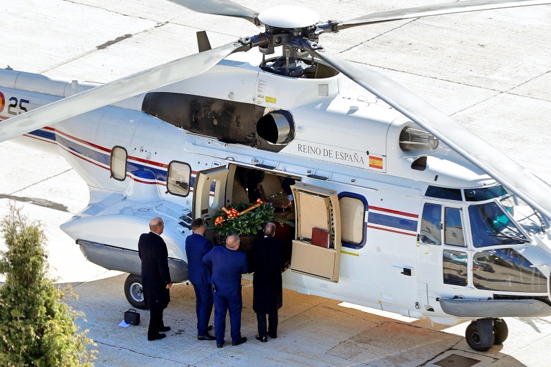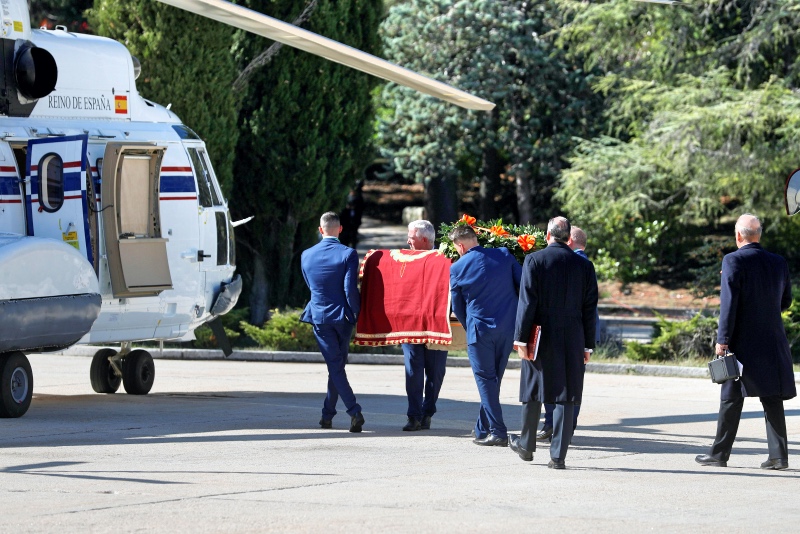 - Familiares de Francisco Franco con la ayuda de operarios introducen el féretro con los restos mortales del dictador en el helicóptero de las Fuerzas Armadas, tras su exhumación en la basílica del Valle de los Caídos, para su posterior trasladado al cementerio de El Pardo-Mingorrubio para ser reinhumado, en Madrid, a 24 de octubre de 2019. 24 de cotubre de 2019 10/24/2019