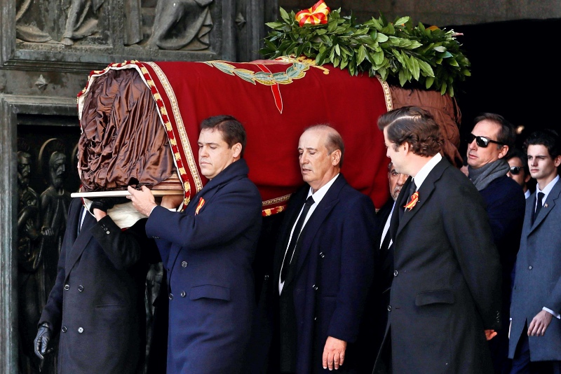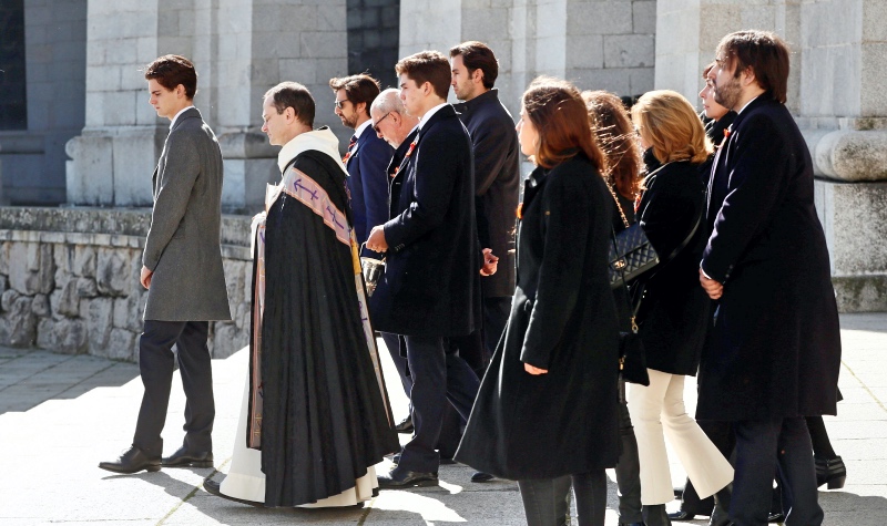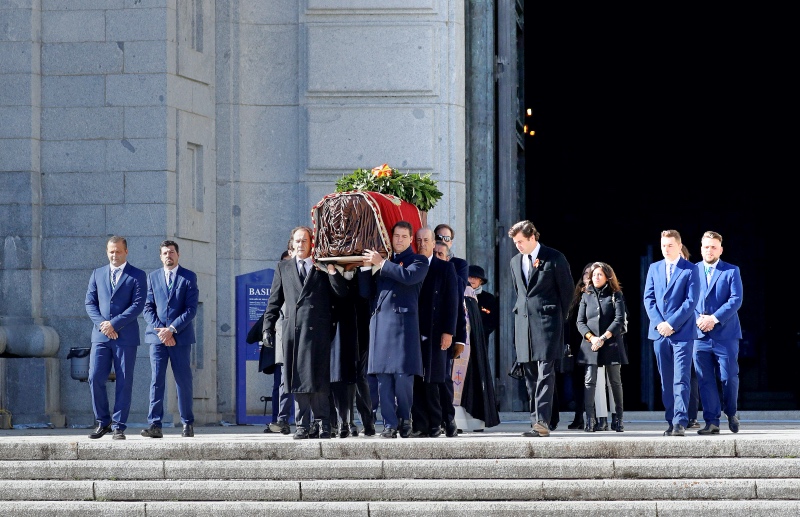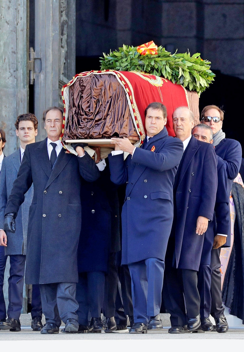 - Luis Alfonso de Borbón (i), Francis Franco (2i) y Jaime Martínez-Bordiú (3d), entre otros familiares de Francisco Franco, portan el féretro con los restos mortales del dictador tras su exhumación en la basílica del Valle de los Caídos antes de su trasladado al cementerio de El Pardo-Mingorrubio para su reinhumación, en Madrid, a 24 de octubre de 2019. 24 de octubre de 2019 10/24/2019