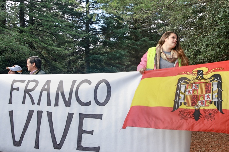 - Un reducido grupo de manifestantes franquistas ha desplegado una pancarta con la frase ‘Franco vive’ y sujeta la bandera franquista momentos antes de la exhumación de los restos de Francisco Franco de la basílica del Valle de los Caídos, en San Lorenzo de El Escorial (Madrid), a 24 de octubre de 2019. 24/10/2019, INHUMACIÓN 10/24/2019