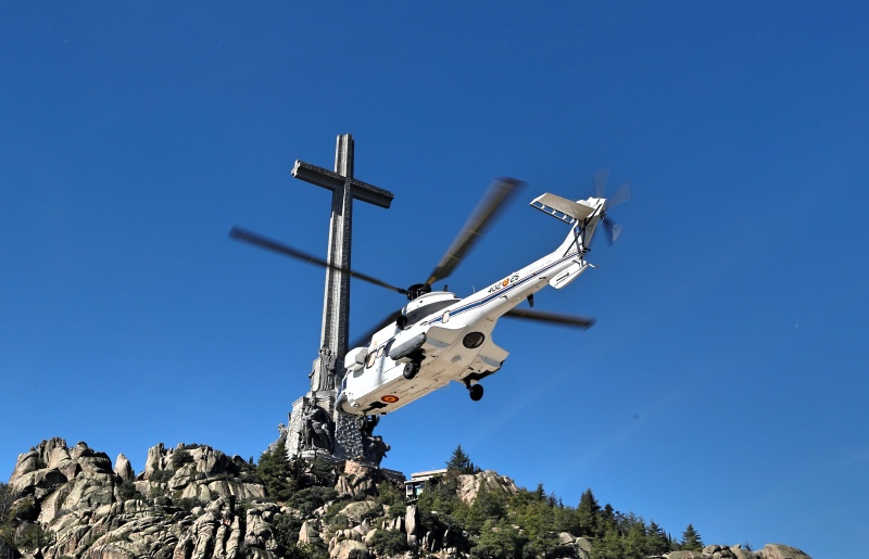 - El helicóptero que transportará el féretro con los restos mortales de Francisco Franco hasta el cementerio de El Pardo-Mingorrubio, un Super Puma del Ejército del Aire, a su llegada al Valle de los Caídos, en Madrid, a 24 de octubre de 2019. 24 de octubre de 2019 10/24/2019
