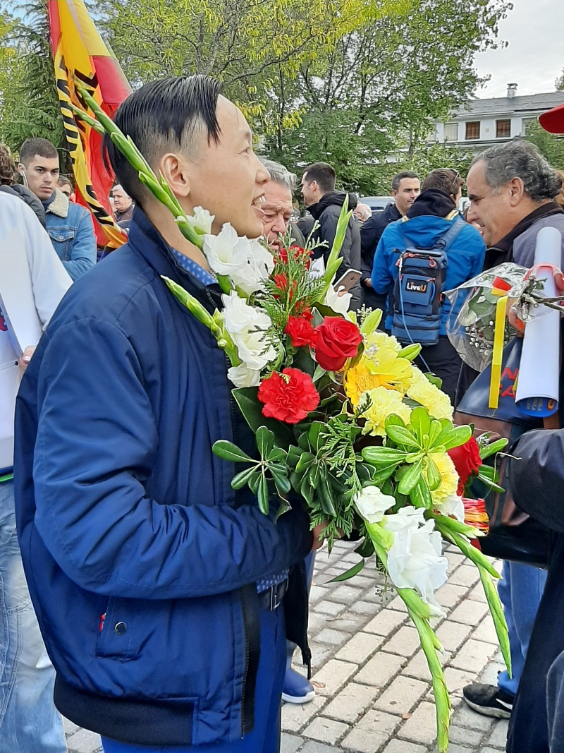 - Un manifestante de origen oriental porta flores en una pequeña concentración de franquistas en las inmediaciones del cementerio de El Pardo Mingorrubio antes de la inhumación de los restos de Francisco Franco en El Pardo (Madrid, España), a 24 de octubre de 2019. 24 octubre 2019, INHUMACIÓN 10/24/2019