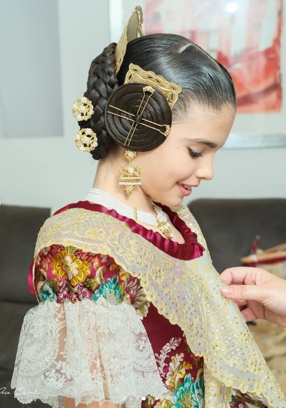 Se complementa con un juego de manteleta y delantal bordado en cadeneta con oro y lentejuela colocada manualmente por la firma María Teresa Albuixech, mientras que las puntillas, de Santos Textil, son de tul bordado hilo de 12 centímetros en color beige subido.