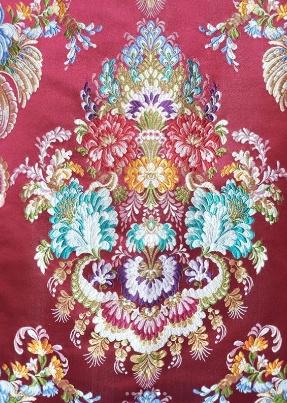 El dibujo elegido recibe el nombre de ‘Posada’, una seda estrecha de la firma Vives y Marí tejido en color borgoña y metal oro, confeccionado según los cánones tradicionales del siglo XIX y manga de farol.