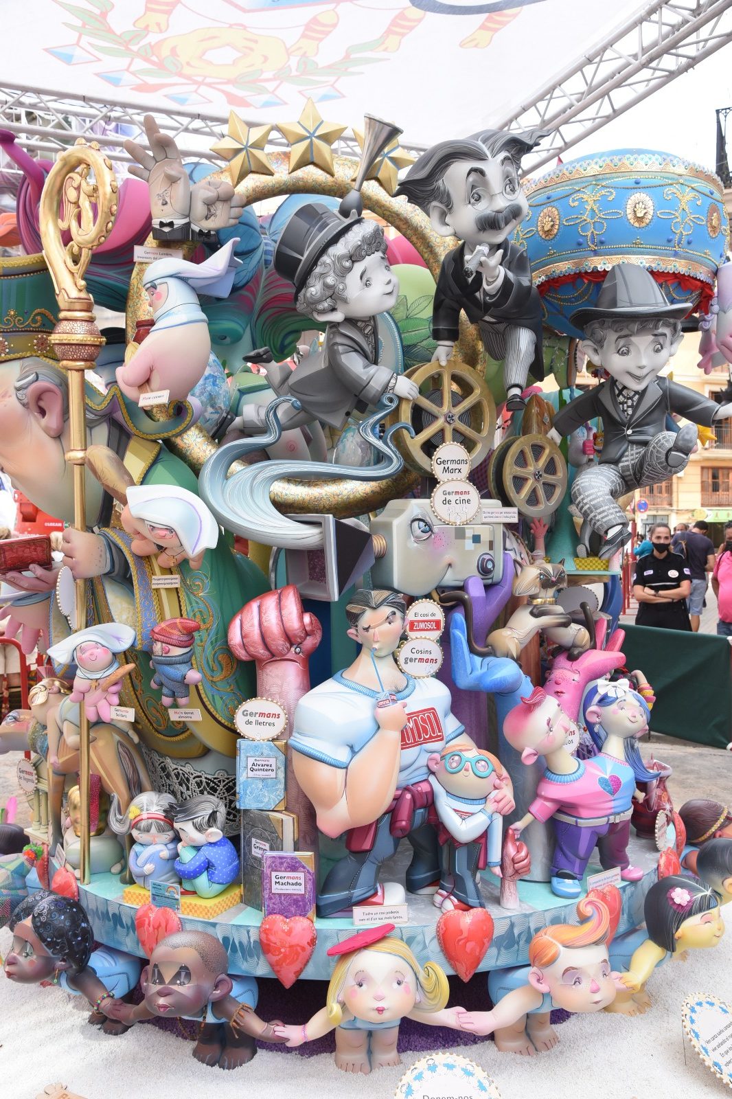 Con un presupuesto de 40.000 euros, una base de tres metros y una altura de tres metros, esta composición que se ha alzado con el máximo galardón fallero quiere transmitir a los más pequeños la importancia de la fraternidad y la familia a través de muchas manos para estar siempre unidos.