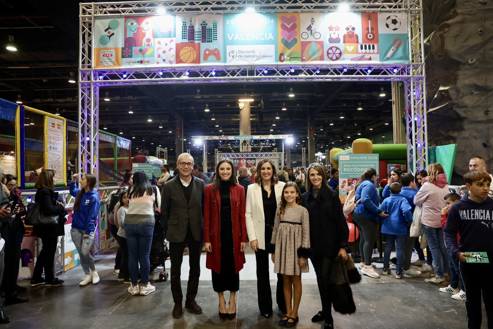 La alcaldesa de València ha presidido la inauguración de Expojove, acompañada por la concejala delegada de Familia, Juventud e Infancia, Mónica Gil, y las falleras mayores de València 2024, María Estela Arlandis y Marina García, además de otros representantes de la corporación municipal.