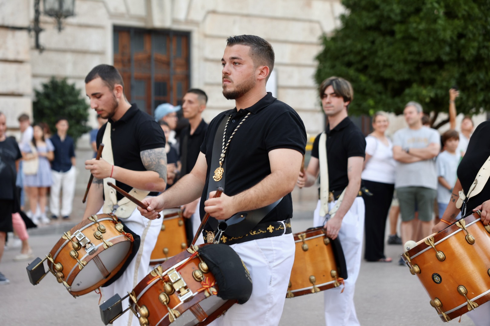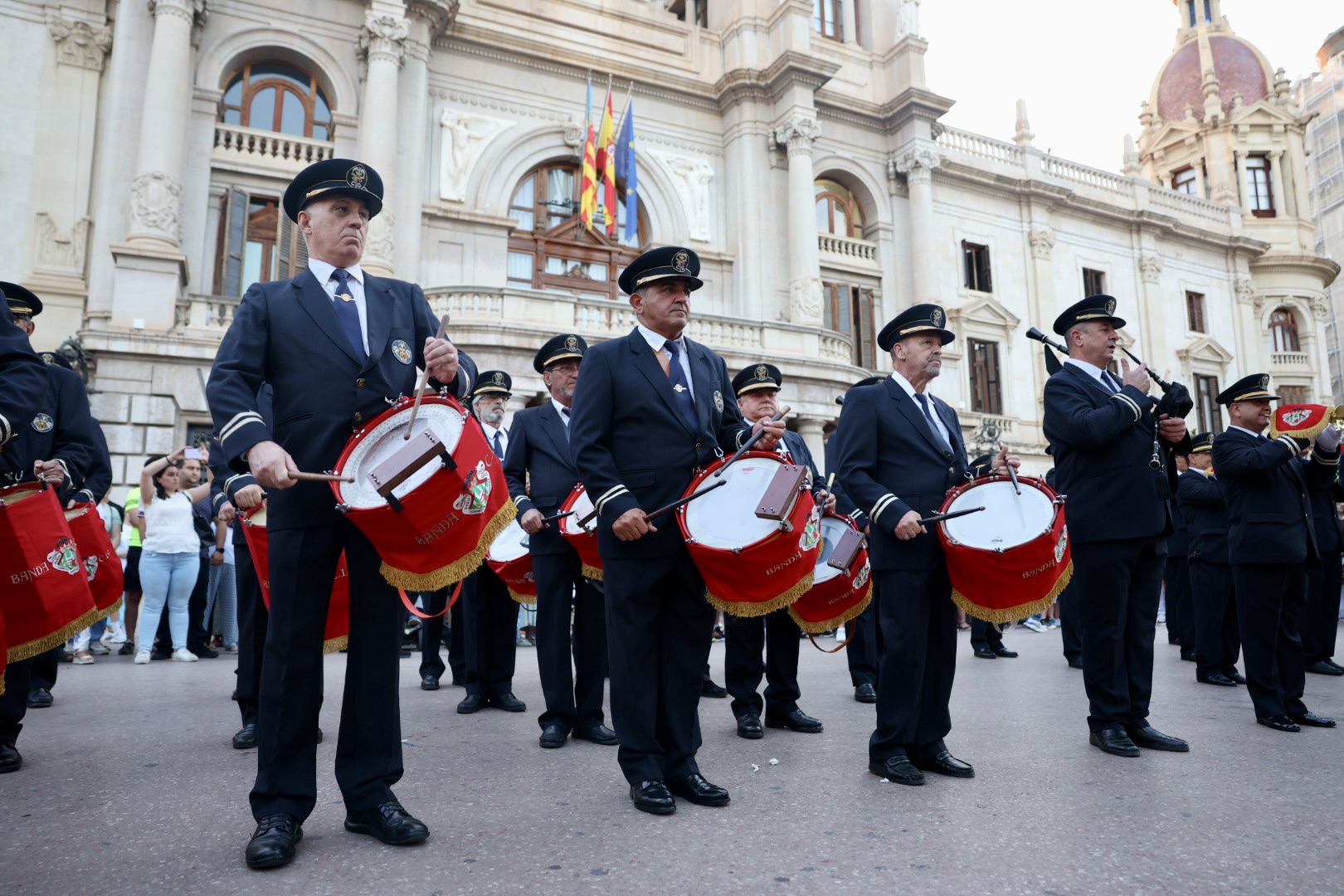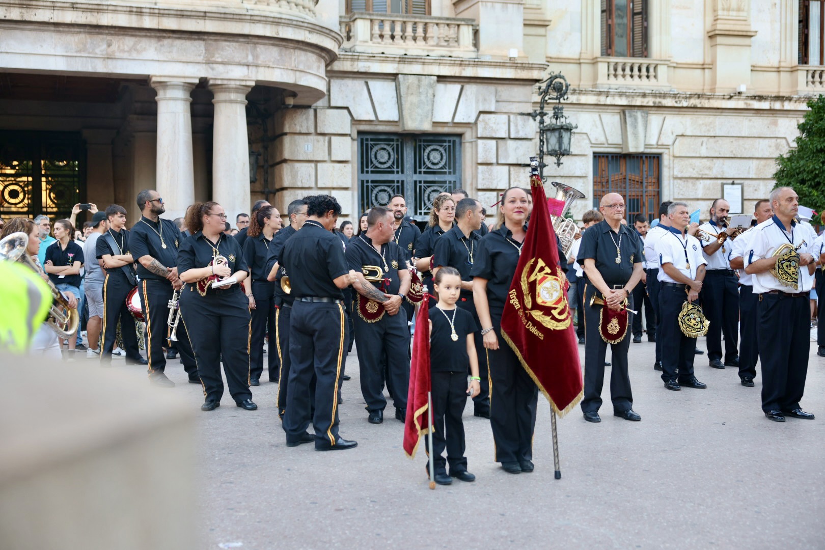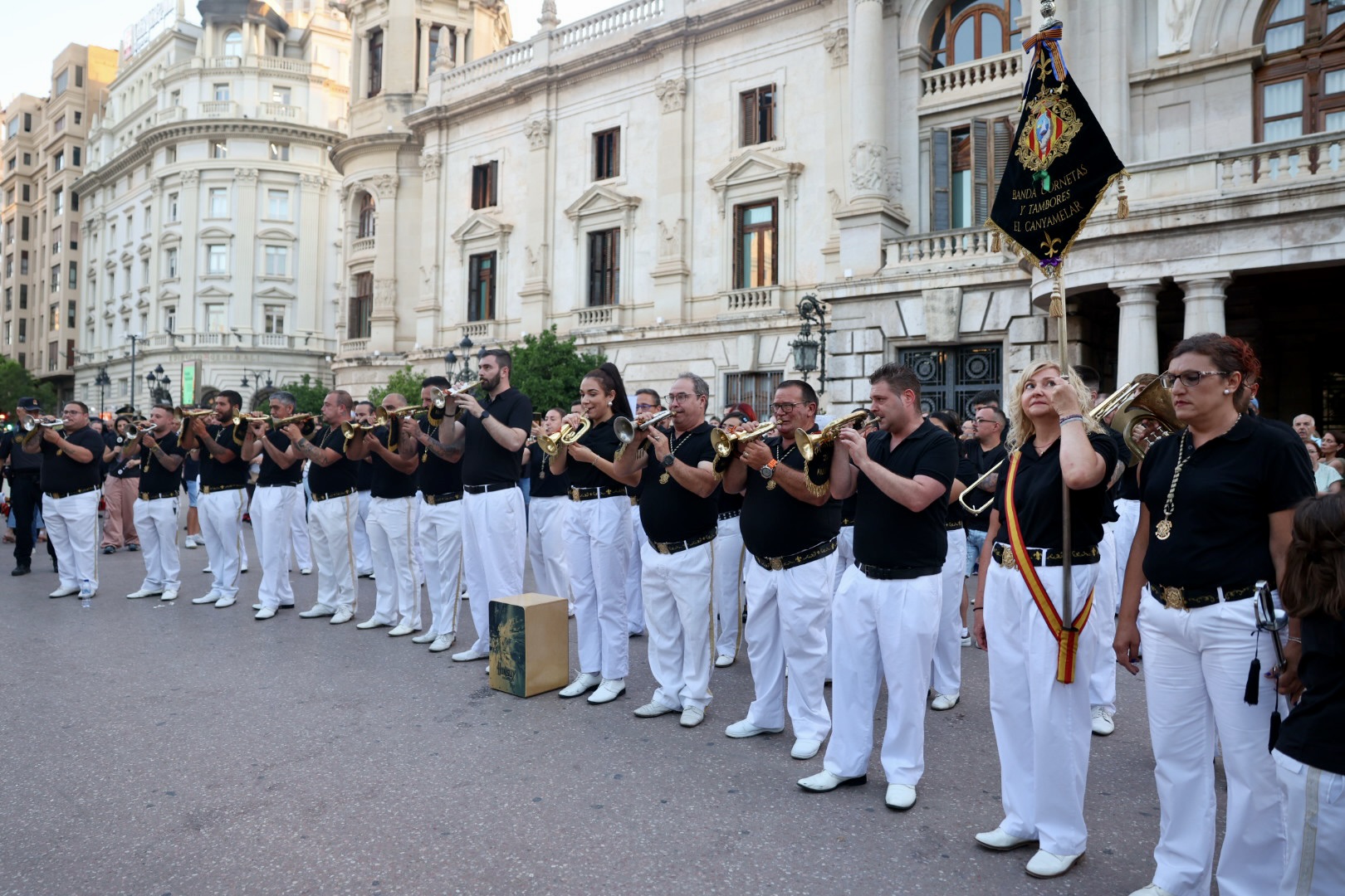 Un desfile y entrada de bandas de cornetas y tambores recorrerá la calle San Vicente hasta la plaza del Ayuntamiento, para confluir ante el balcón de la fachada principal del Ayuntamiento, donde cada formación interpretó unas piezas. Participaron en la comitiva las bandas de Cornetas, Gaitas y Tambores CIO, San Luís Beltrán, Canyamelar y Virgen de los Dolores.