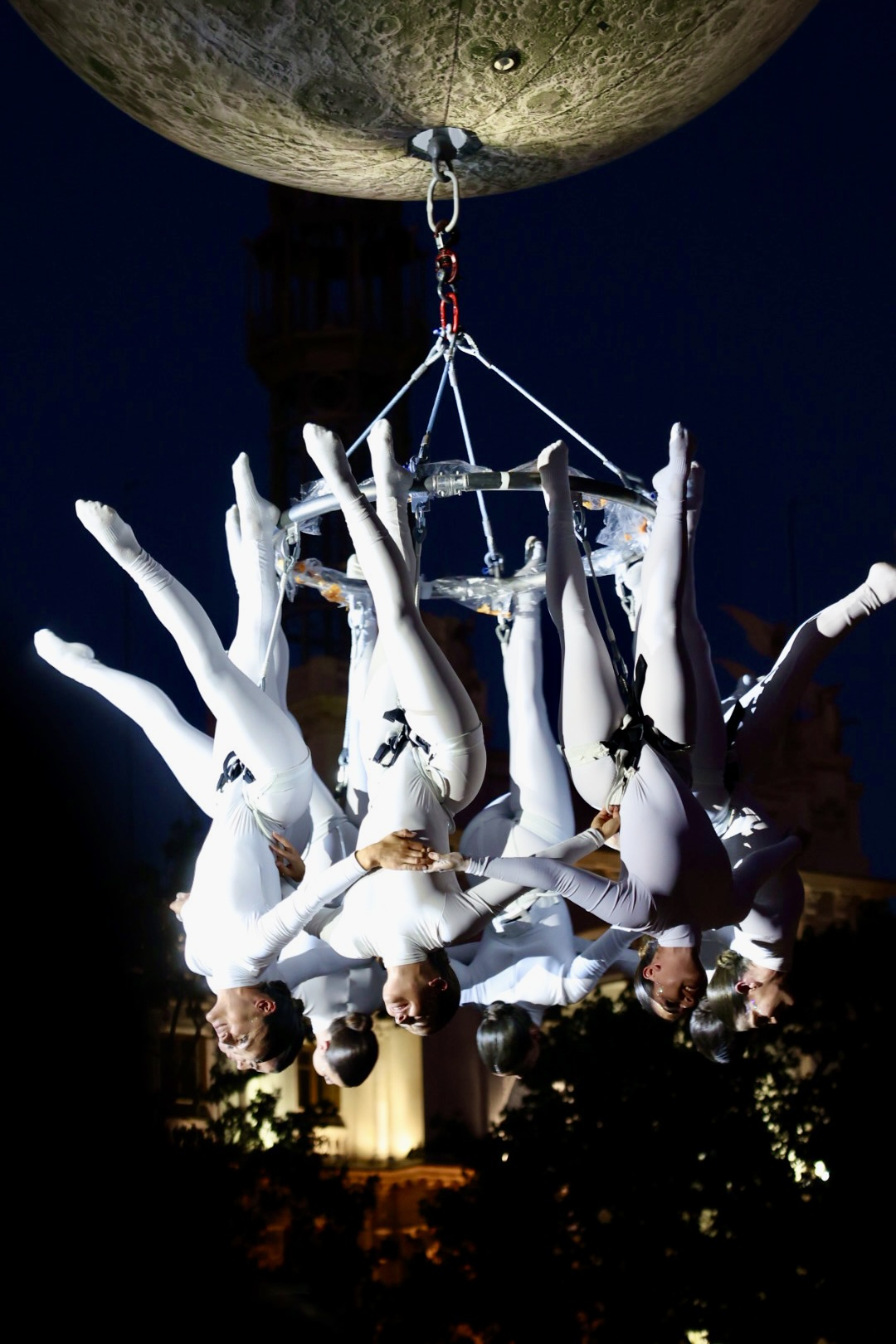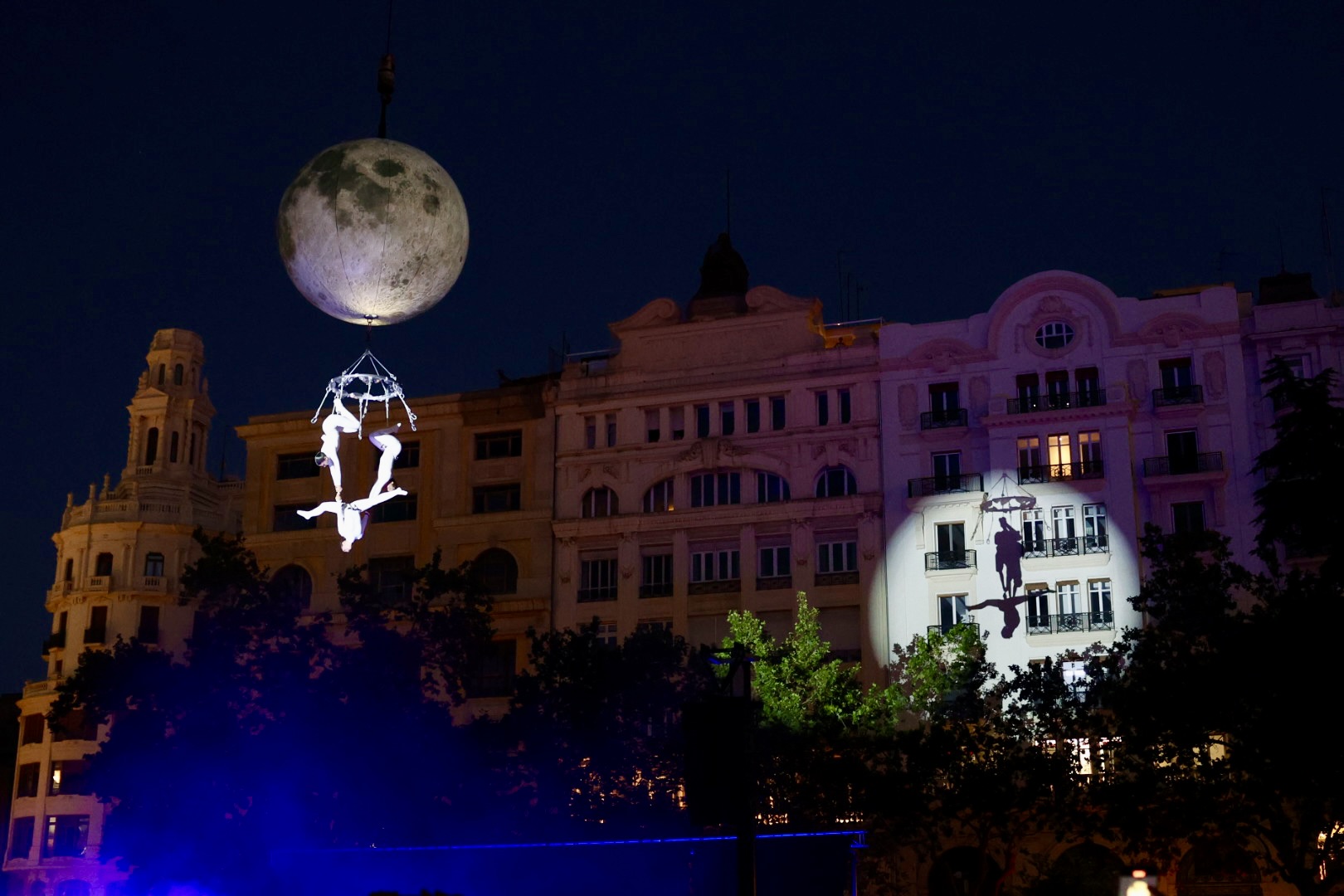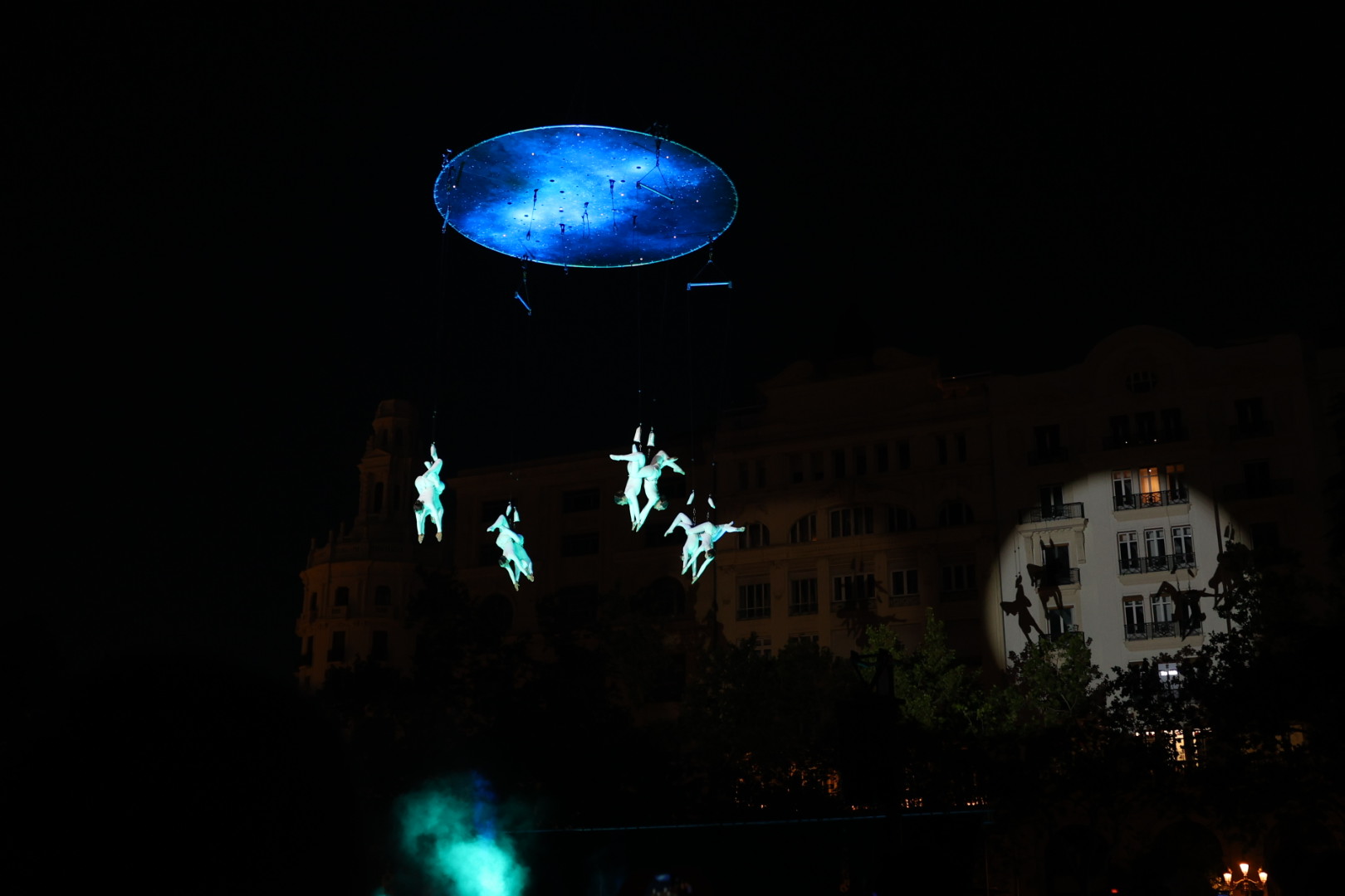 La Gran Feria de València ha arrancado este lunes con un gran espectáculo de danza aérea en la plaza del Ayuntamiento