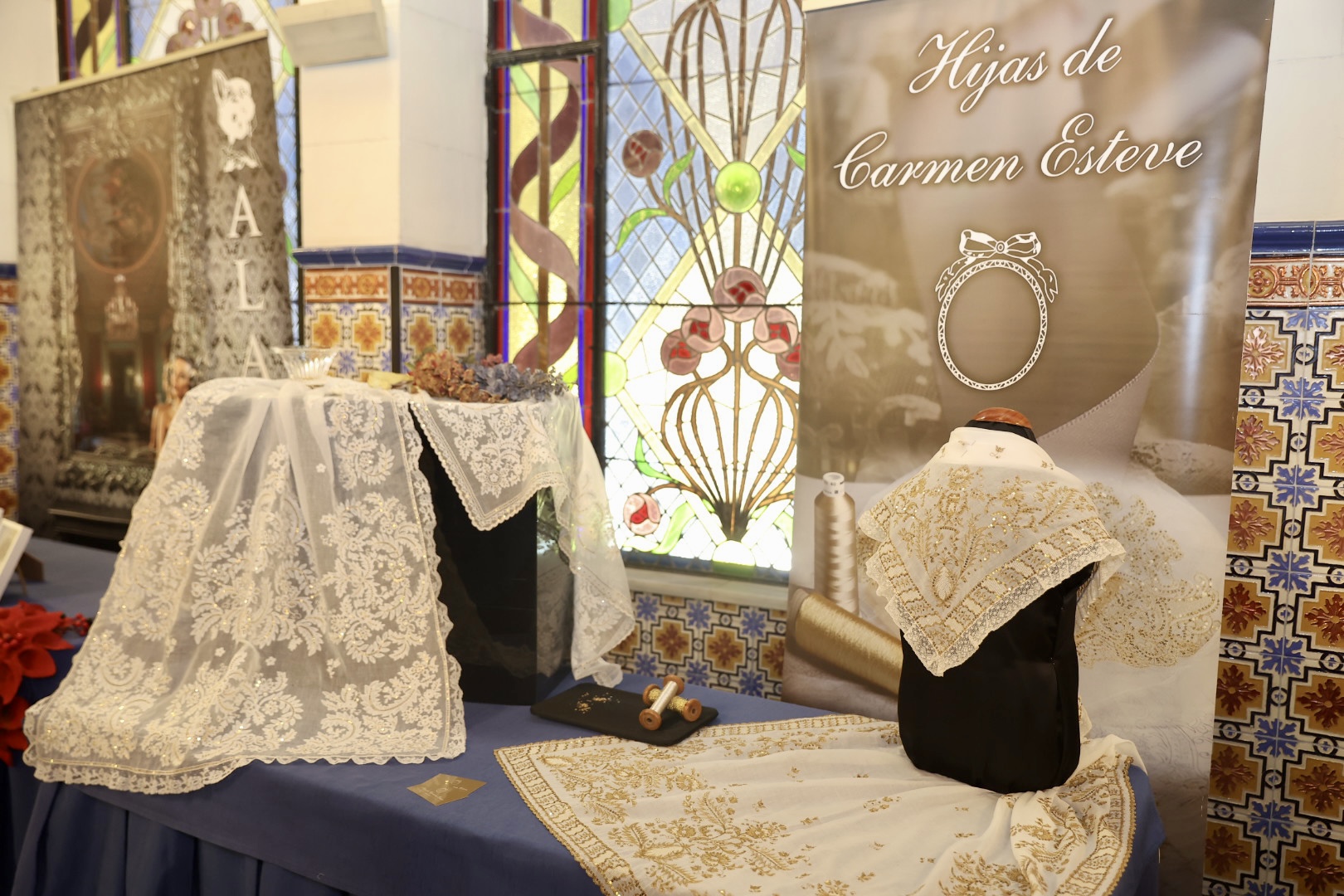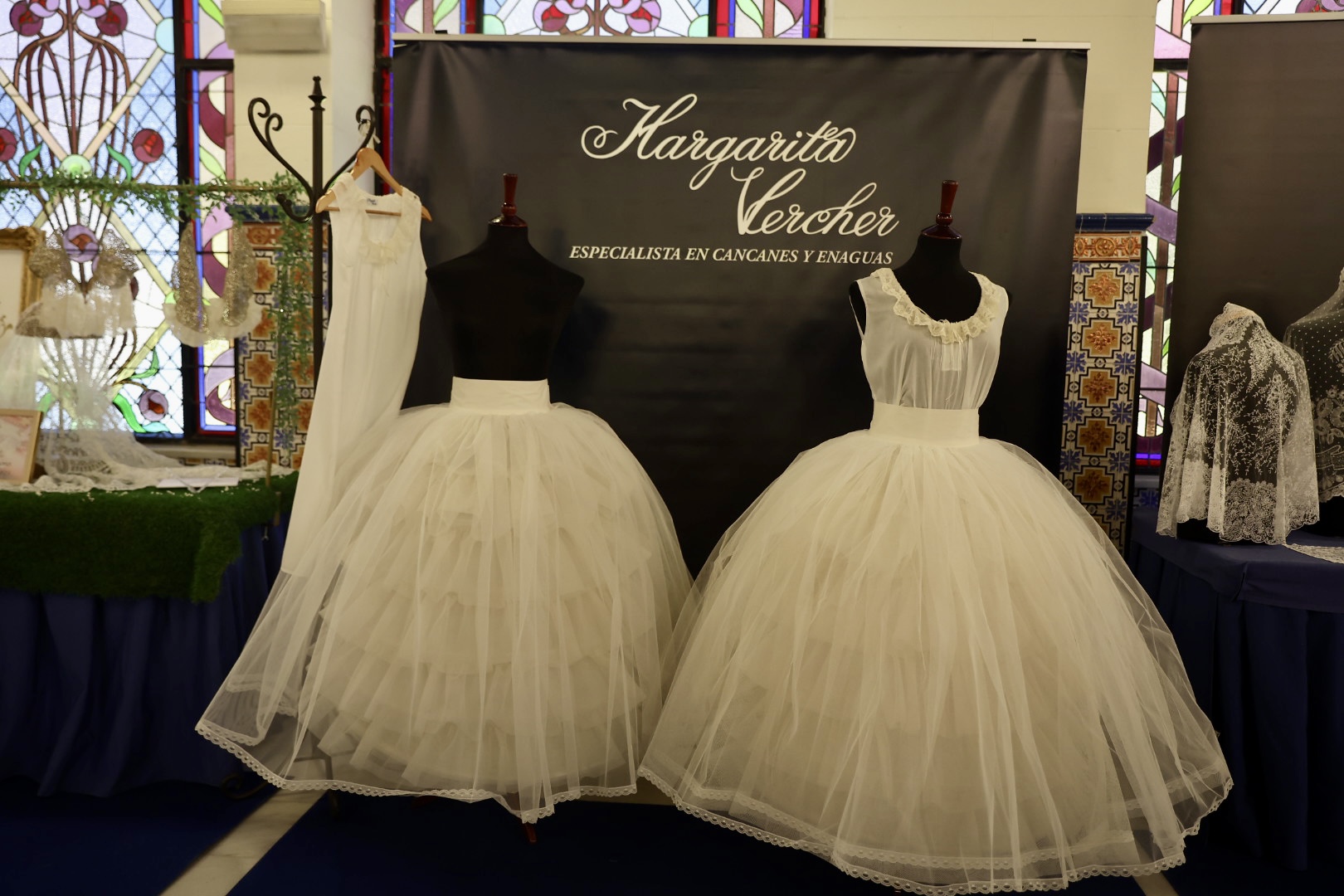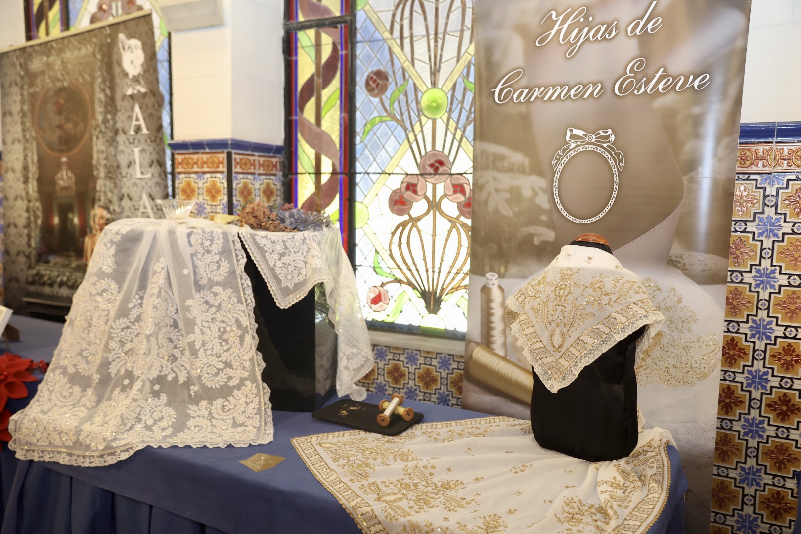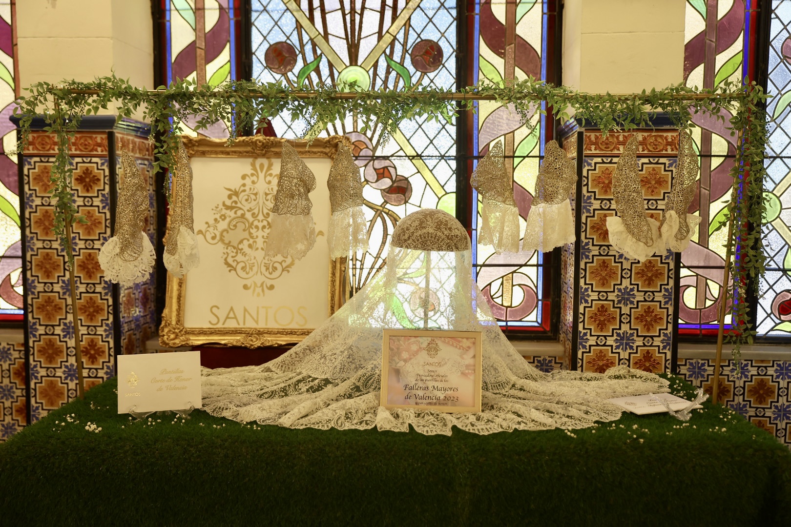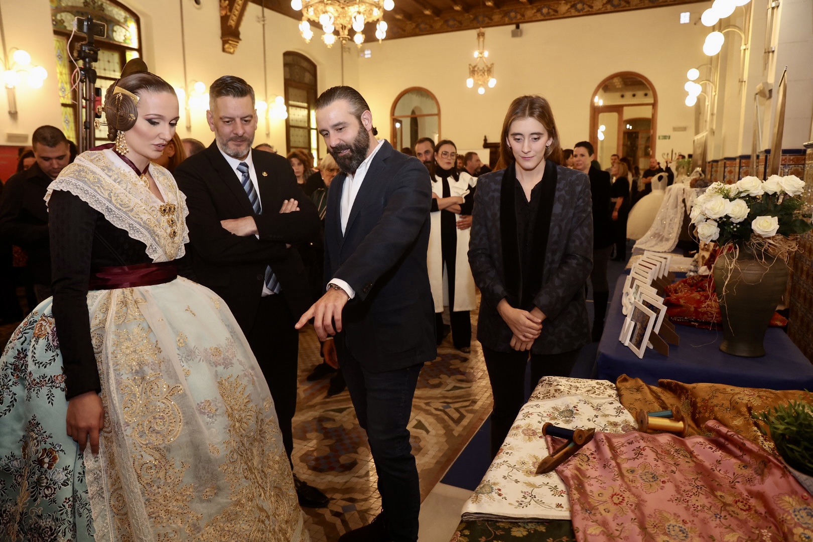 Respecto a las puntillas, de Santos Textil, para la Fallera Mayor de València está inspirada en un dibujo antiguo creado específicamente para ella y combina varios tipos de flores protagonistas de mayor tamaño con minúsculas florecillas engarzadas entre sí formando enredaderas bordadas en delicada caída. En cuanto al segundo traje, lucirá una puntilla bordada en color ivoire 12 cm. Una propuesta “alegre y juvenil” con motivos vegetales como semillas de trigo, diversos tipos de flores y guirnaldas que componen “una alegoría simbólica” en una composición “perfectamente simétrica y favorecedora”. La del primer traje de la Corte está protagonizada por pequeñas flores que suben y bajan a modo de guirnaldas creando “una perfecta simetría” y su ancho de 12 centímetros en color ivoire, mientras que la del segundo está bordada con hilo de algodón, un giupure muy fino y diferente al resto de puntillas que ha llevado hasta ahora.