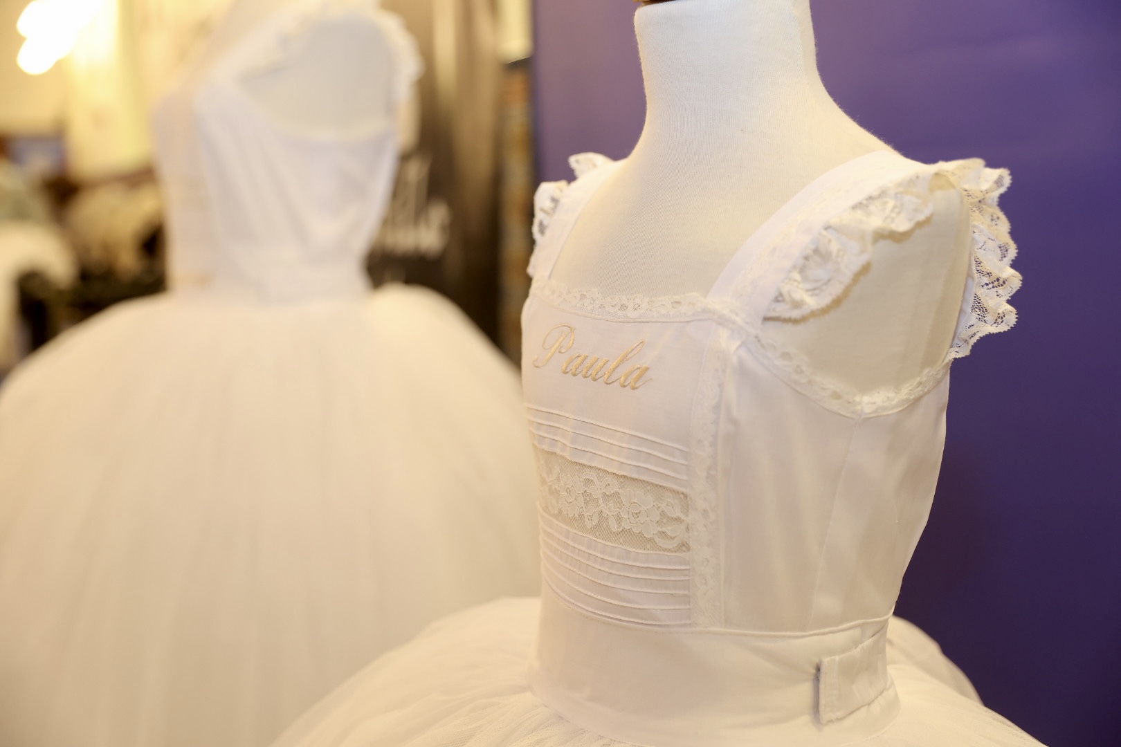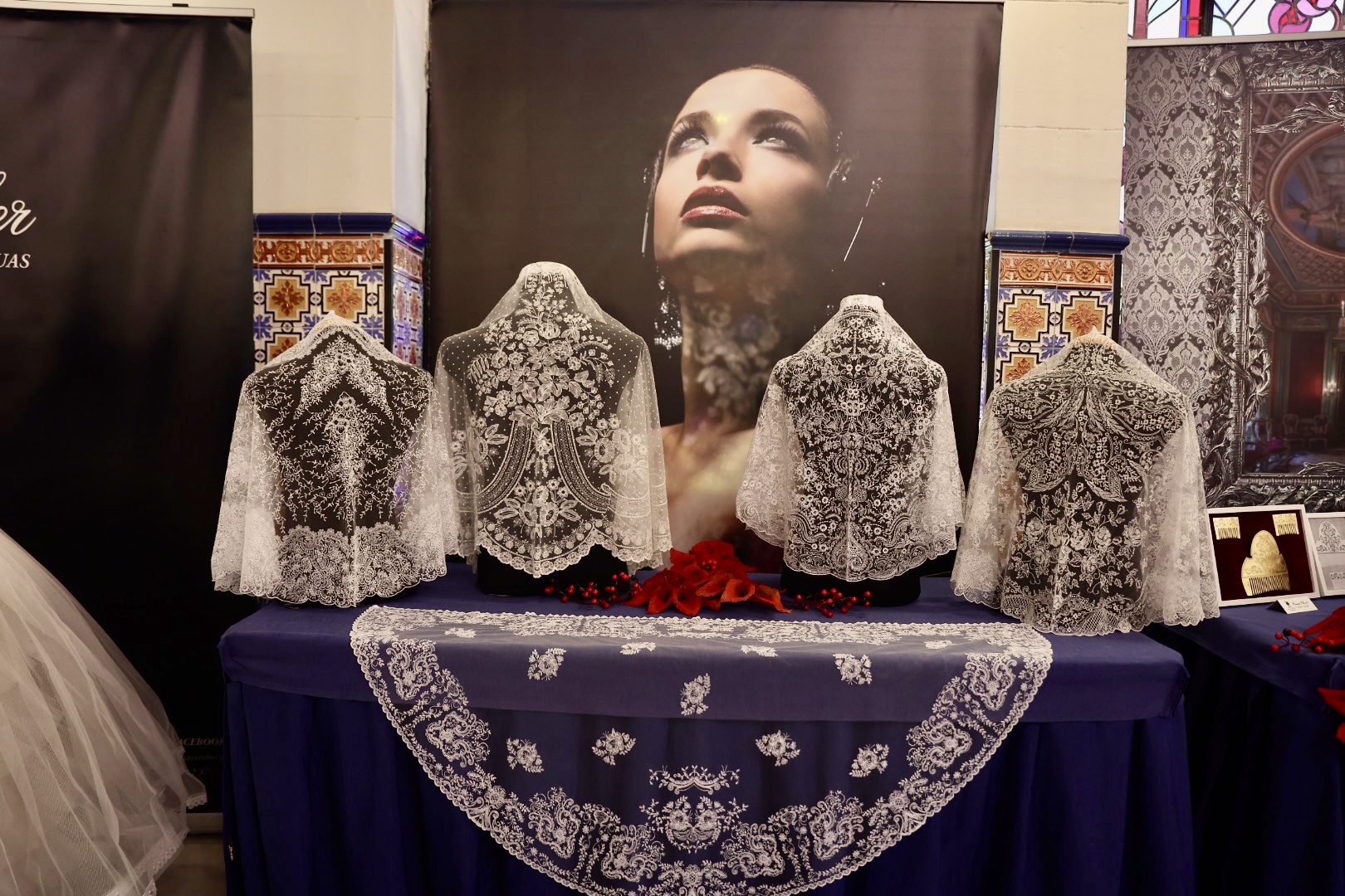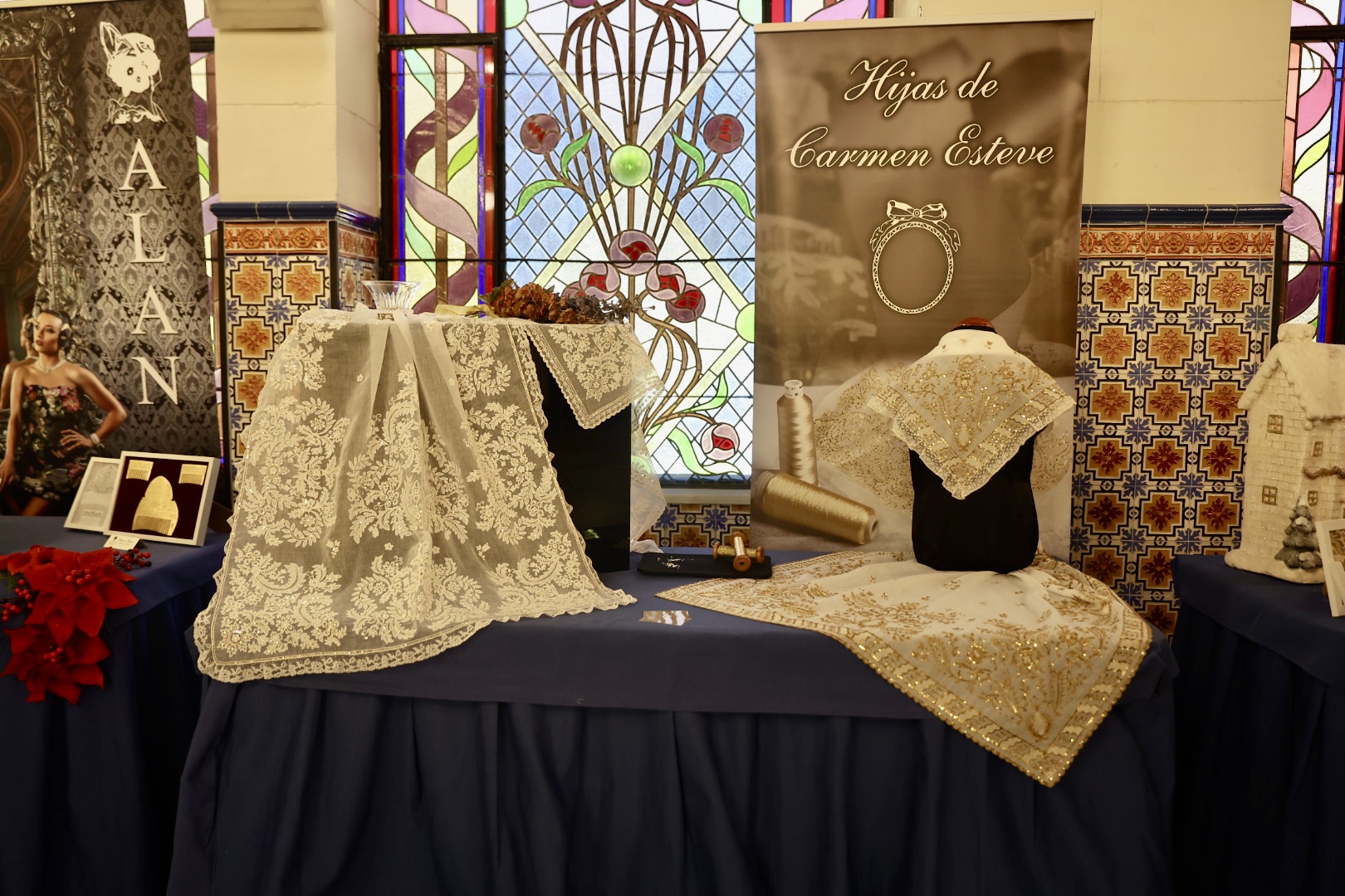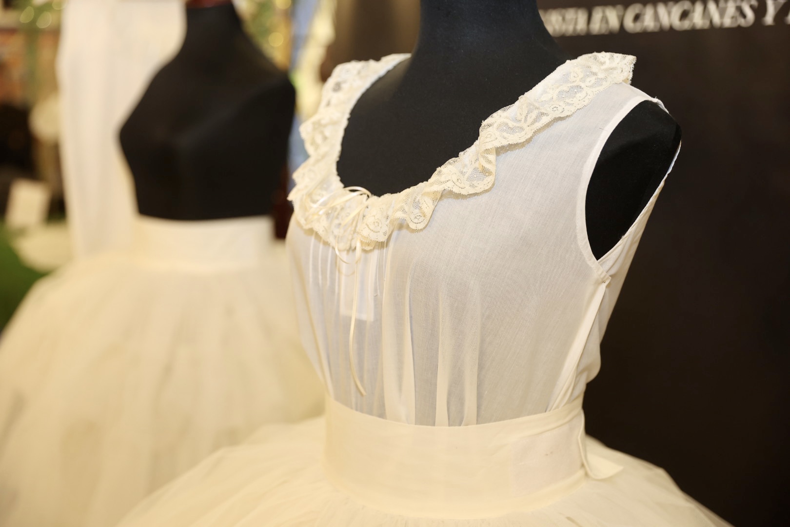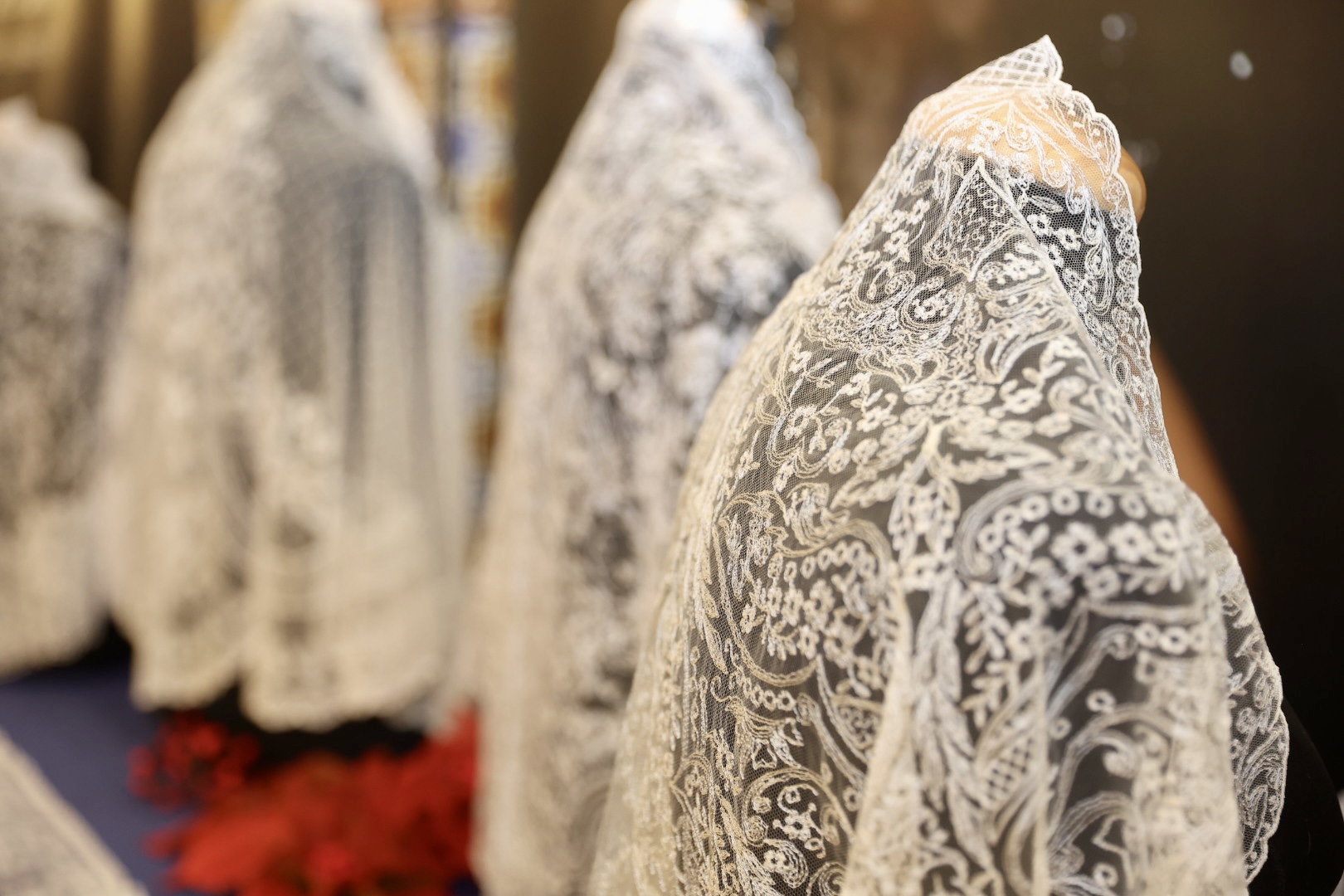 Respecto a las puntillas, de Santos Textil, para la Fallera Mayor de València está inspirada en un dibujo antiguo creado específicamente para ella y combina varios tipos de flores protagonistas de mayor tamaño con minúsculas florecillas engarzadas entre sí formando enredaderas bordadas en delicada caída. En cuanto al segundo traje, lucirá una puntilla bordada en color ivoire 12 cm. Una propuesta “alegre y juvenil” con motivos vegetales como semillas de trigo, diversos tipos de flores y guirnaldas que componen “una alegoría simbólica” en una composición “perfectamente simétrica y favorecedora”. La del primer traje de la Corte está protagonizada por pequeñas flores que suben y bajan a modo de guirnaldas creando “una perfecta simetría” y su ancho de 12 centímetros en color ivoire, mientras que la del segundo está bordada con hilo de algodón, un giupure muy fino y diferente al resto de puntillas que ha llevado hasta ahora.