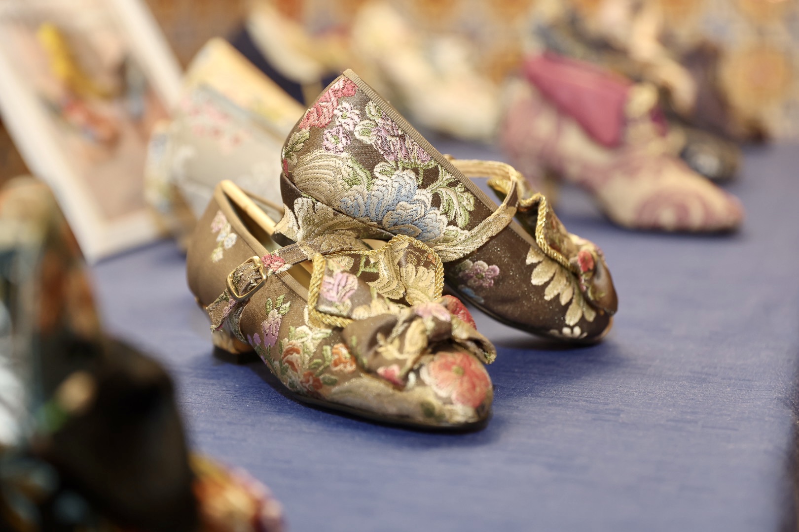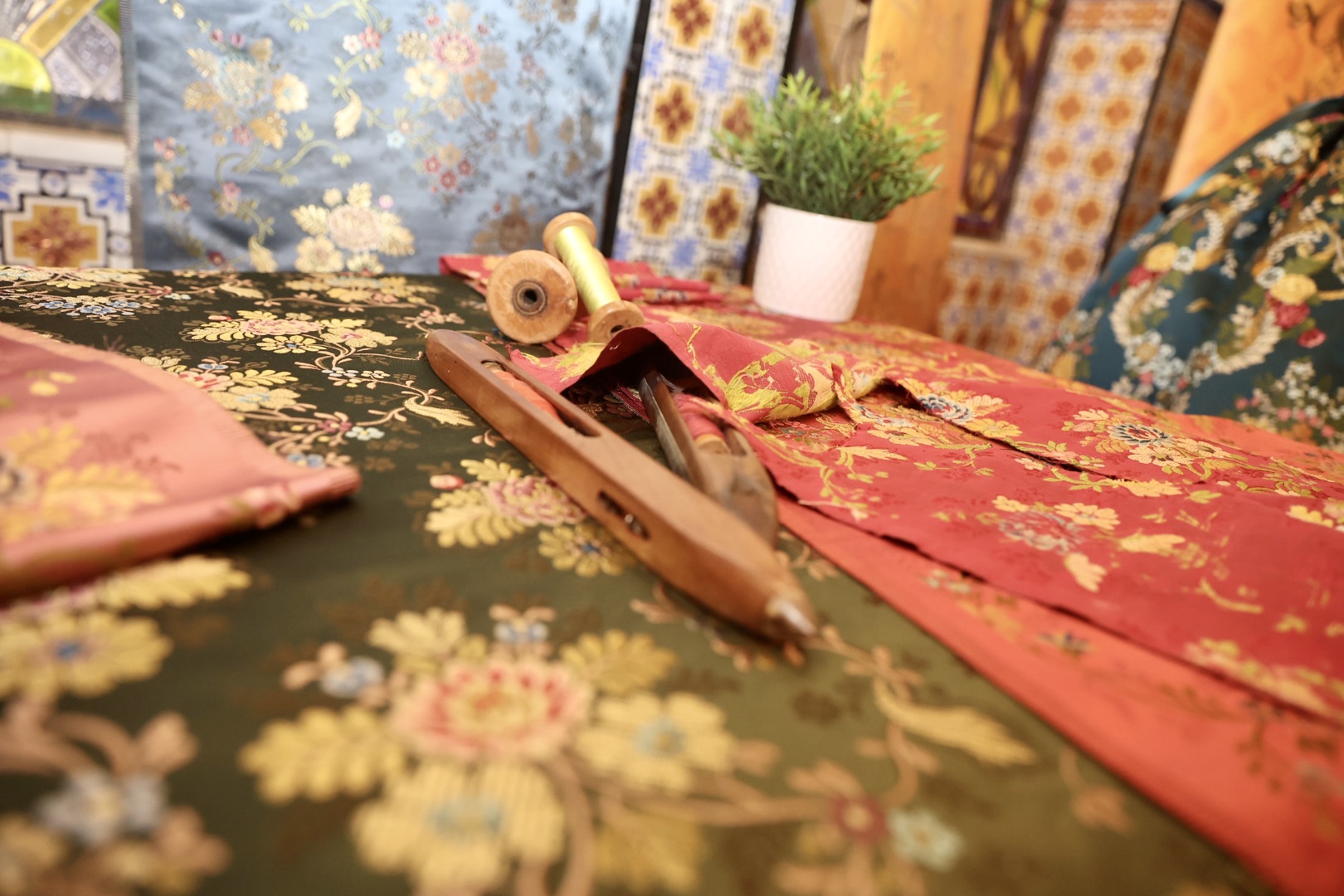 Por su parte, para el segundo traje, se ha elegido el dibujo ‘Isabel II’ y los colores verde agua, camel, marrón, gris acero, azulón y mostaza, con un ancho de 1,40 mts. Es un dibujo “muy representativo” del siglo XVIII, compuesto por una guirnalda floral cuya característica principal es su fondo de tafetán. Está trabajado con 12 colores de trama y el metal se ha sustituido por un color blanco que le aporta “luminosidad y ligereza” al tejido.