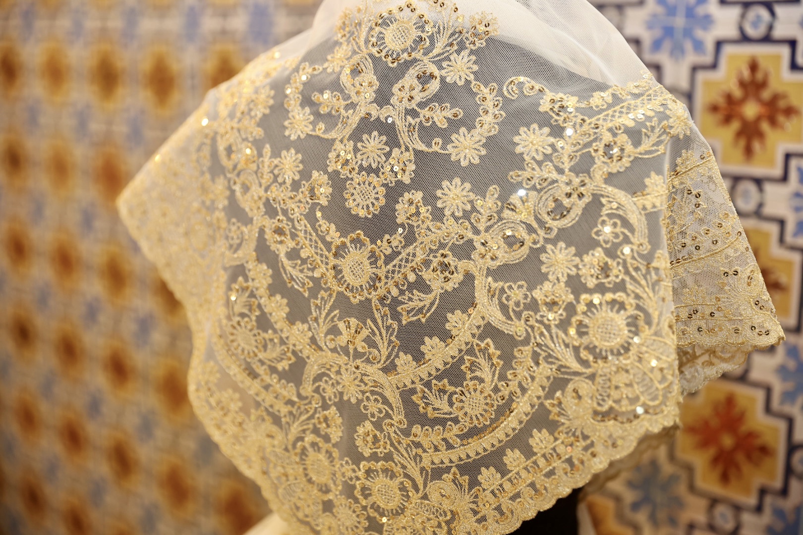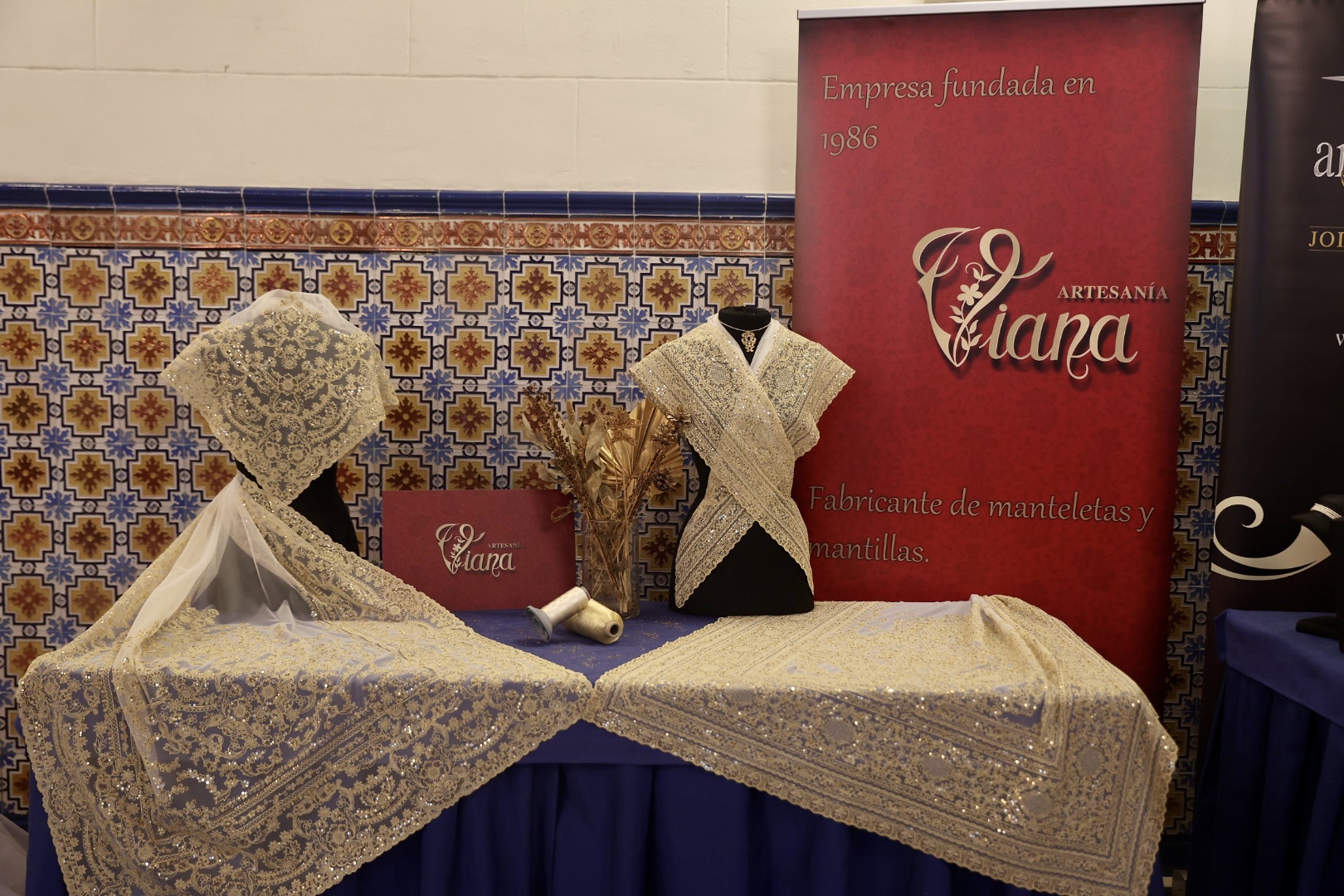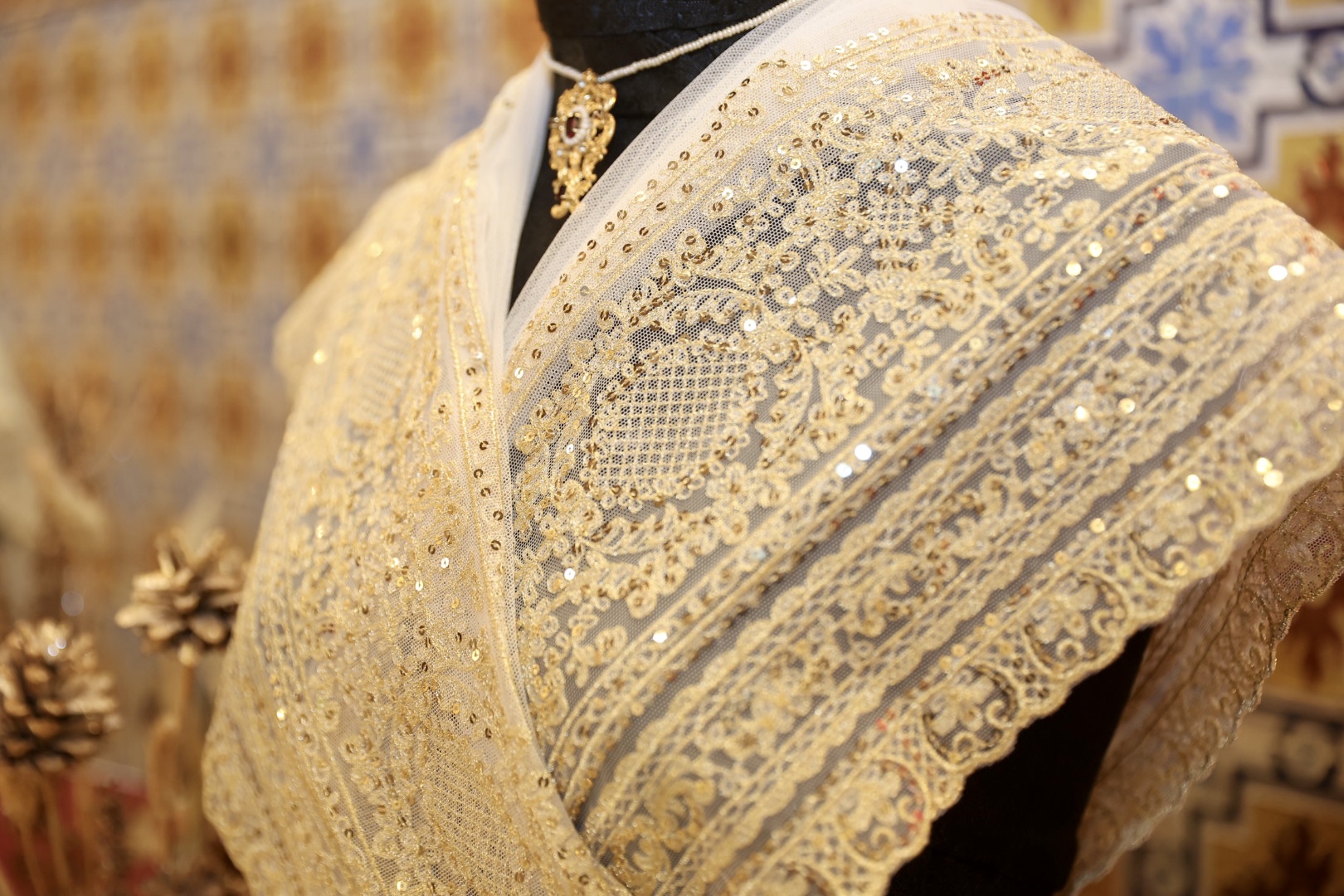 Las manteletas del primer traje de la Corte de la FMV, de Viana, están bordadas sobre tul de algodón, en hilo oro claro, la lentejuela es del nº3 y está cosida con hilo de oro, el dibujo es exclusivo y “muy rico” en cuanto a dibujo y acabados, además de ser “muy adecuado para el traje de gala. Por su lado, las manteletas del primer traje la CHFMIV están bordadas sobre tul de algodón, en hilo de metal dorado, la lentejuela es pequeña y está cosida con el mismo metal que el bordado, el dibujo es exclusivo y está compuesto por flores y rameado “muy apropiado” para infantil y especialmente para el traje de la exaltación.