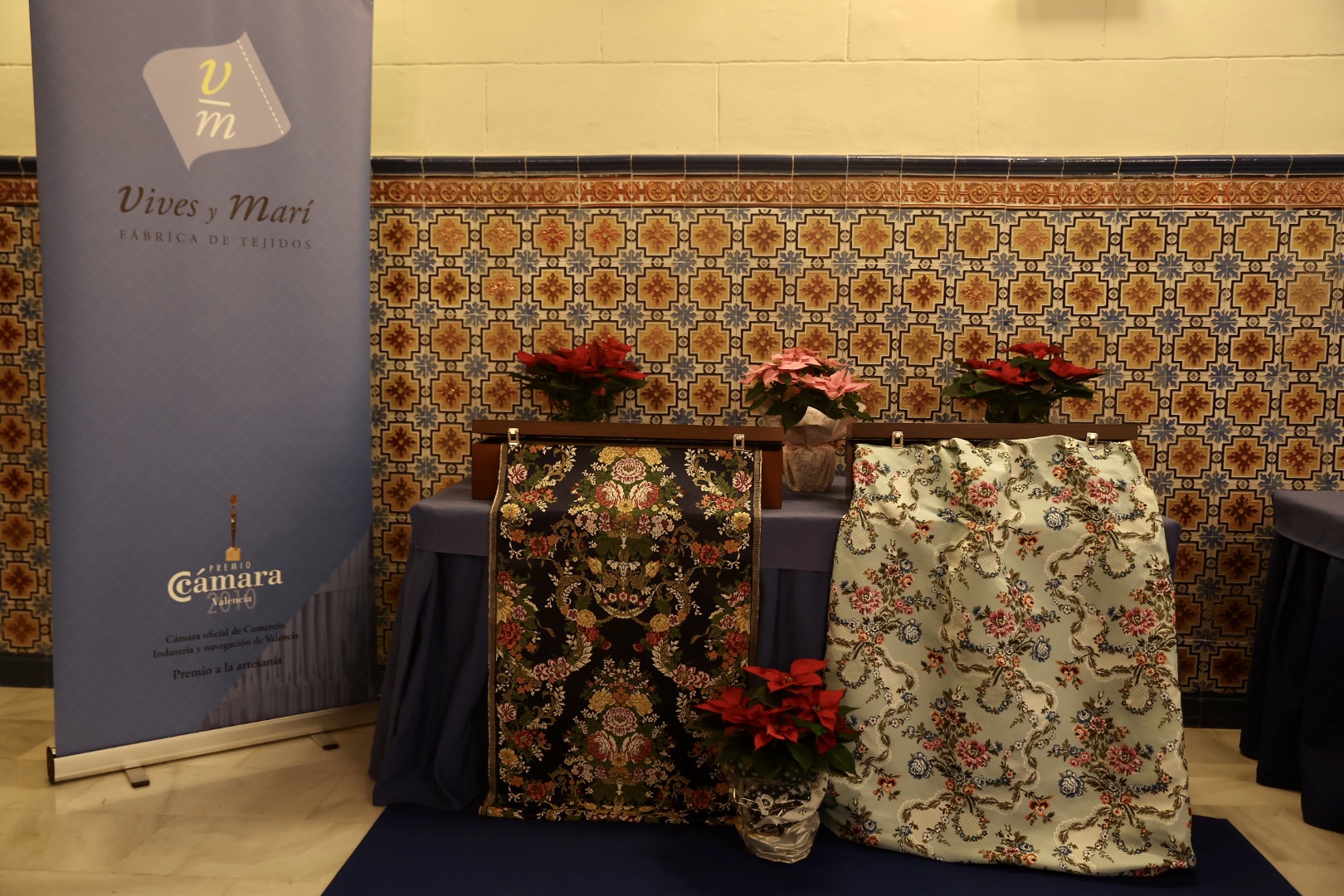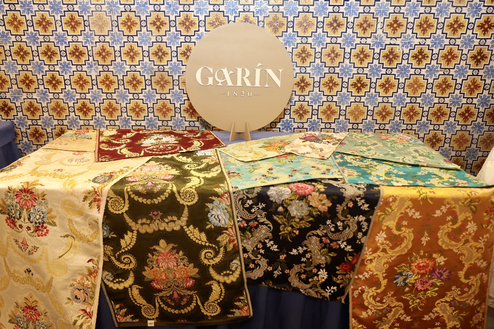 La tela del primer traje es un estrecho de seda que es una fiel reproducción de un tejido de espolín el cual ha sido cedido por nuestra amiga Estefanía de Julio y que lleva de nombre ‘Sant Marc’. Clásico tejido estrecho con metal oro y doce tramas acompañadas de una sencilla nobleza para todas las parejas. Destaca que las flores llevan tres colores cada una y un color más que es metal oro haciéndolo así un tejido muy rico. El tamaño del dibujo y las finas ramas que le acompañan hacen de este renacido espolín una tela perfecta para la Corte Infantil. Los colores elegidos han sido, para el primer traje, el lavinia, océano, musgo, dore, rose y blanco.