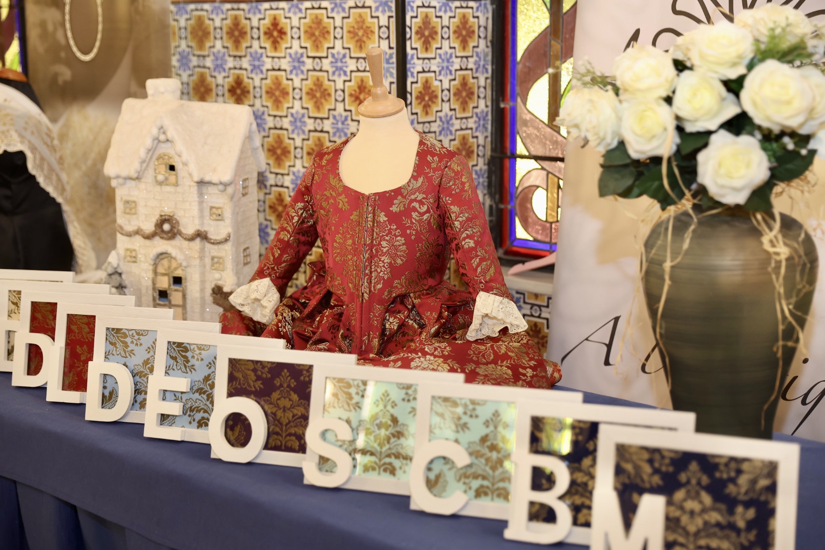 Para la tela del segundo traje se ha recuperado el tejido de brocatel de un boceto del archivo de la casa Catalá y que se ha picado a tamaño de 35 cm para adaptarlo a la Corte Infantil. La característica más importante de este tejido es que van tramados con metal oro viejo. El dibujo de nombre San Agustín se ha tejido con urdimbres de rayón natural y divididos en tres fondos claros y tres oscuros dando así un equilibrio a la colección. Los colores elegidos son el crema, granate, celeste, mora, aguamarina y marino.