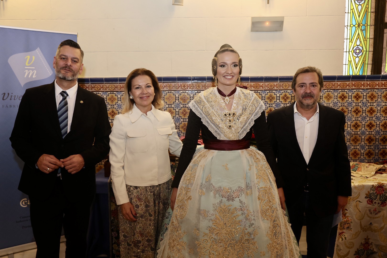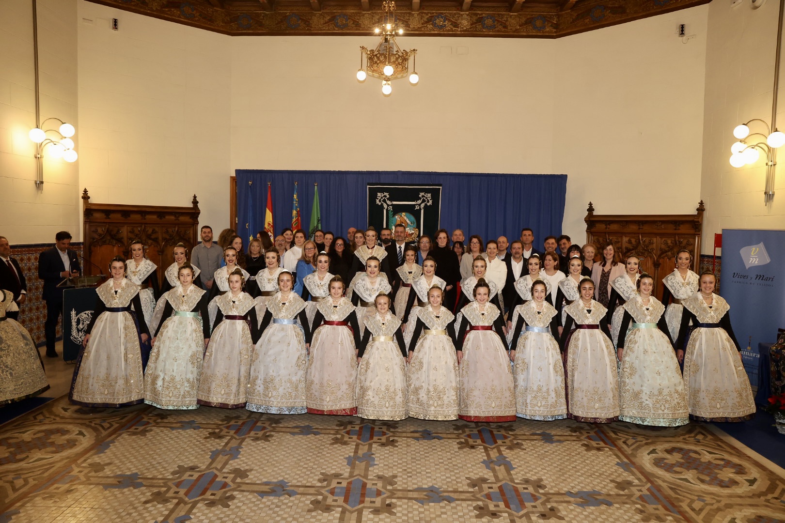 Para el primer traje de la Corte de Honor de la FMV, Vives y Marí ha apostado por el dibujo ‘Santa Sandra’ con los colores ciruela, blush, ivoire, picea, malachite y atlantis, con urdimbre de seda natural y un ancho de 0,60 centímetros. El ‘Santa Sandra’ pertenece a la colección de dibujos antiguos del archivo histórico de Vives y Marí. Se trata de un diseño “clásico”, donde destaca su gran centro floral. Está trabajado con 16 colores de trama y un metal oro para el ornamento.