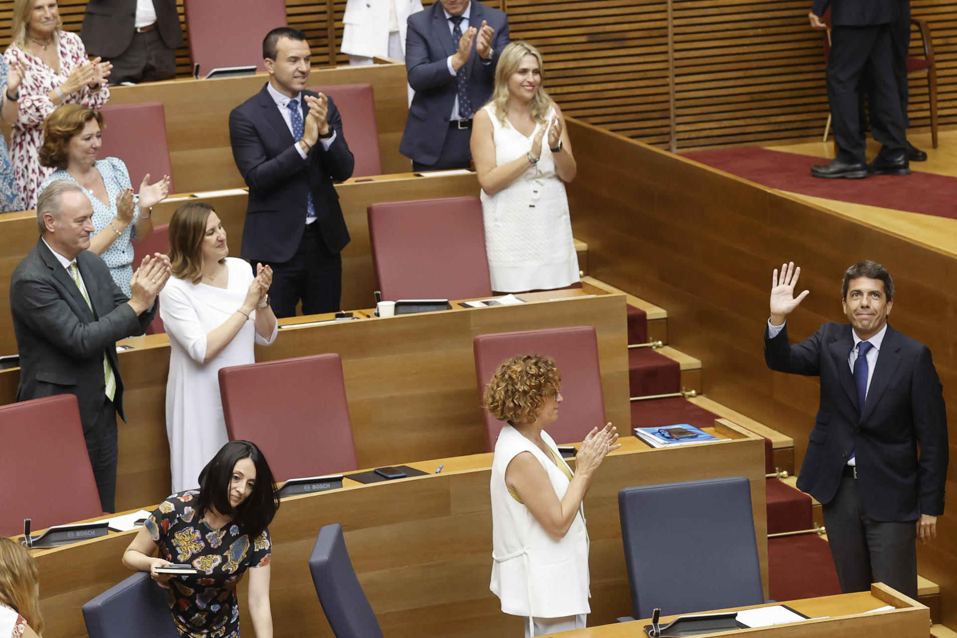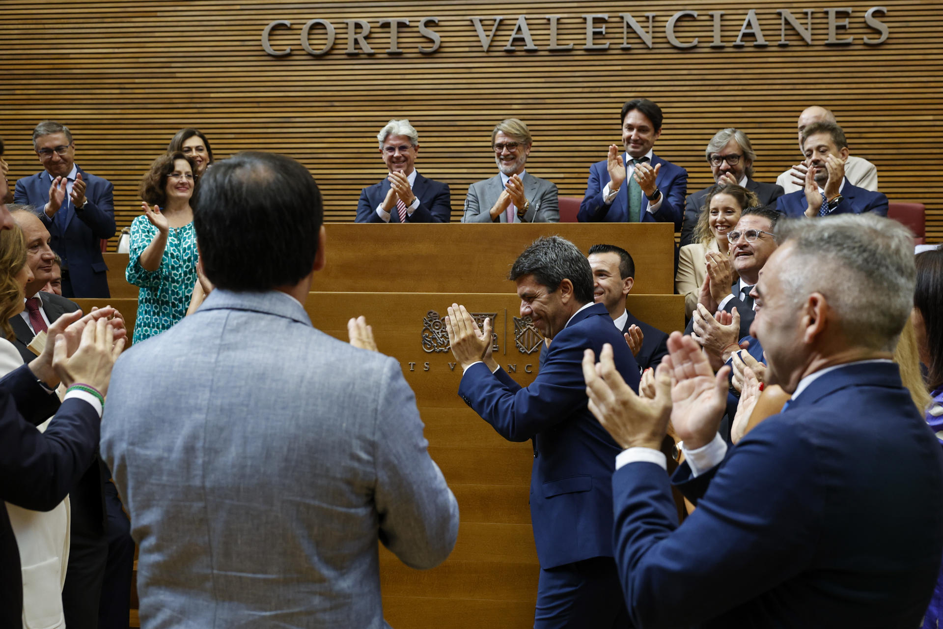 El nuevo president de la Generalitat, Carlos Mazón (PP), es aplaudido por los diputados populares tras jurar el cargo durante el pleno de toma de posesión, donde ha esbozado sus líneas de actuación para la legislatura de gobierno con Vox. EFE/Biel Aliño