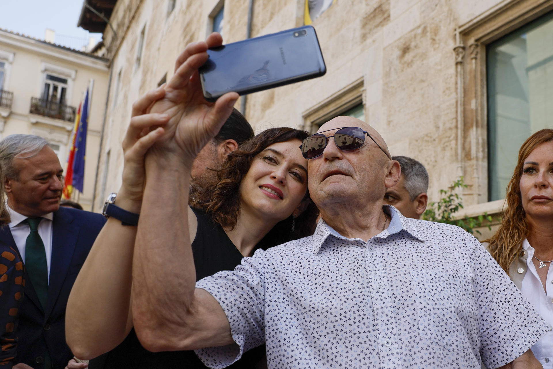 La presidenta de la Comunidad de Madrid, Isabel Díaz Ayuso, se hace una foto con un simpatizante a su salida del acto de toma de posesión del cargo del nuevo president de la Generalitat, Carlos Mazón (PP), en Les Corts Valencianes. EFE/Biel Aliño