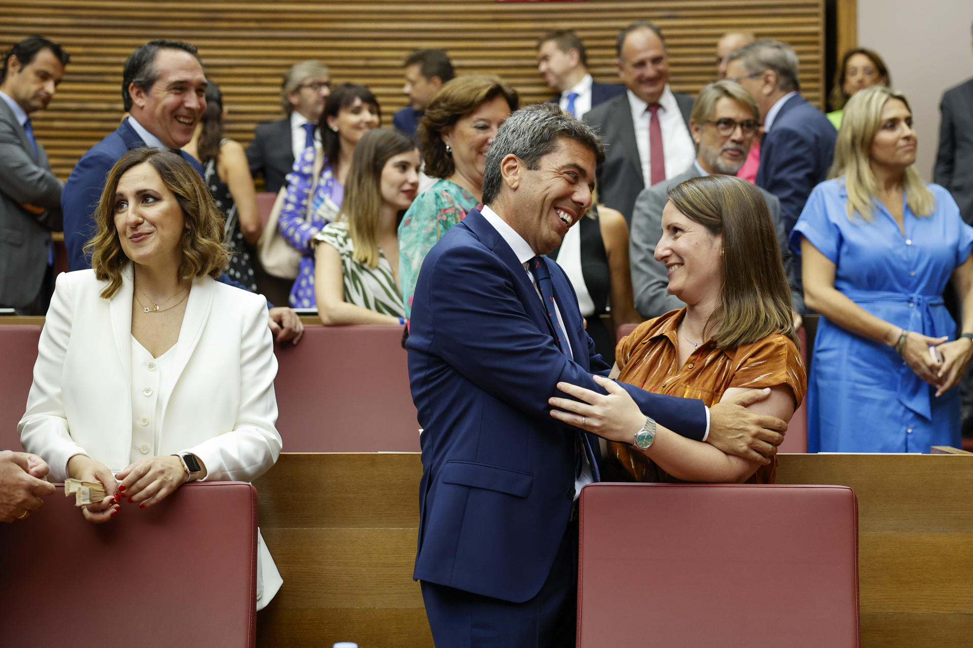 El nuevo president de la Generalitat, Carlos Mazón (PP), saluda a la portavoz del grupo parlamentario de VOX, Ana Vega (d), tras jurar el cargo durante el pleno de toma de posesión, donde ha esbozado sus líneas de actuación para la legislatura de gobierno con Vox. EFE/Biel Aliño