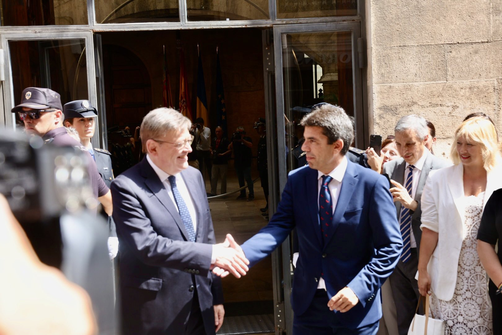 El expresident de la Generalitat, Ximo Puig (d), atiende al nuevo president, Carlos Mazón (PP), durante su intervención en el pleno de toma de posesión del cargo, donde ha esbozado sus líneas de actuación para la legislatura de gobierno con Vox ante Les Corts Valencianes. EFE/Biel Aliño