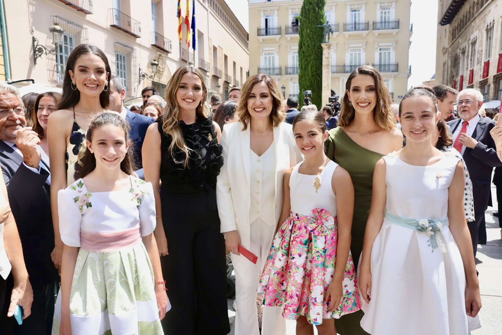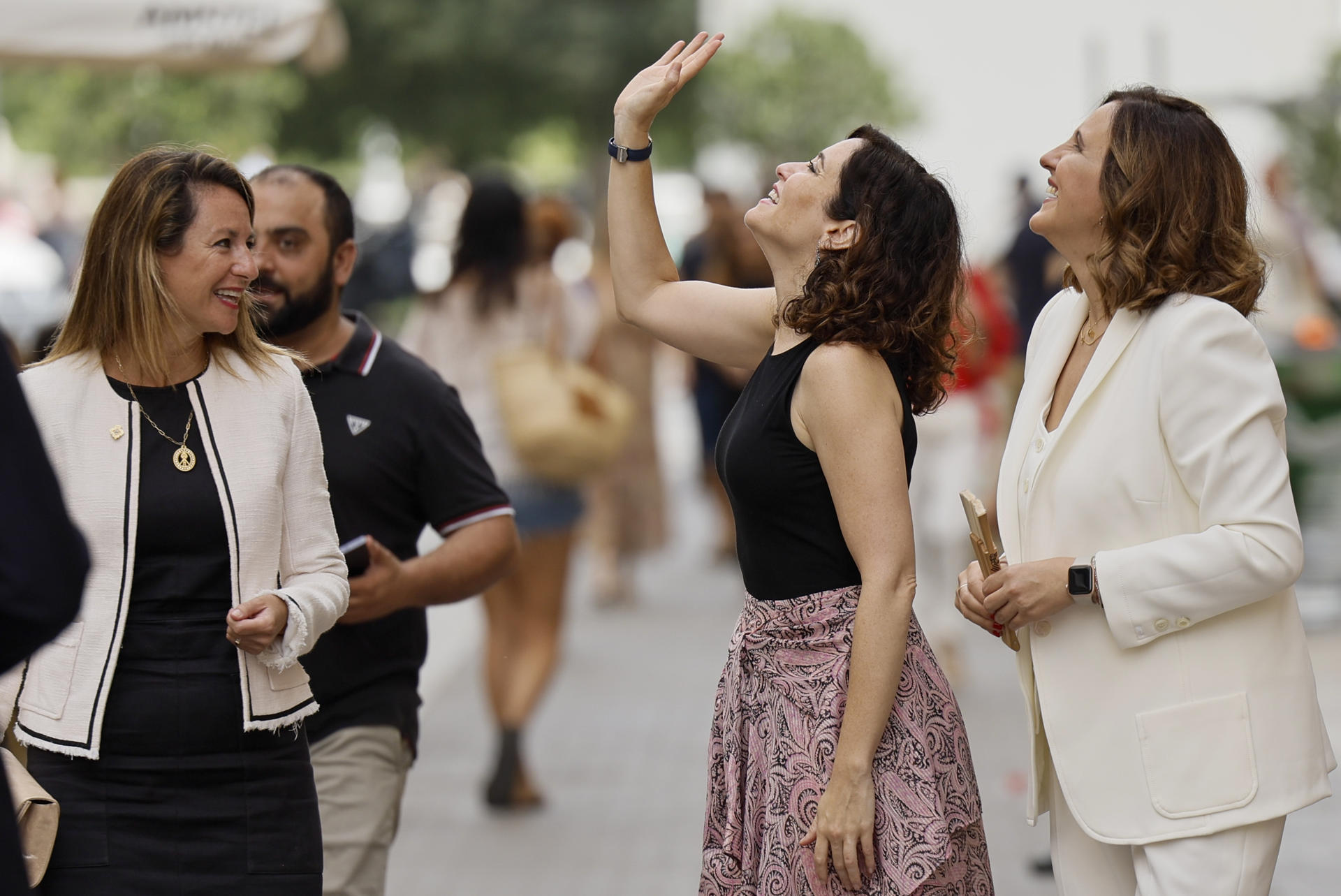 La presidenta de la Comunidad de Madrid, Isabel Díaz Ayuso (c), junto a la alcaldesa de València, María José Catalá (d), a su llegada al acto de toma de posesión del cargo del nuevo president de la Generalitat, Carlos Mazón (PP). EFE/Biel Aliño