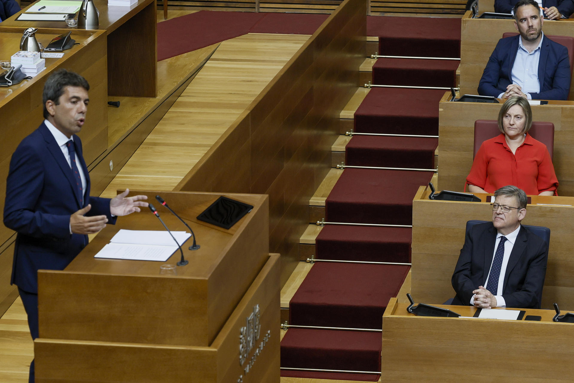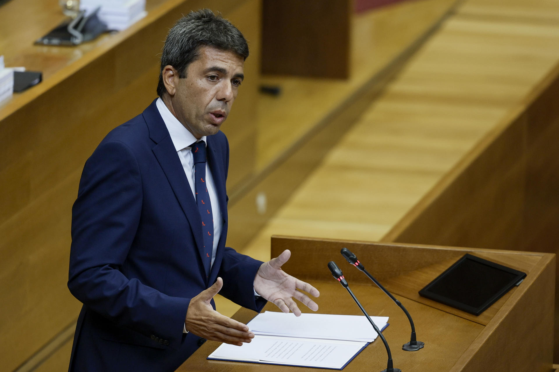 El nuevo president de la Generalitat, Carlos Mazón (PP), durante su intervención en el pleno de toma de posesión del cargo. EFE/Biel Aliño