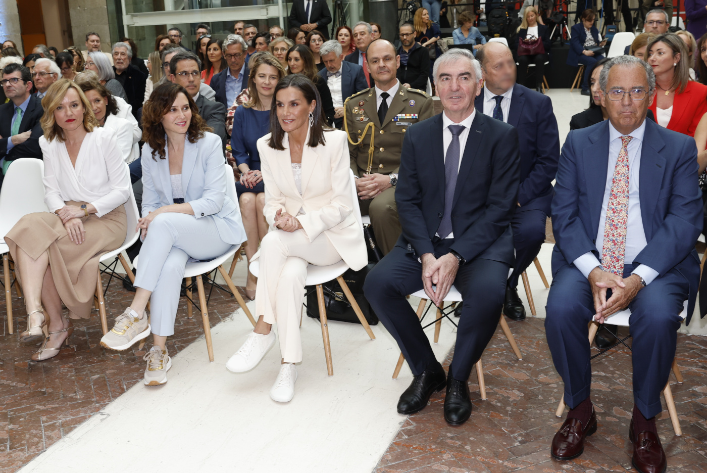 En este evento, la presidenta de la Comunidad de Madrid, Isabel Díaz Ayuso, también demostró un gesto de solidaridad al adoptar un atuendo similar en cuanto al calzado, luciendo un traje azul bebé combinado con zapatillas deportivas. Isabel lo conjuntó con un traje de dos piezas de chaqueta clásica con escote en pico y pantalones de tiro alto de Zara. Esta elección no es casual, ya que parece que es uno de los atuendos en los que confía para momentos importantes. Este gesto simboliza un momento de empatía hacia la situación de la reina Letizia, quien ha debido adaptar su vestimenta debido a su lesión.