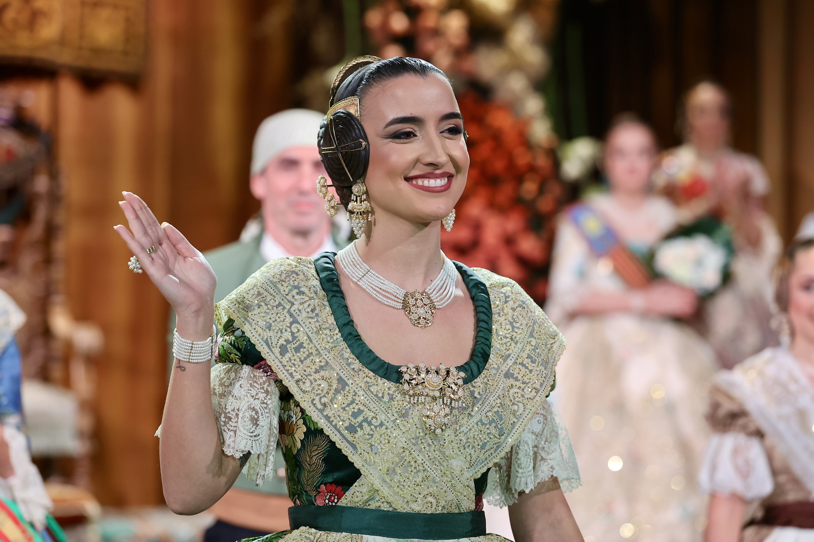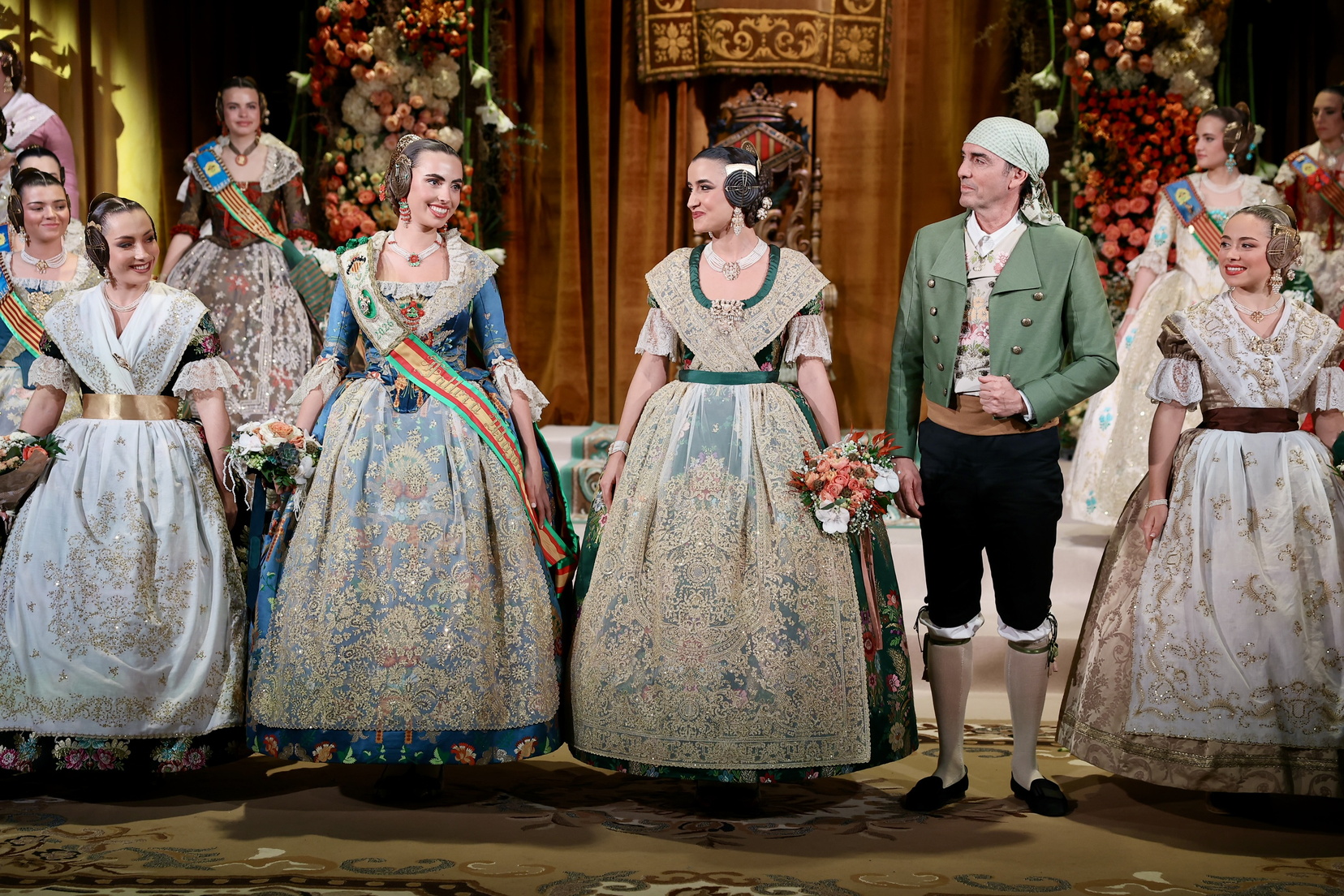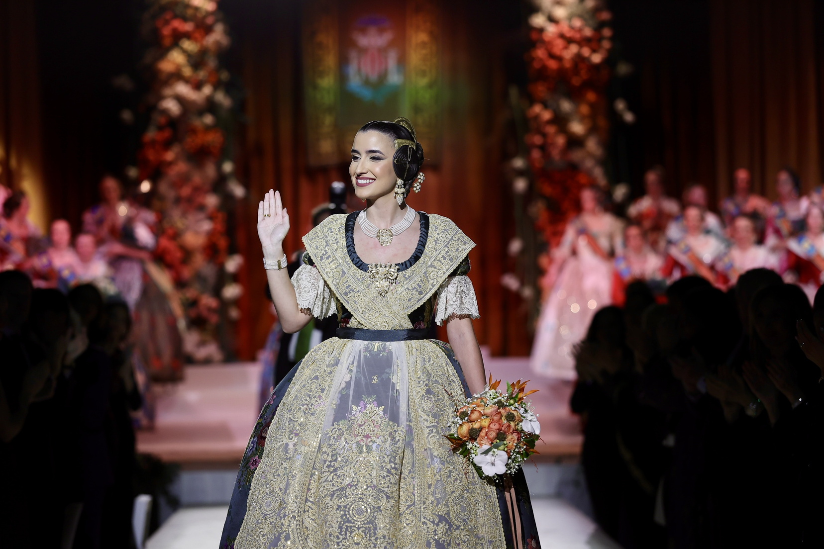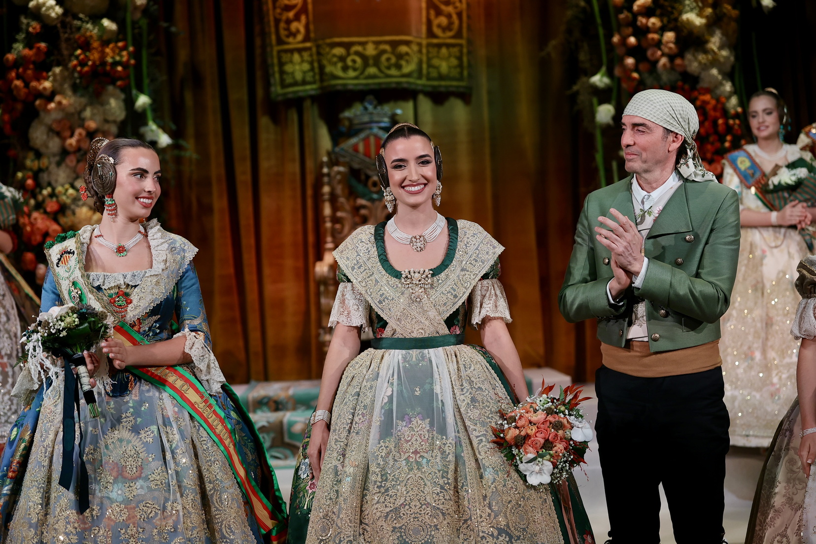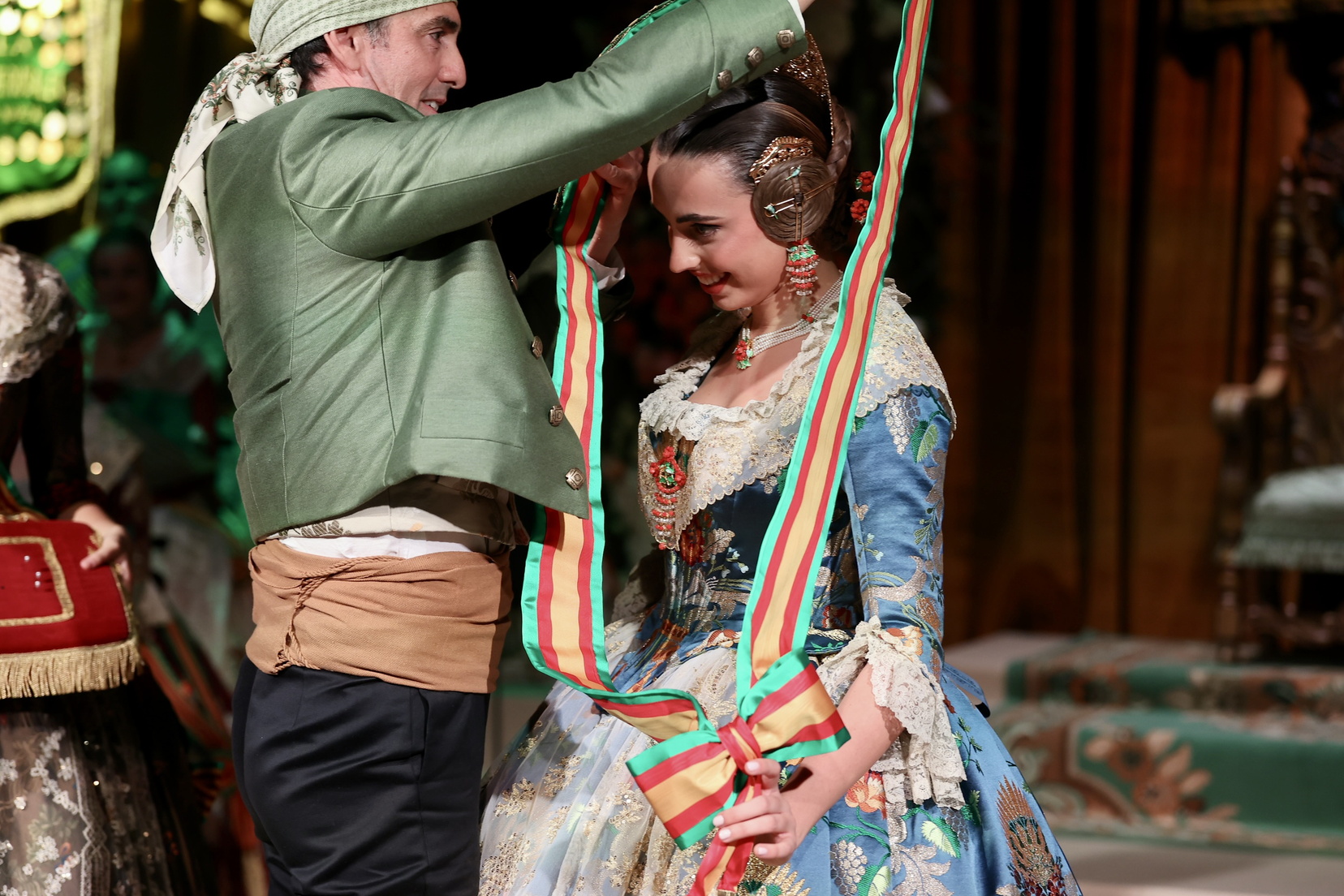 Uno de los momentos más esperados de la noche fue el descubrimiento del traje. Juana Paula Centeno Roig lució un espolín Soto de color azul, confeccionado por Amparo Fabra, acompañado de un aderezo firmado por Vicente Gracia. Una elección que combinó tradición, elegancia y artesanía valenciana en una de las piezas más simbólicas del acto.