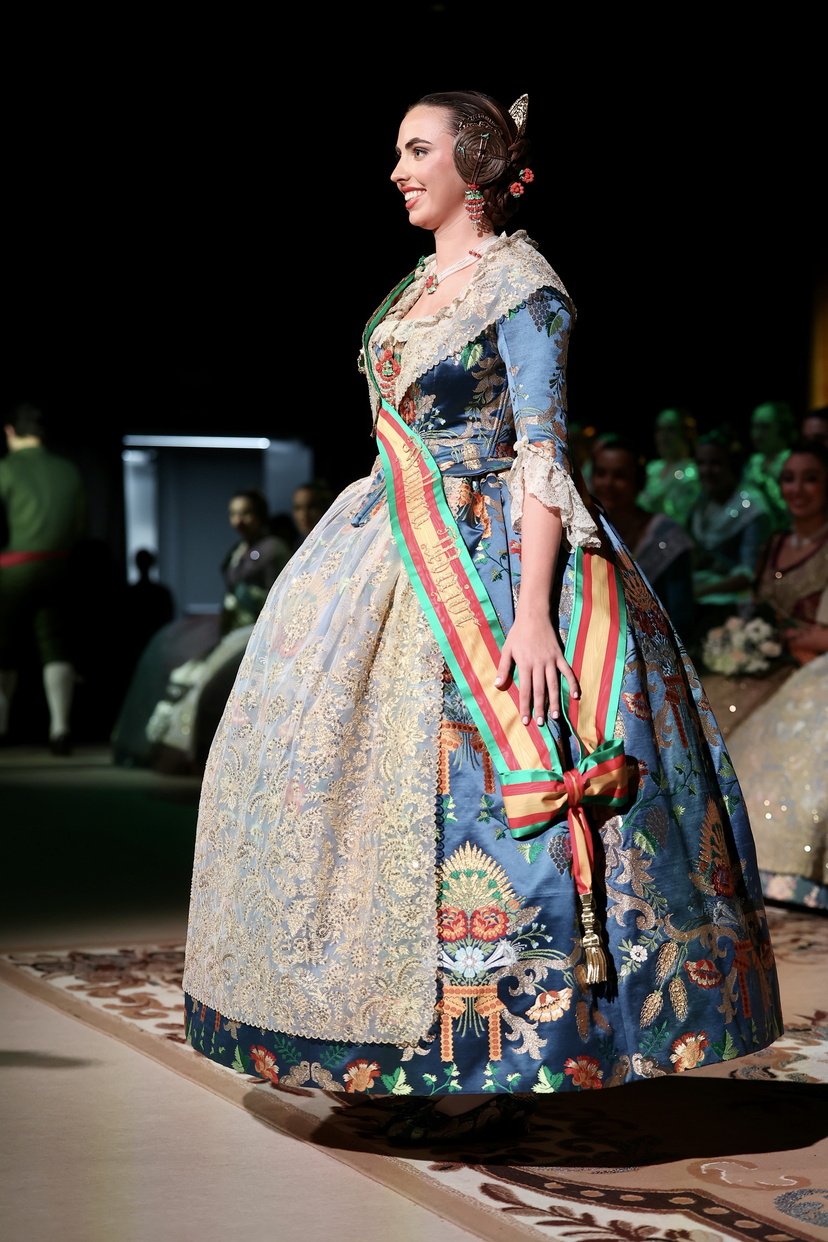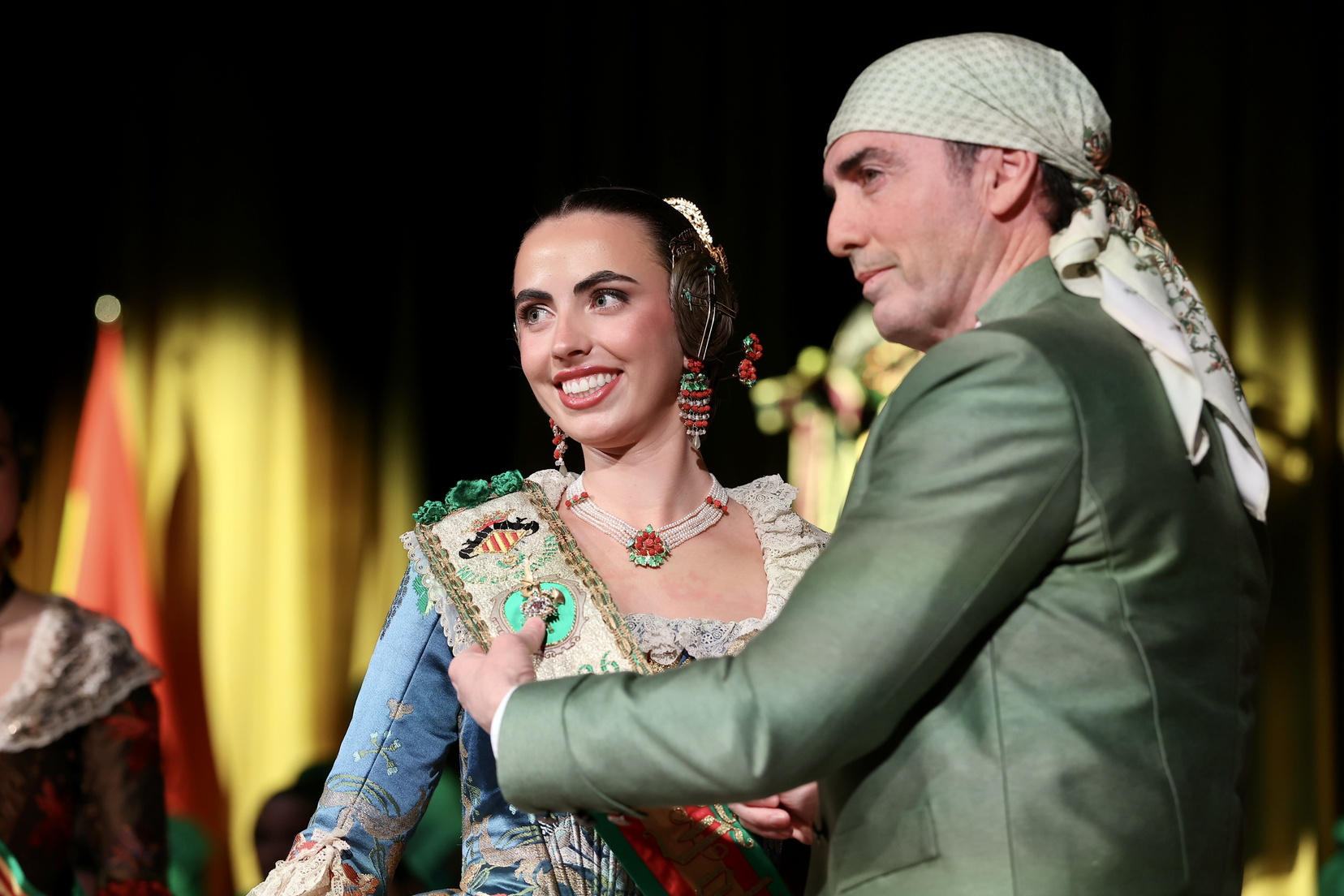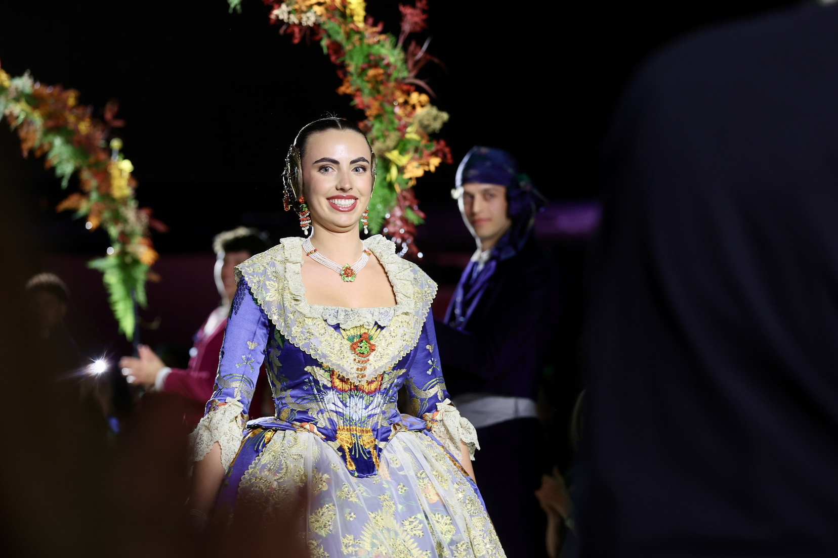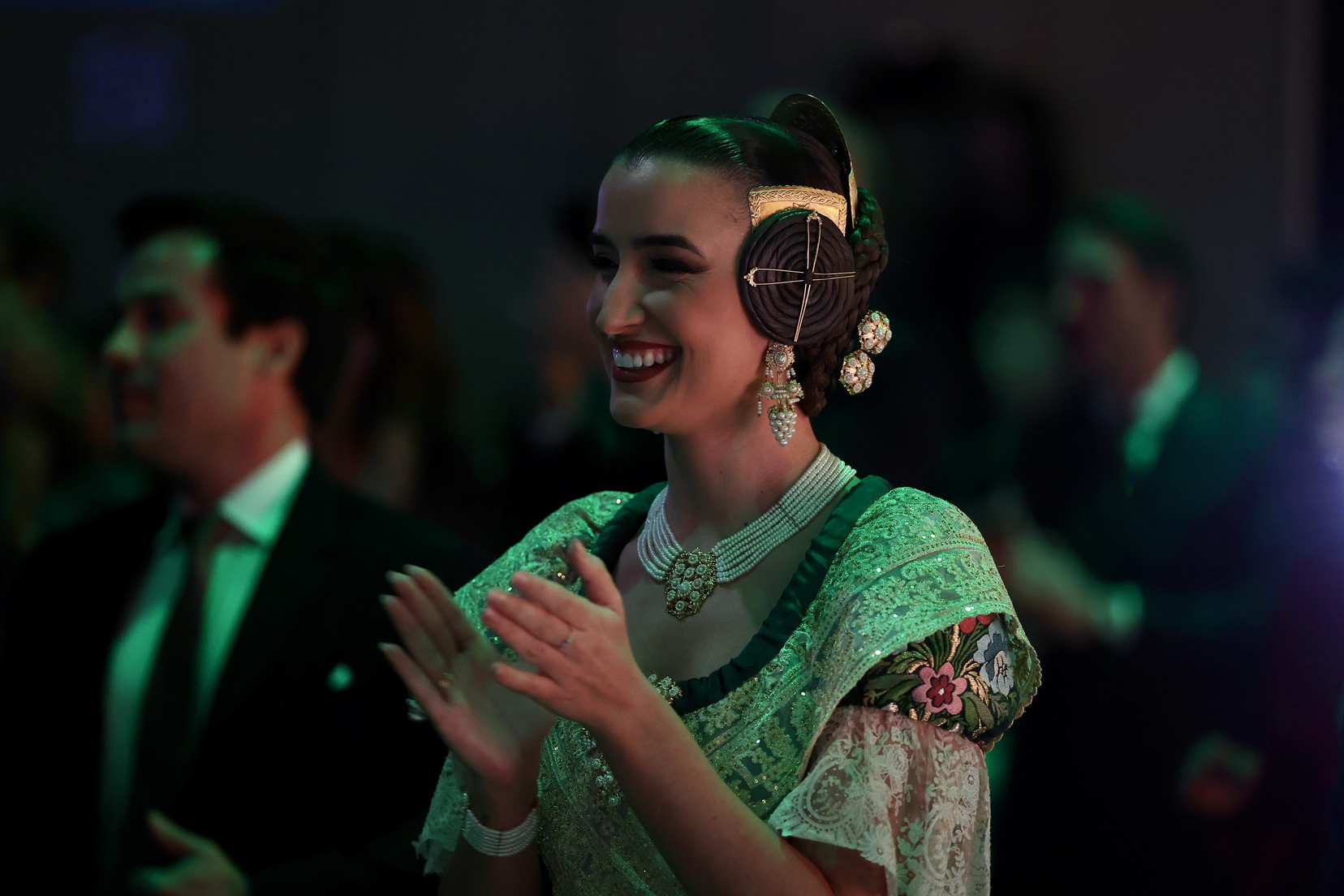 Uno de los momentos más esperados de la noche fue el descubrimiento del traje. Juana Paula Centeno Roig lució un espolín Soto de color azul, confeccionado por Amparo Fabra, acompañado de un aderezo firmado por Vicente Gracia. Una elección que combinó tradición, elegancia y artesanía valenciana en una de las piezas más simbólicas del acto.