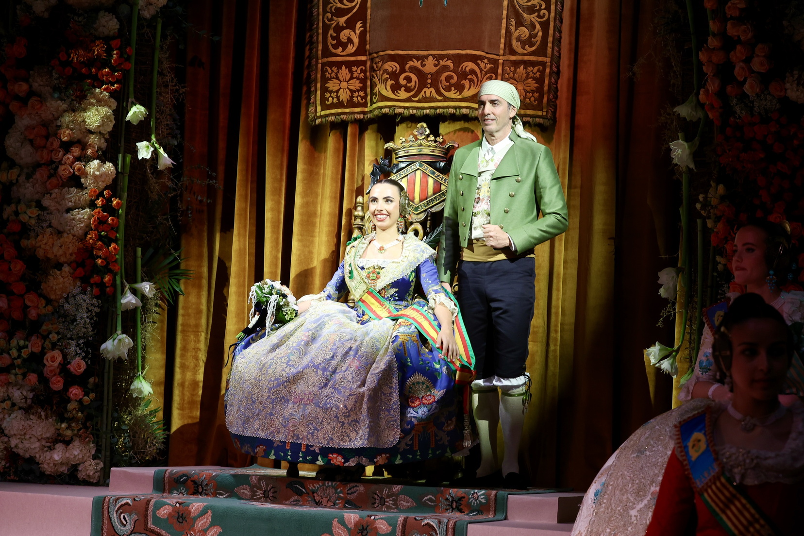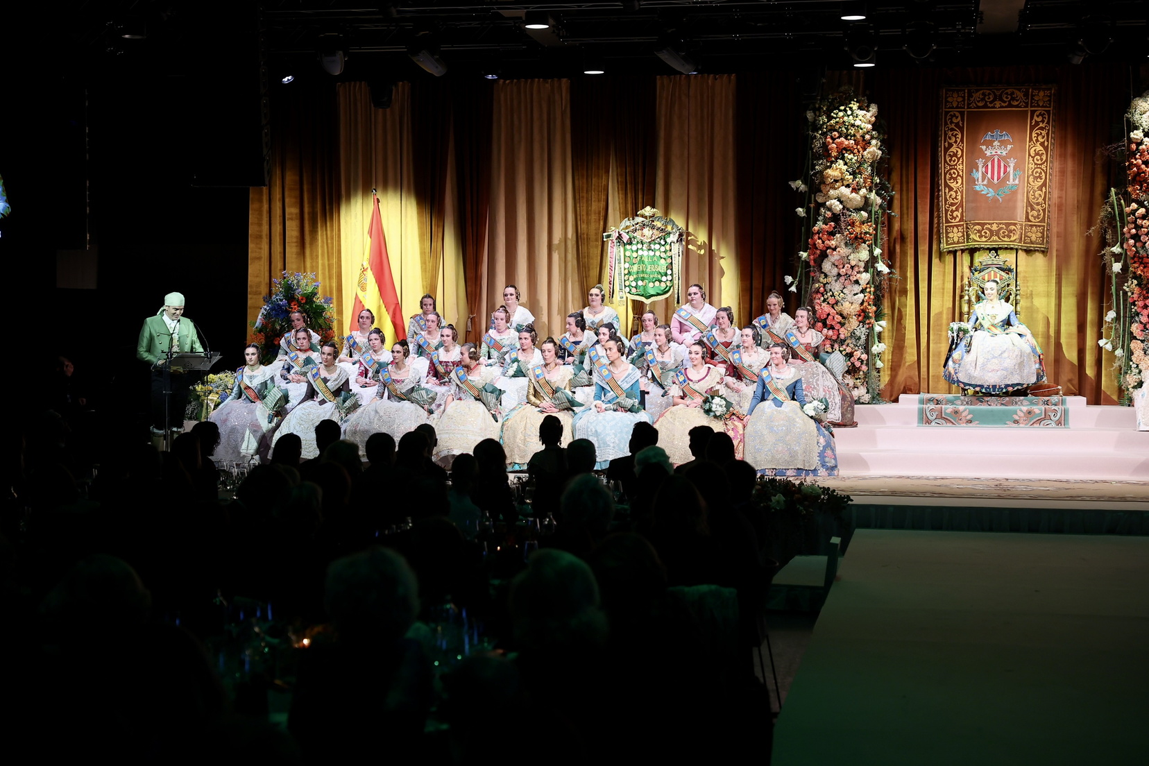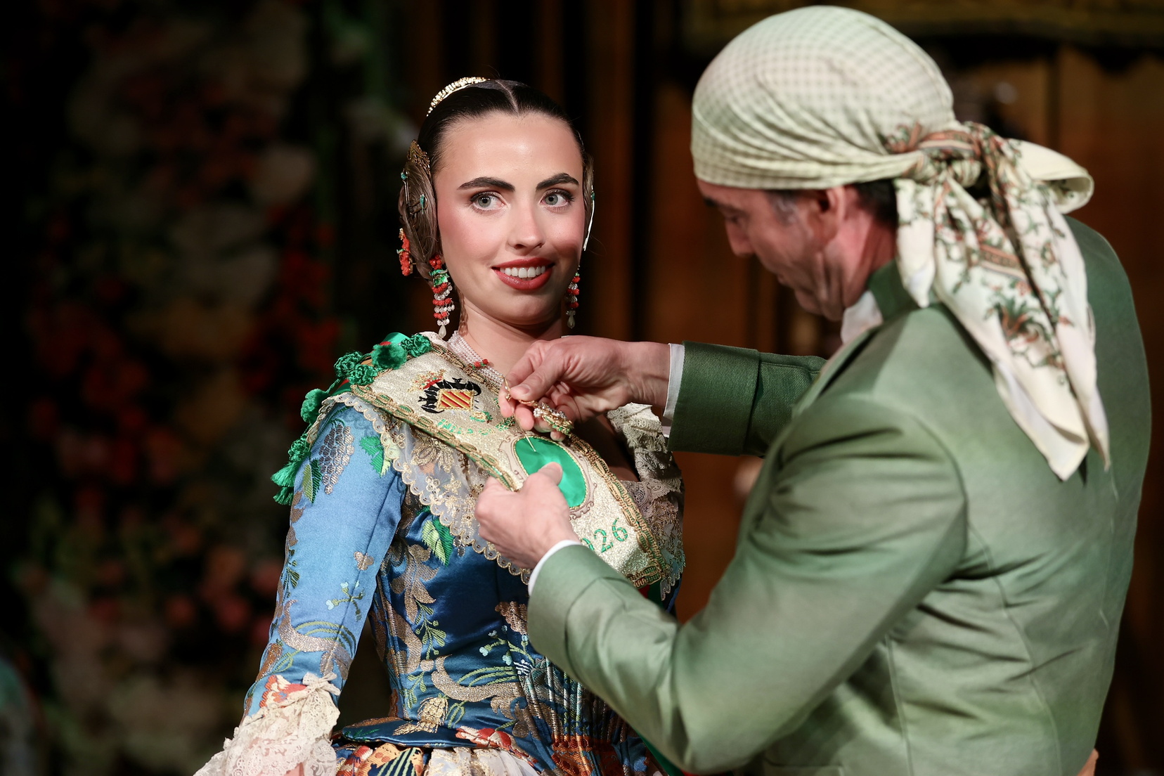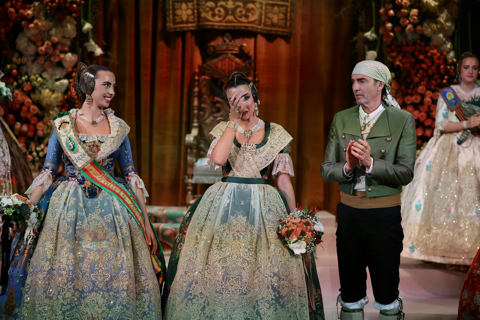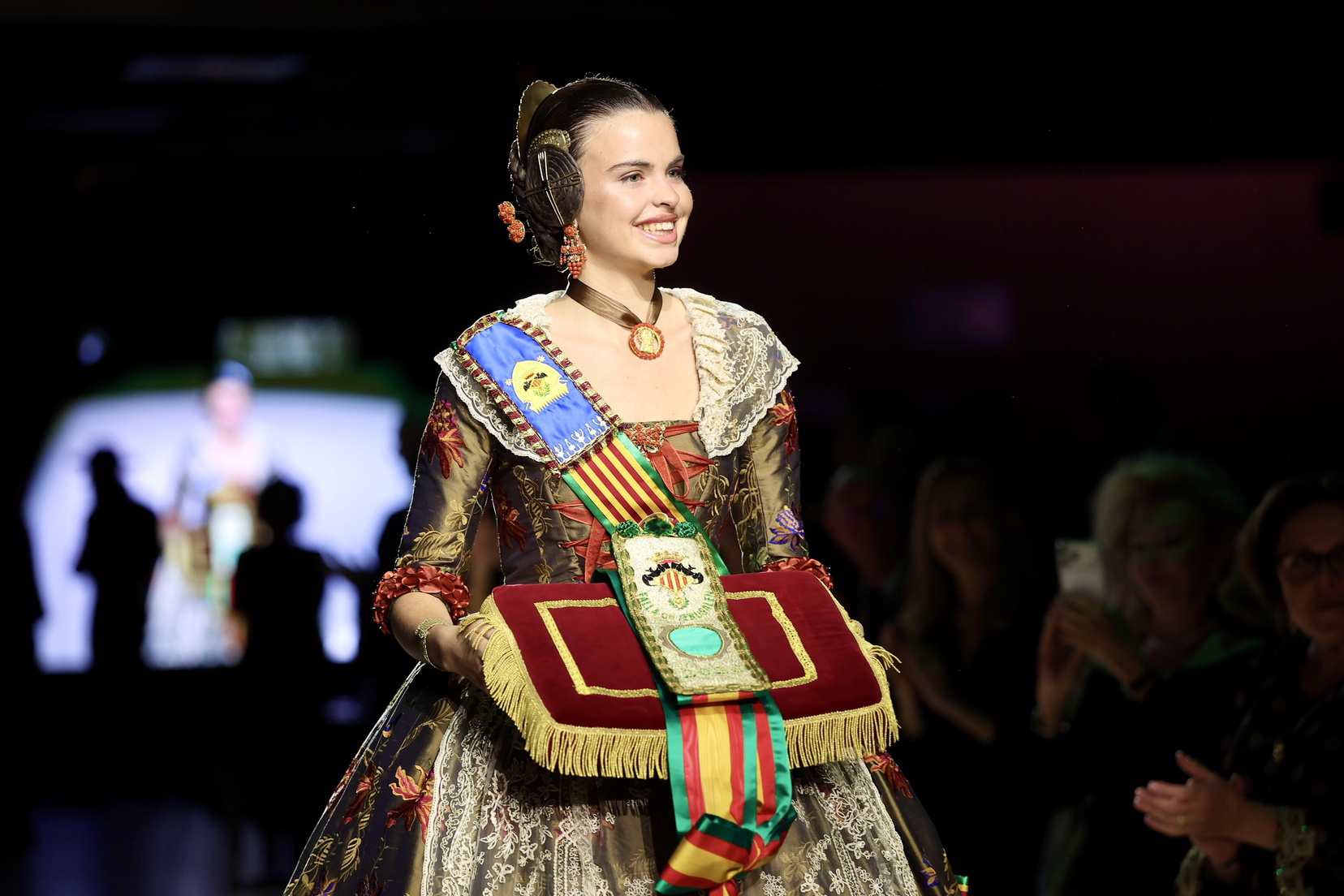 Uno de los momentos más esperados de la noche fue el descubrimiento del traje. Juana Paula Centeno Roig lució un espolín Soto de color azul, confeccionado por Amparo Fabra, acompañado de un aderezo firmado por Vicente Gracia. Una elección que combinó tradición, elegancia y artesanía valenciana en una de las piezas más simbólicas del acto.