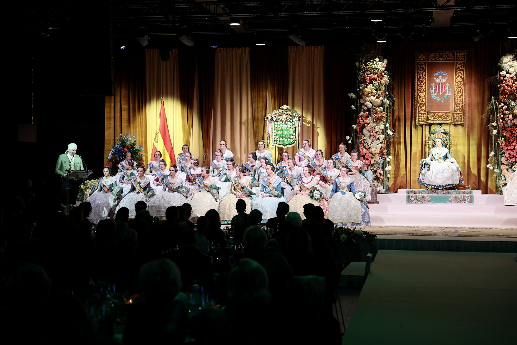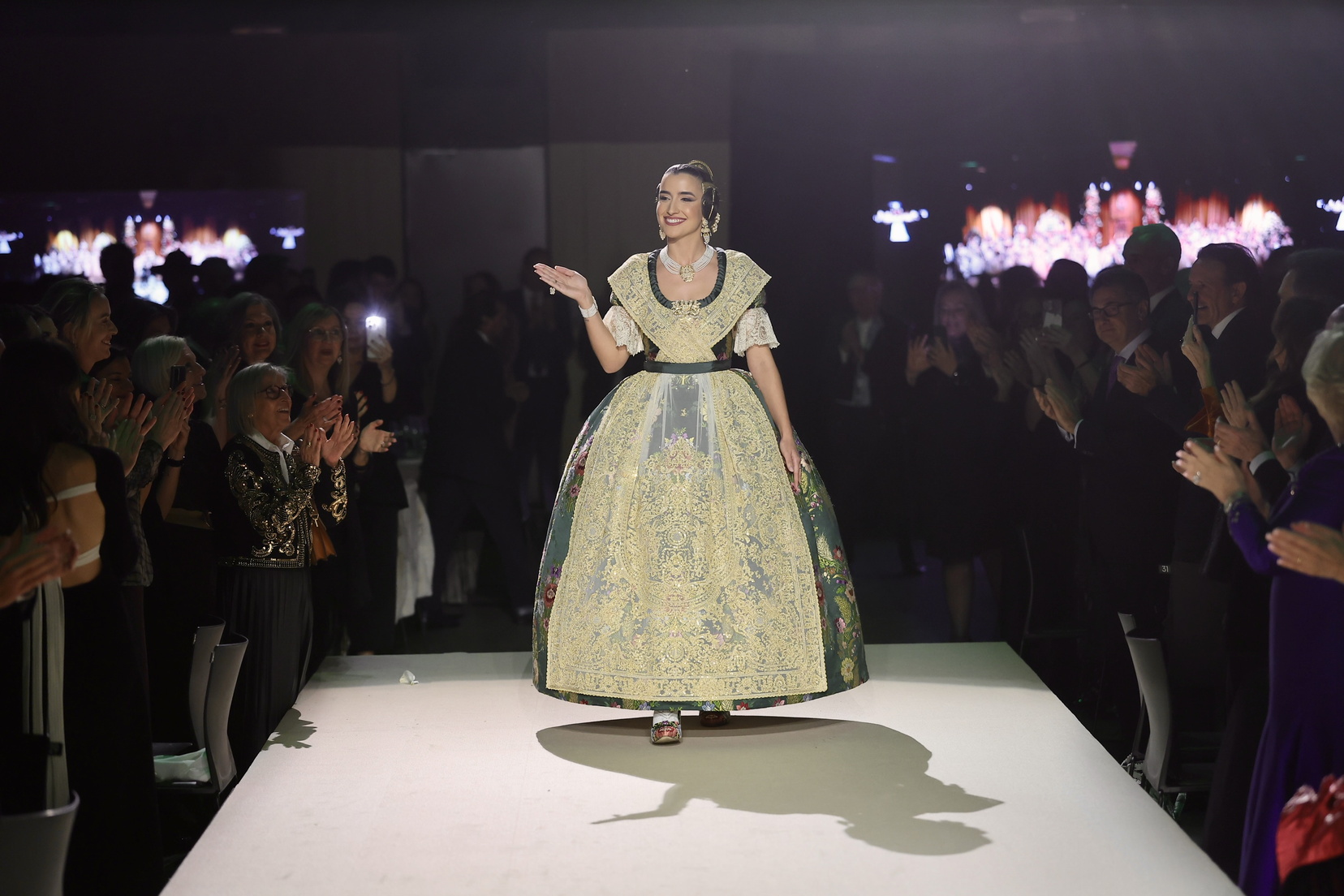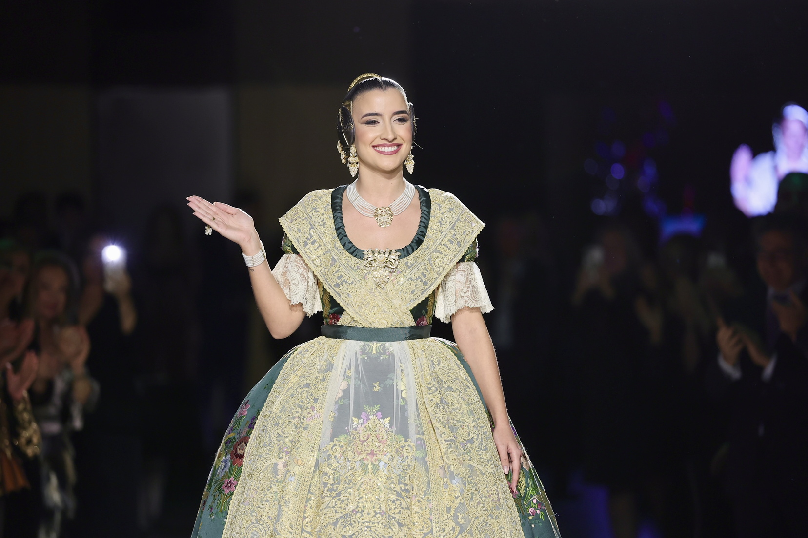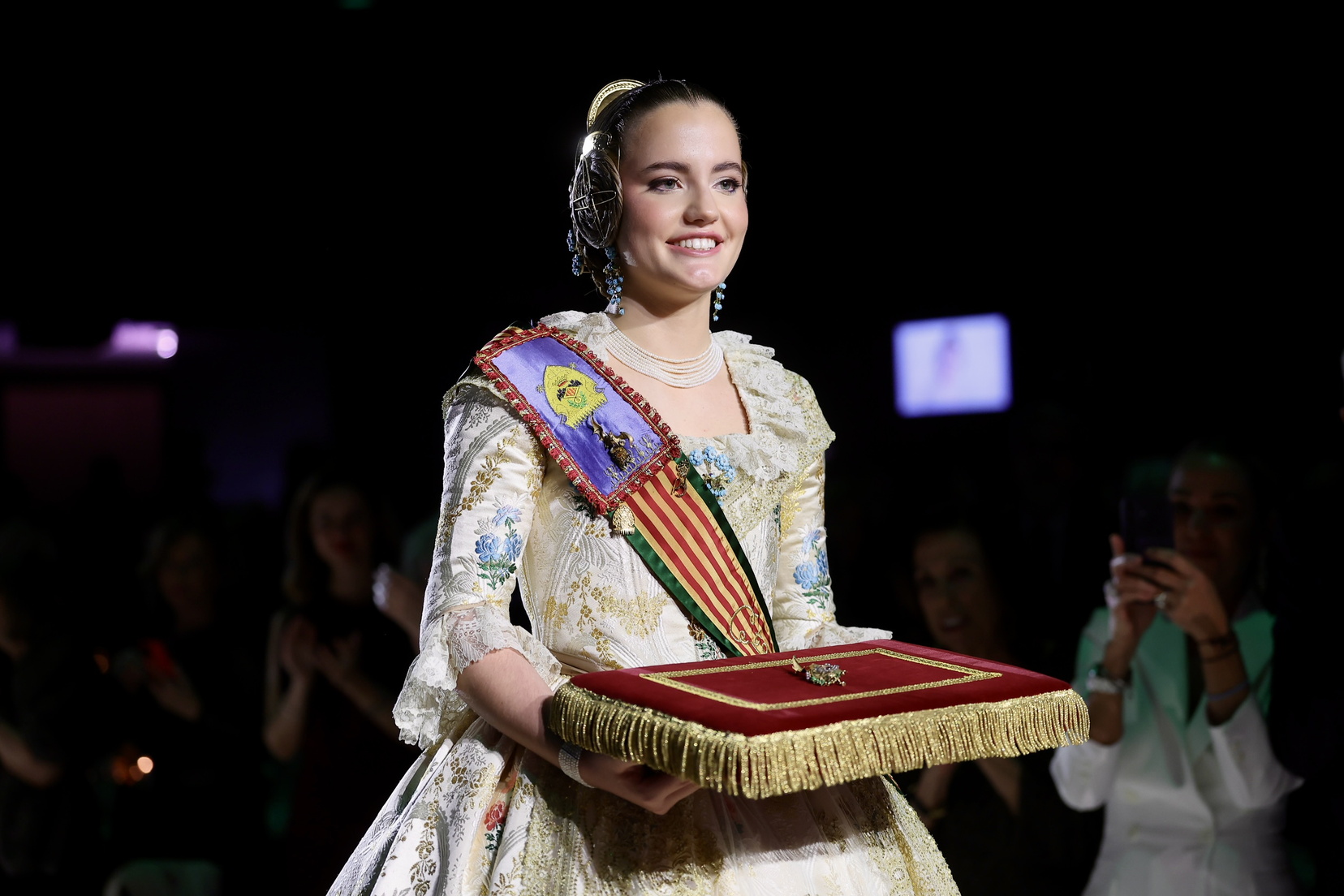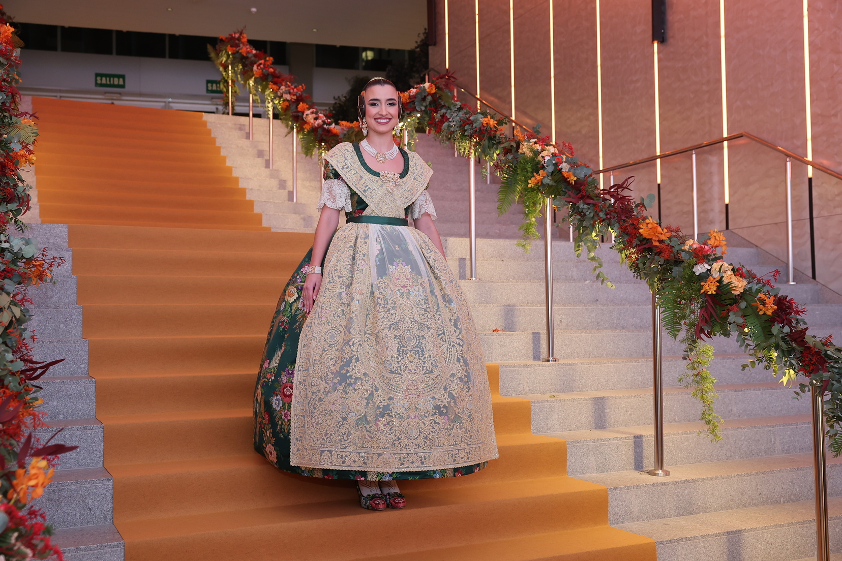 Uno de los momentos más esperados de la noche fue el descubrimiento del traje. Juana Paula Centeno Roig lució un espolín Soto de color azul, confeccionado por Amparo Fabra, acompañado de un aderezo firmado por Vicente Gracia. Una elección que combinó tradición, elegancia y artesanía valenciana en una de las piezas más simbólicas del acto.