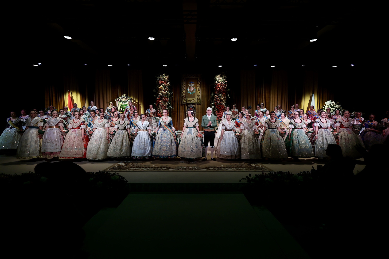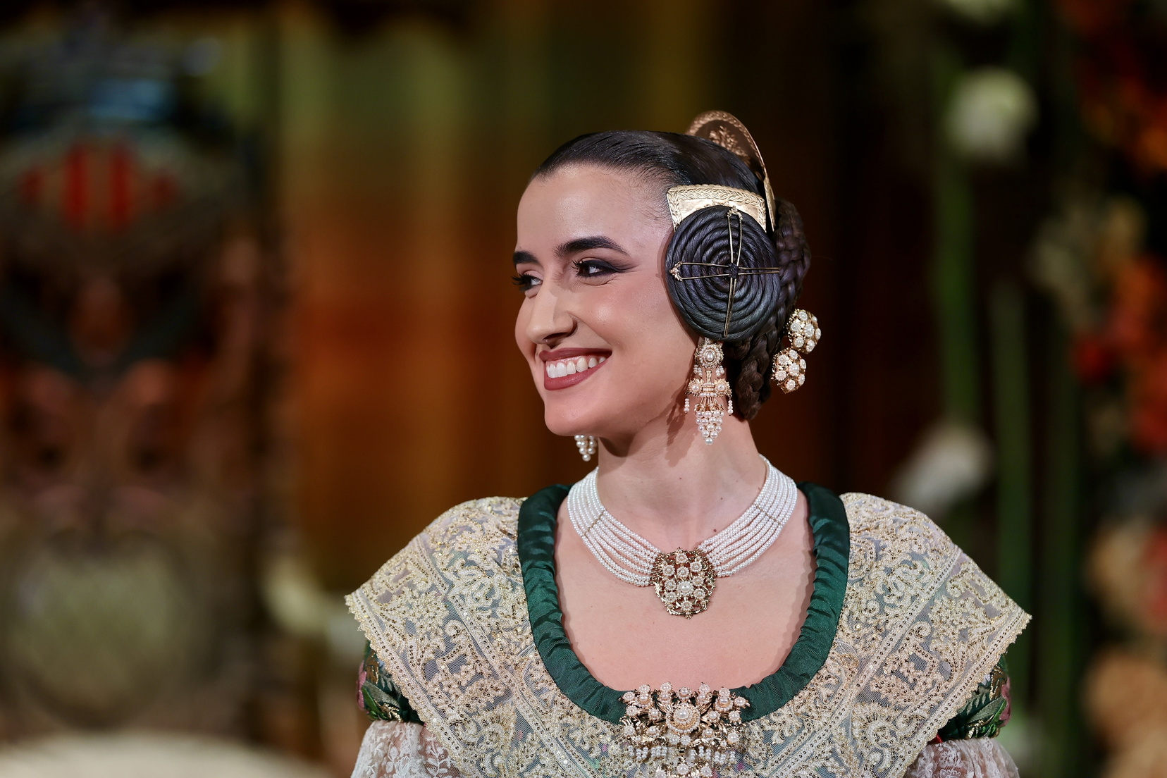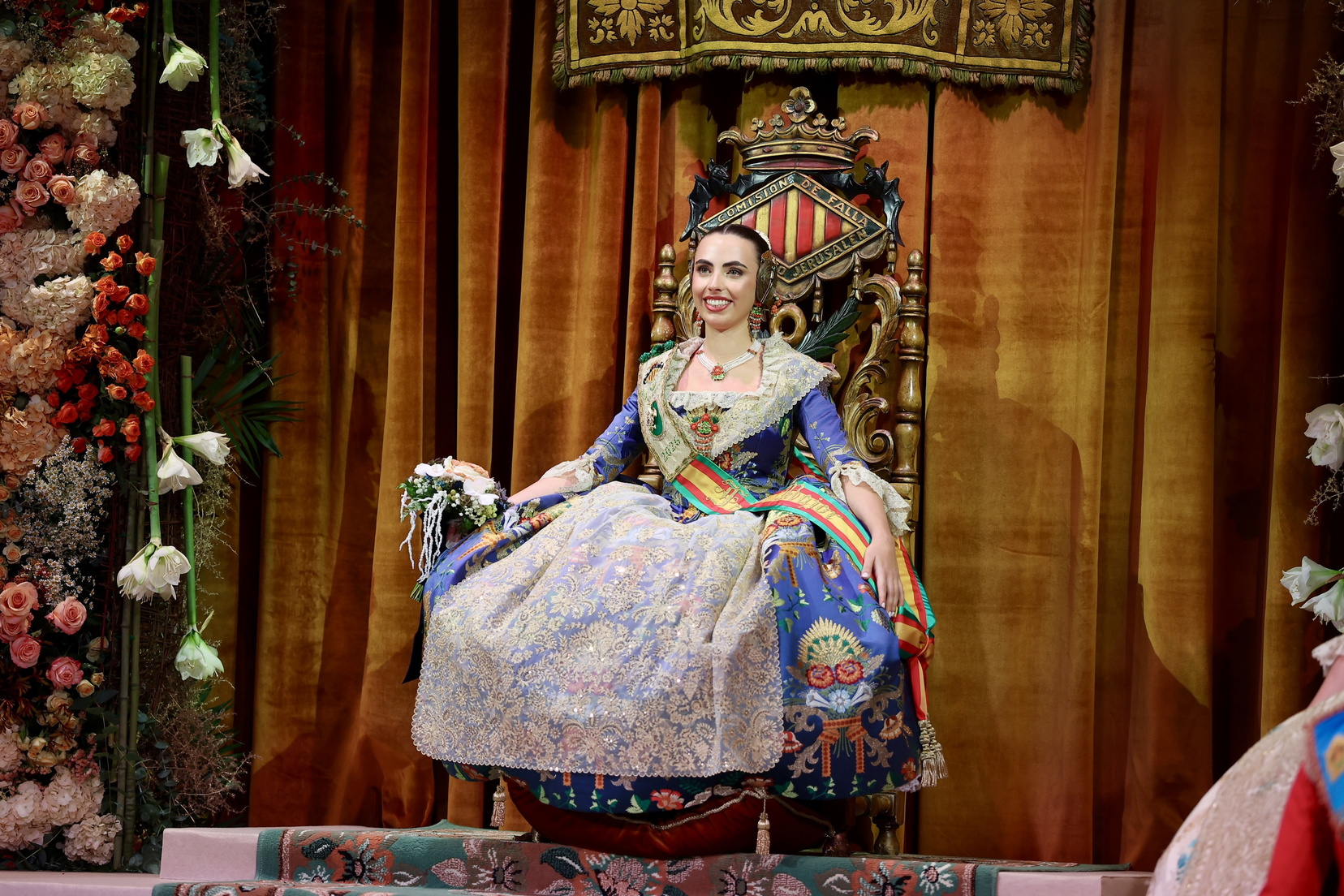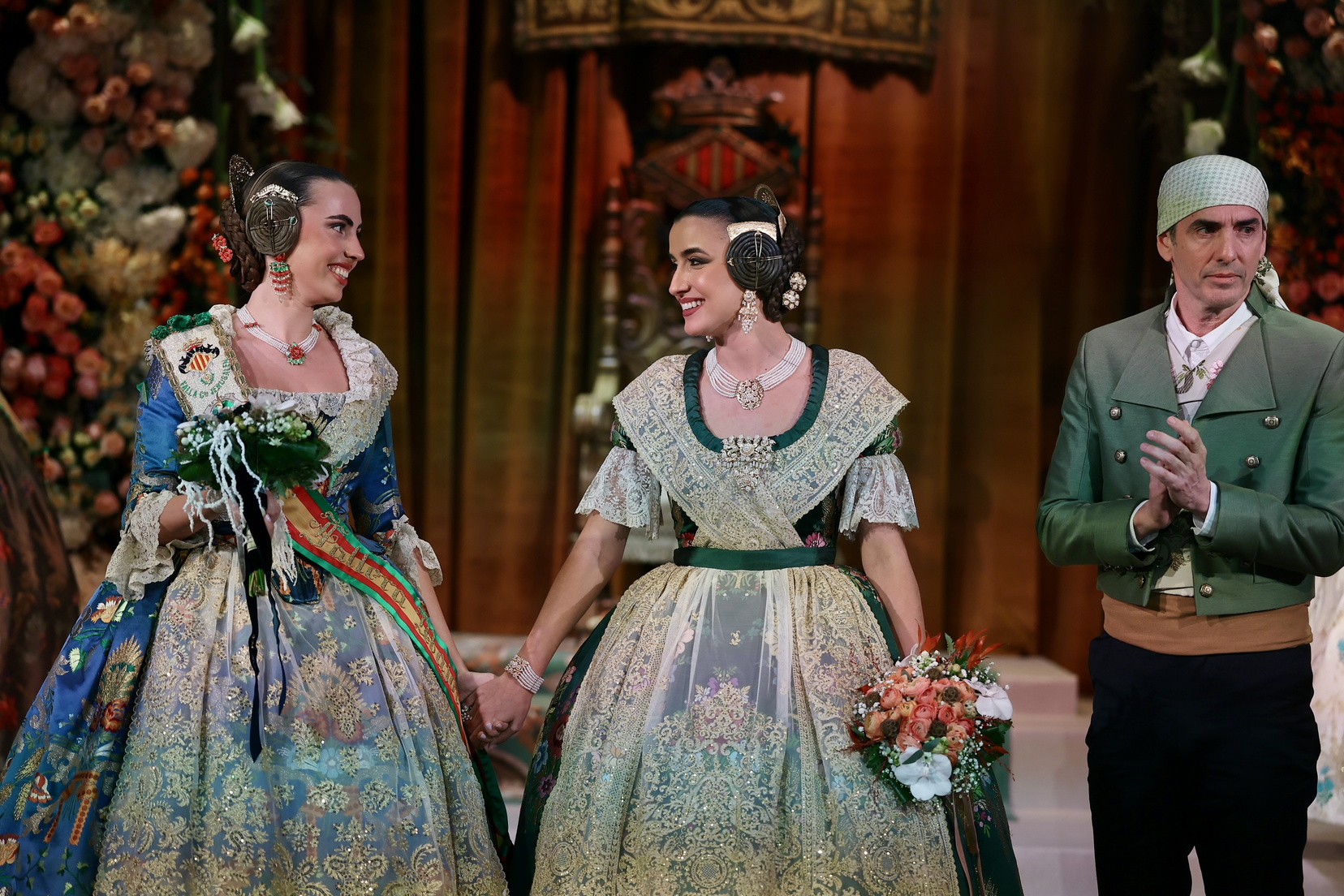 Uno de los momentos más esperados de la noche fue el descubrimiento del traje. Juana Paula Centeno Roig lució un espolín Soto de color azul, confeccionado por Amparo Fabra, acompañado de un aderezo firmado por Vicente Gracia. Una elección que combinó tradición, elegancia y artesanía valenciana en una de las piezas más simbólicas del acto.