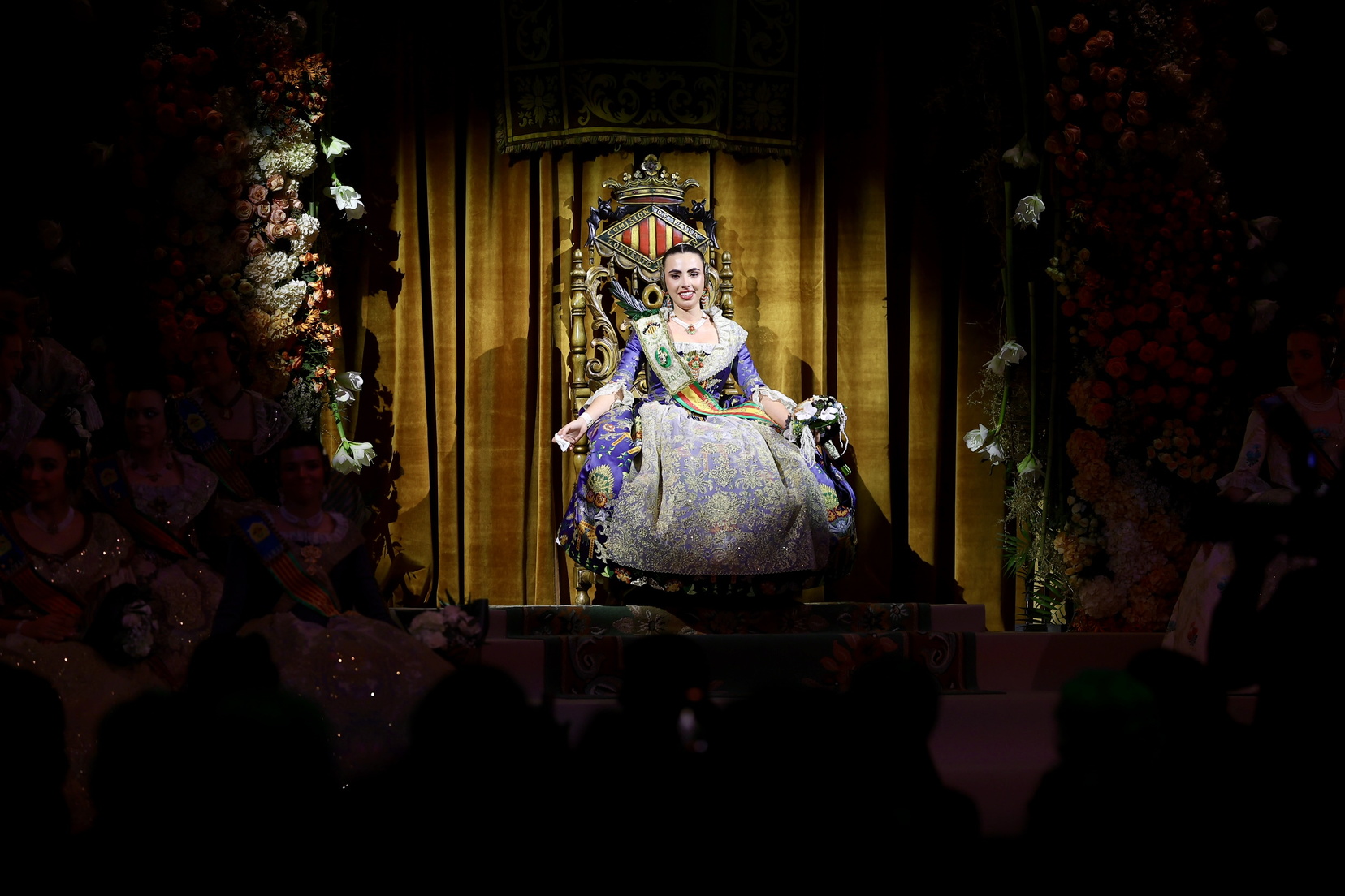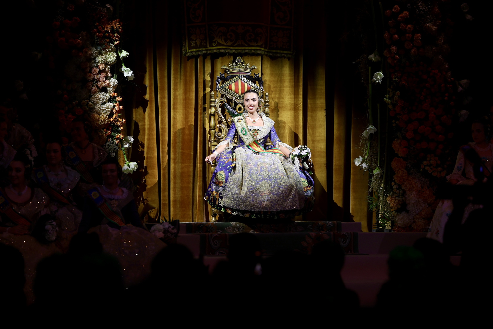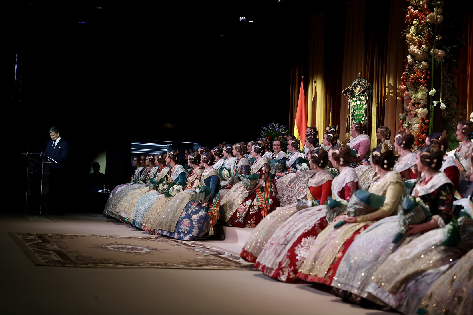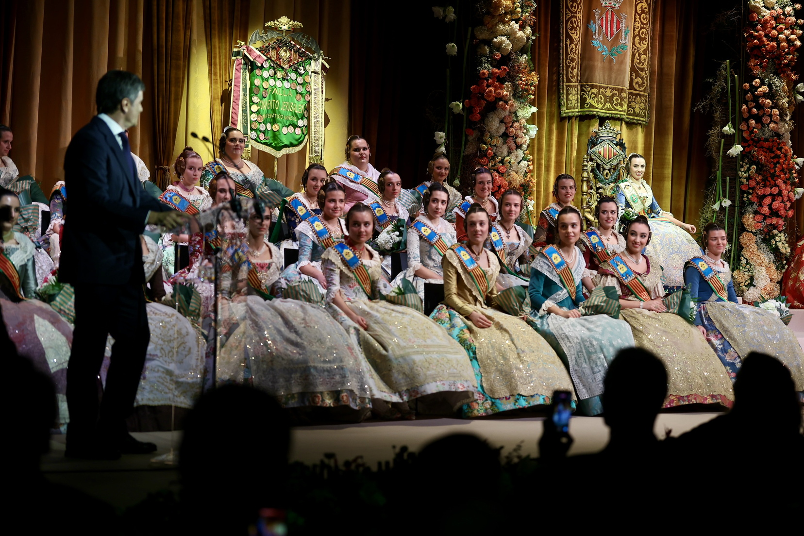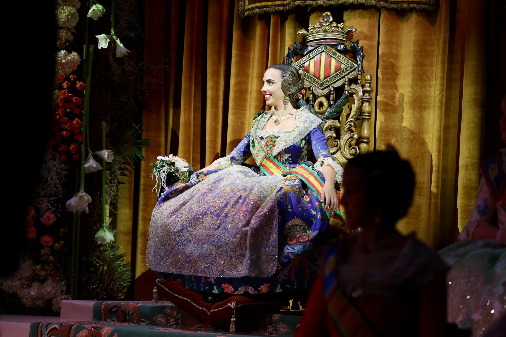 Uno de los momentos más esperados de la noche fue el descubrimiento del traje. Juana Paula Centeno Roig lució un espolín Soto de color azul, confeccionado por Amparo Fabra, acompañado de un aderezo firmado por Vicente Gracia. Una elección que combinó tradición, elegancia y artesanía valenciana en una de las piezas más simbólicas del acto.