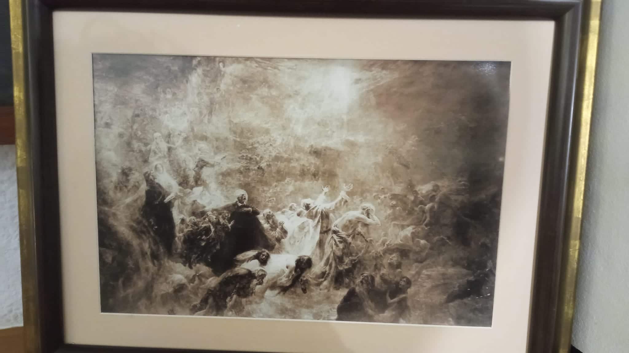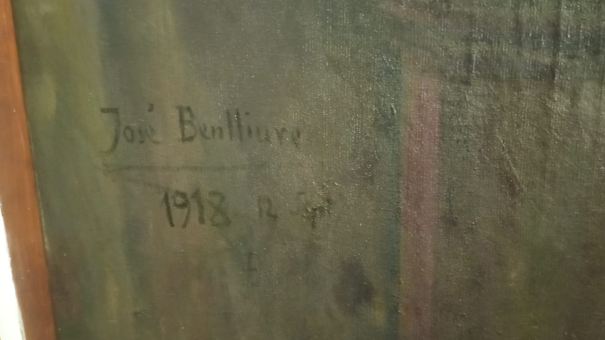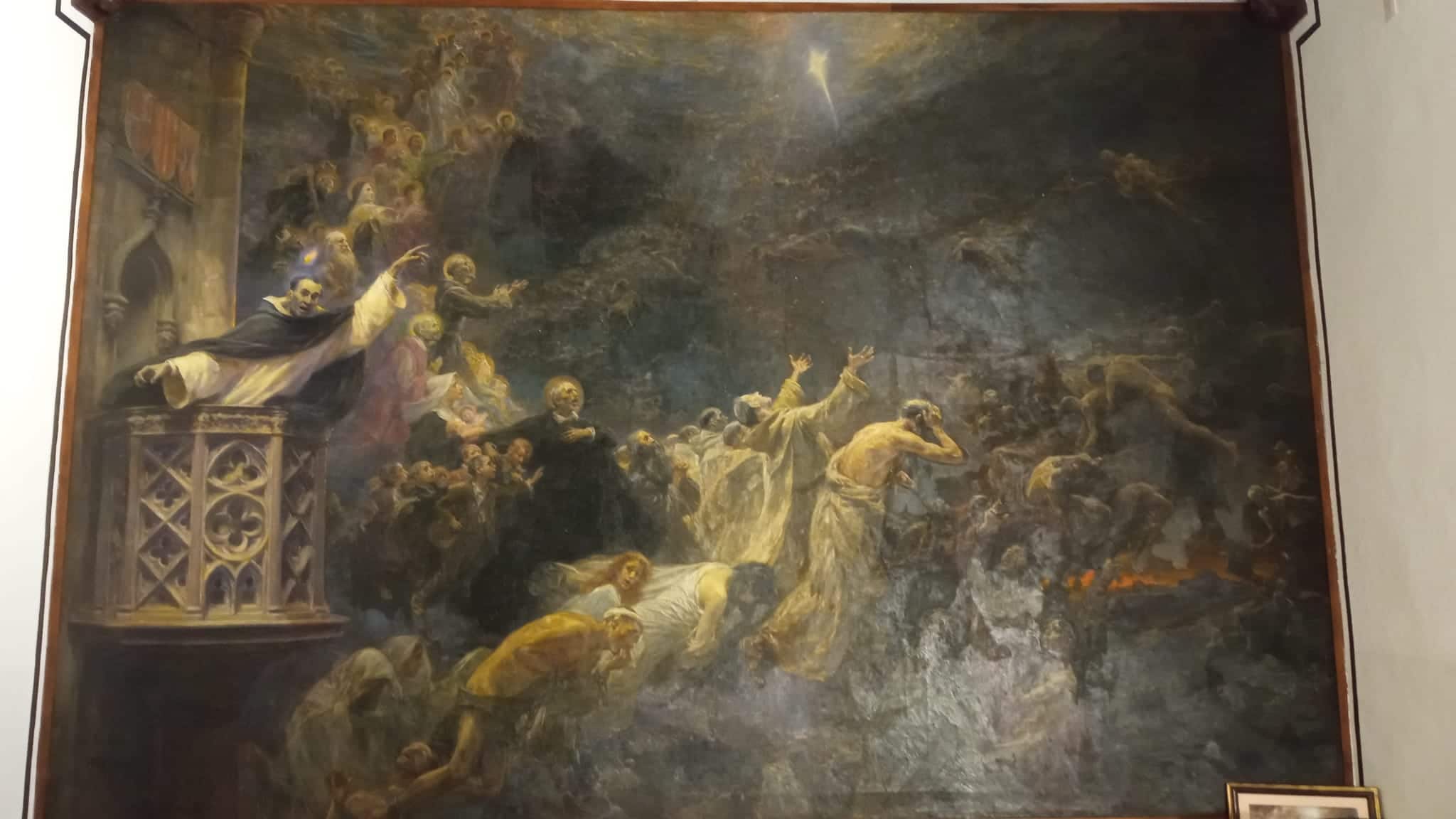 El arte se respira en cada poro del edificio, con tantos siglos sobre sus muros con historias y curiosidades que forman parte de los vecinos de València. Una de las obras que más impresiona por su tamaño y su fuerza plástica recibe a los visitantes y a los alumnos del centro al cruzar la puerta principal. A la izquierda del vestíbulo, Benlliure nos ofrece su visión del Juicio Final con un lienzo hipnótico y que esconde un secreto. Y es que como se puede apreciar en la fotografía hay una modificación realizada por el pintor años después al añadir a San Vicente Ferrer, concretamente un 12 de septiembre de 1918, fecha que puede observarse en el lateral del cuadro si uno visita la sala de las Escuelas Pías.
