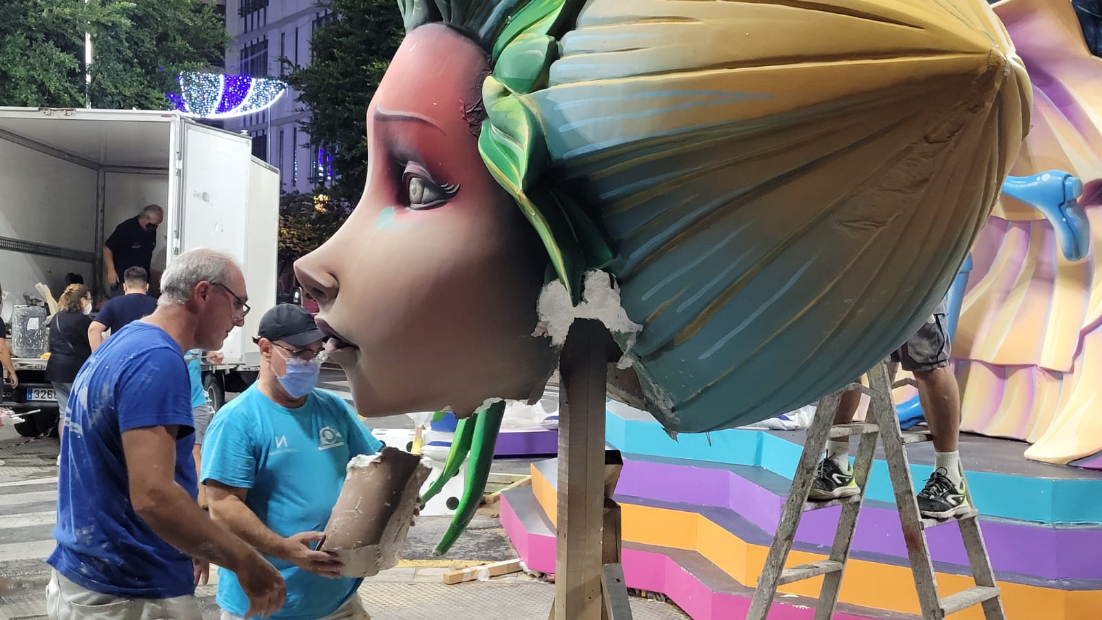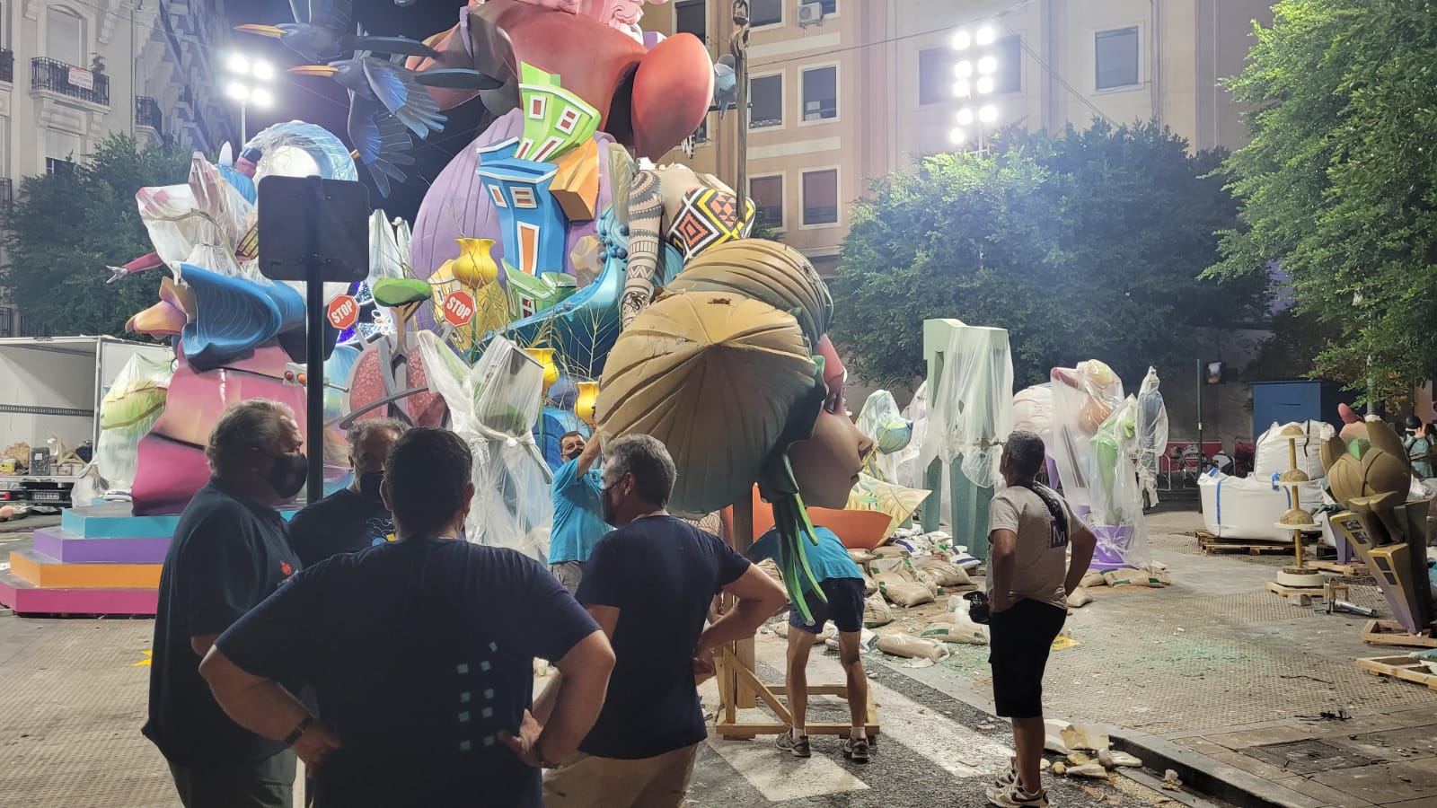 La comisión fallera se ha puesto en contacto con el artista fallero para que pueda arreglar la pieza afectada –la cabeza de una mujer que se ha roto por el cuello al parecer debido a la lluvia que ha quedado embolsada y ha caído al suelo- y así poder llegar a tiempo de la plantà.