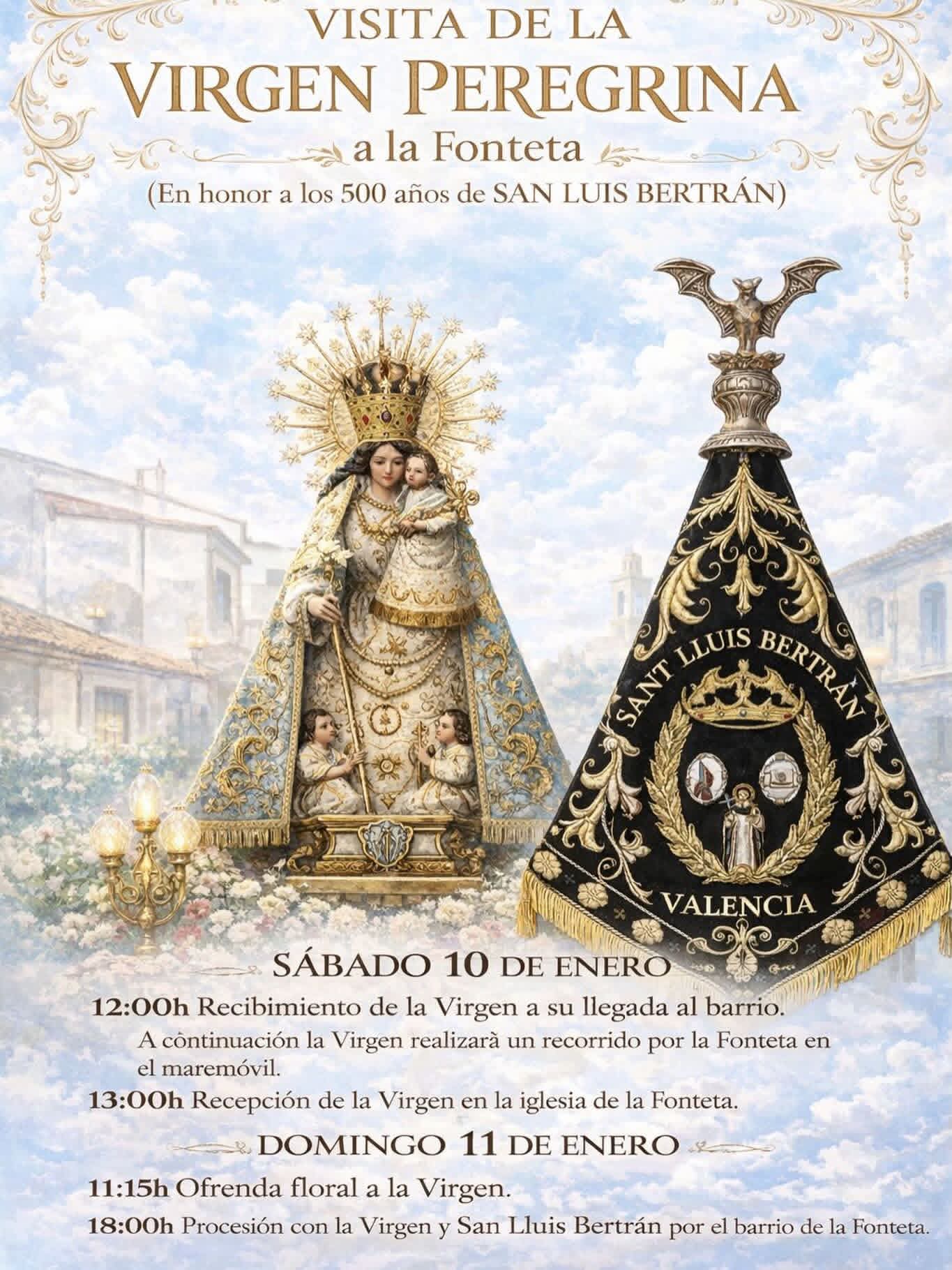 • Por la tarde: Eucaristía seguida de la procesión con las imágenes de la Virgen y de San Luis Bertrán, cerrando así los actos conmemorativos.
