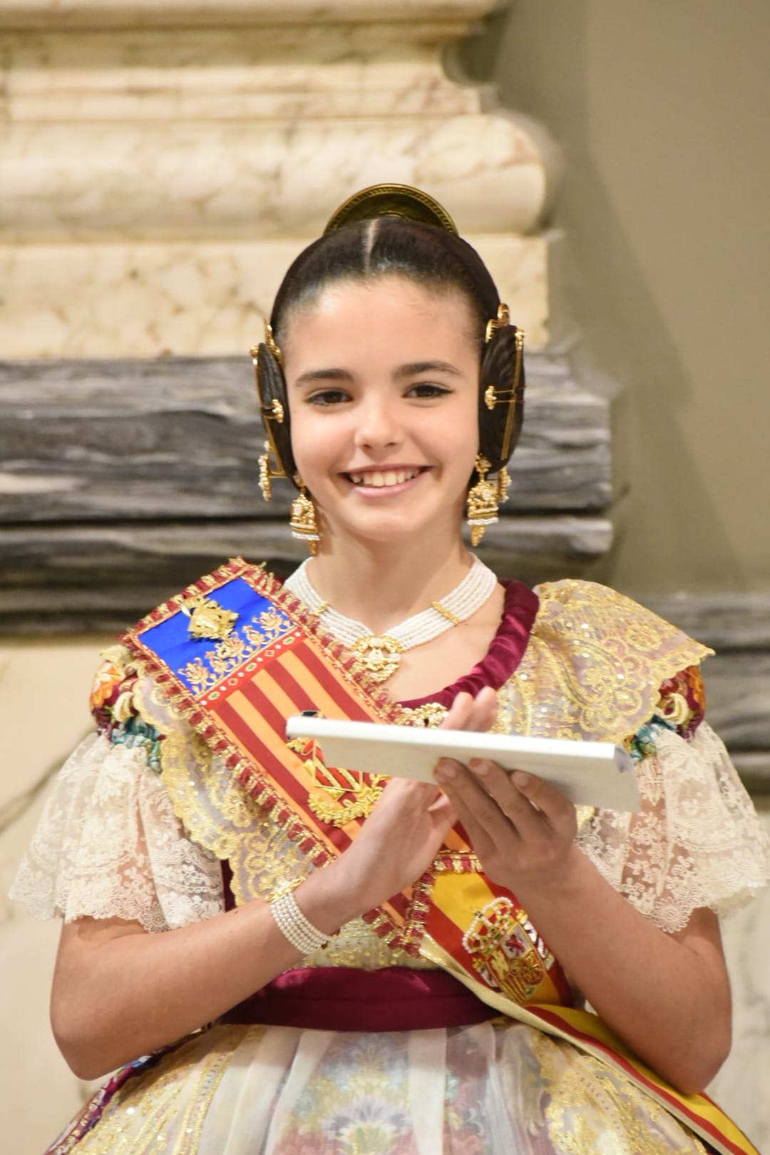 Para completar su indumentaria, María Estela lució un aderezo de racimo en oro de 18 quilates con brillantes en talla rosa, acompañado de joia, pinchos, pendientes, collar y una pulsera de siete tiras de perlas de Art Antic, además de unas espectaculares puntillas de Santos Textil.