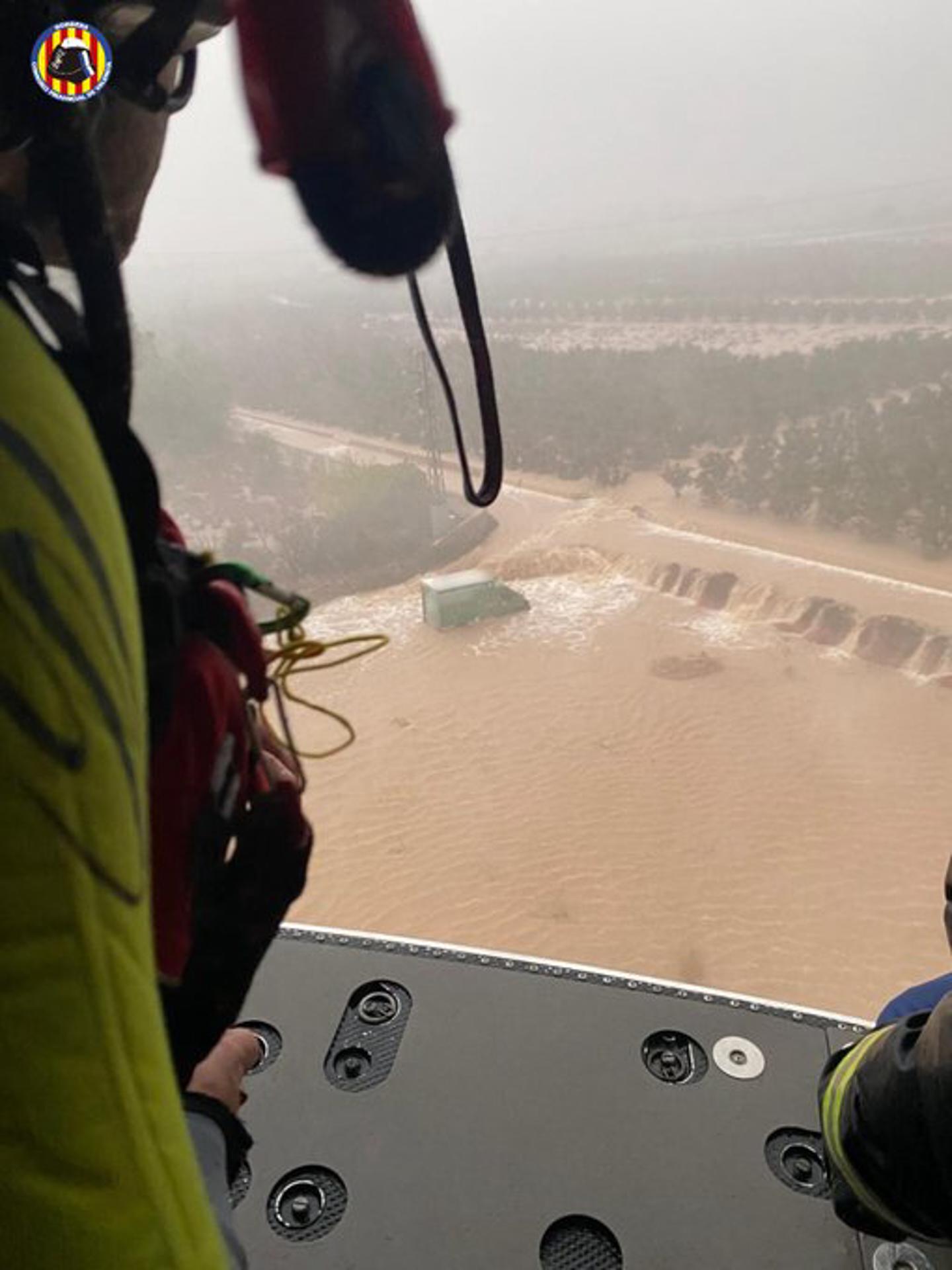 Bomberos del Consorcio Provincial de Valencia, con el helicóptero de vuelta de un servicio por el temporal de lluvias.
