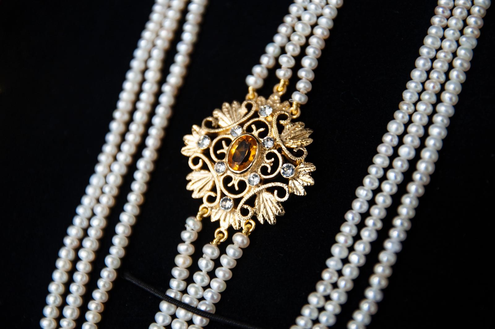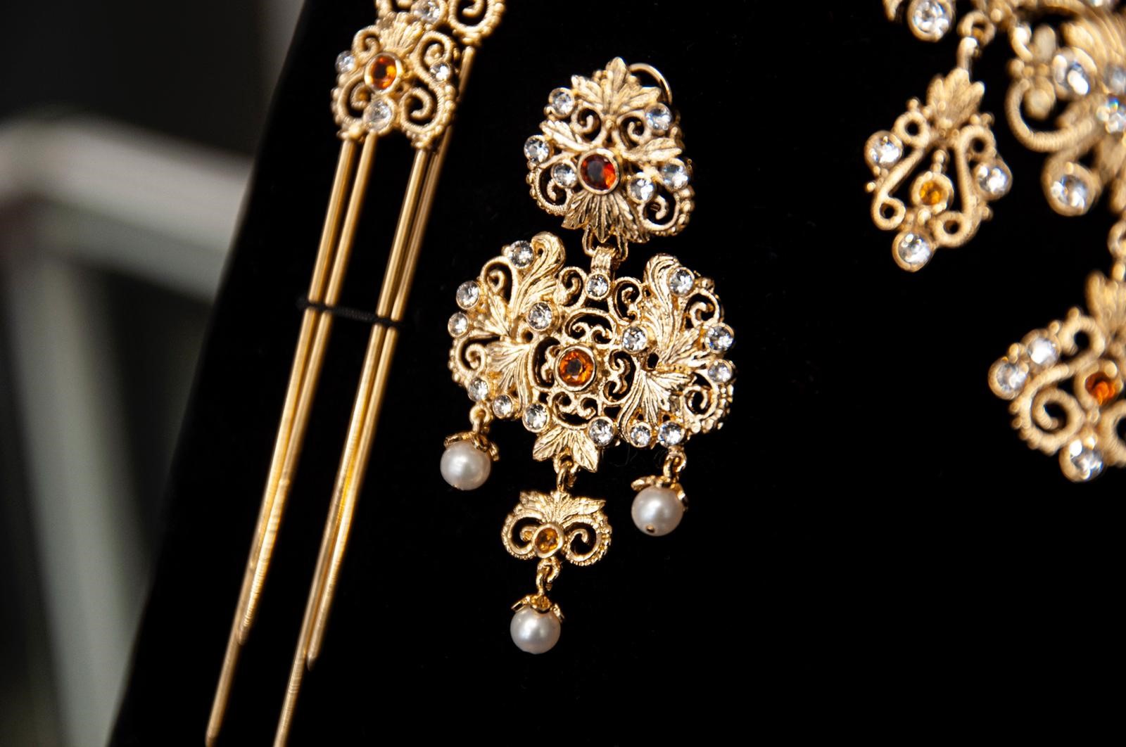 Para completar su indumentaria, María Estela lució un aderezo de racimo en oro de 18 quilates con brillantes en talla rosa, acompañado de joia, pinchos, pendientes, collar y una pulsera de siete tiras de perlas de Art Antic, además de unas espectaculares puntillas de Santos Textil.