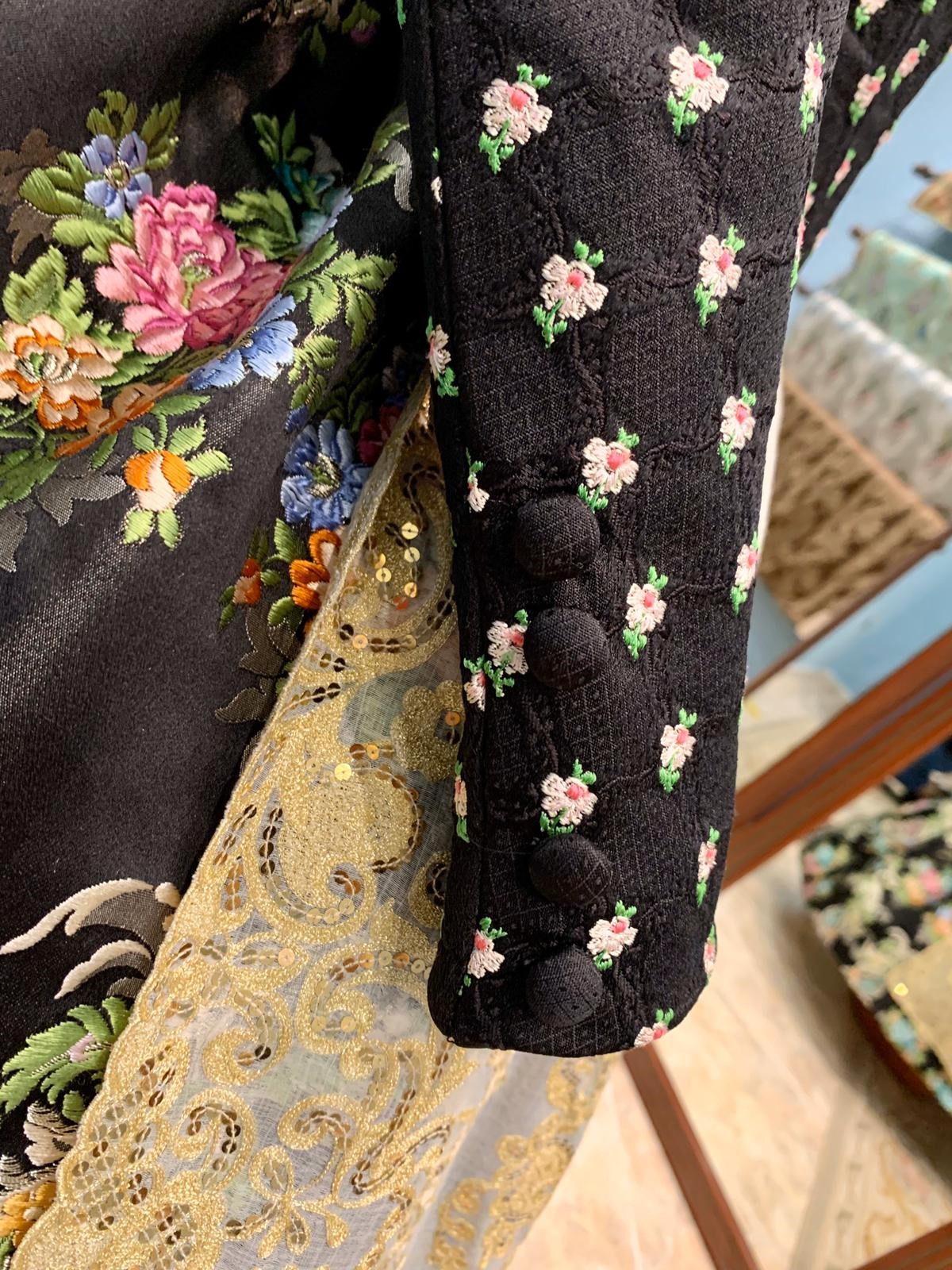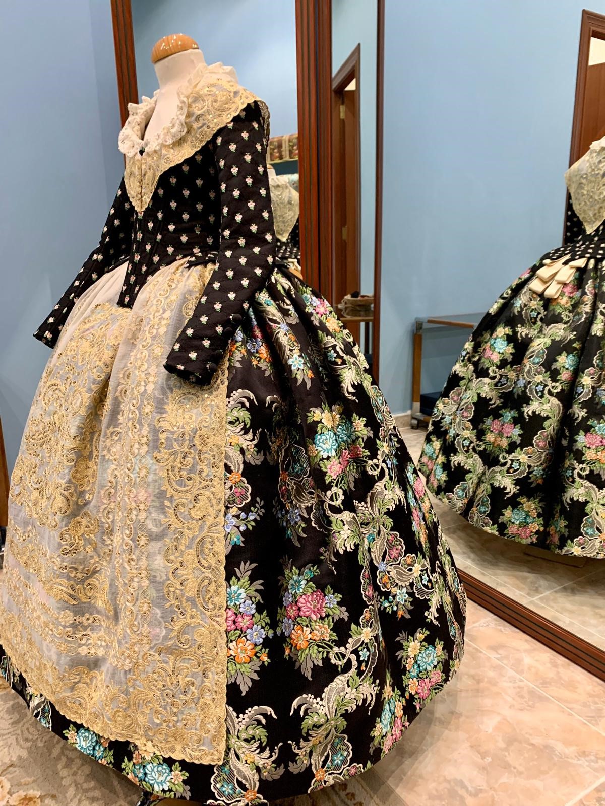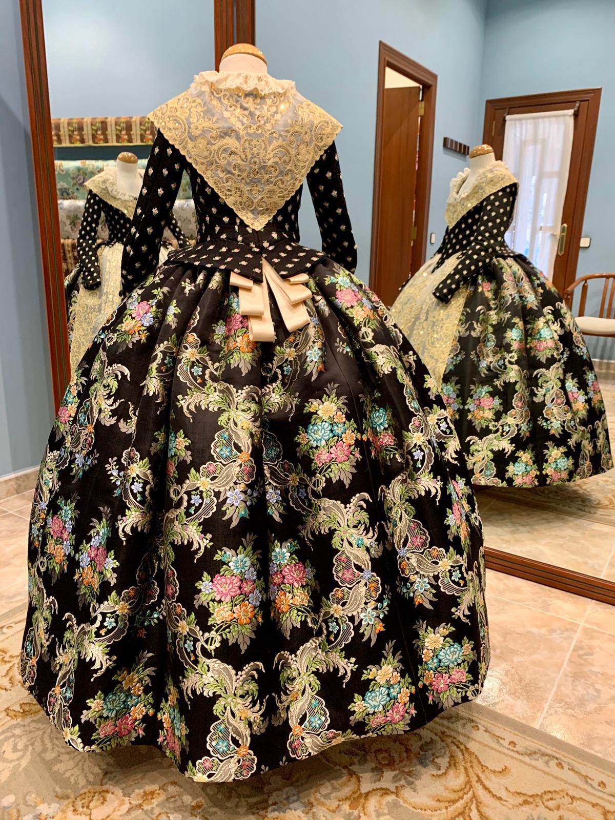 Negro azabache fue la elección de Laura Mengó para su espolín tejido. Espolines de Garín ha tejido con máquina jacquard de 400 agujas con simetría de espejo este espolín exclusivo reservado solo para las máximas representantes de la fiesta fallera.