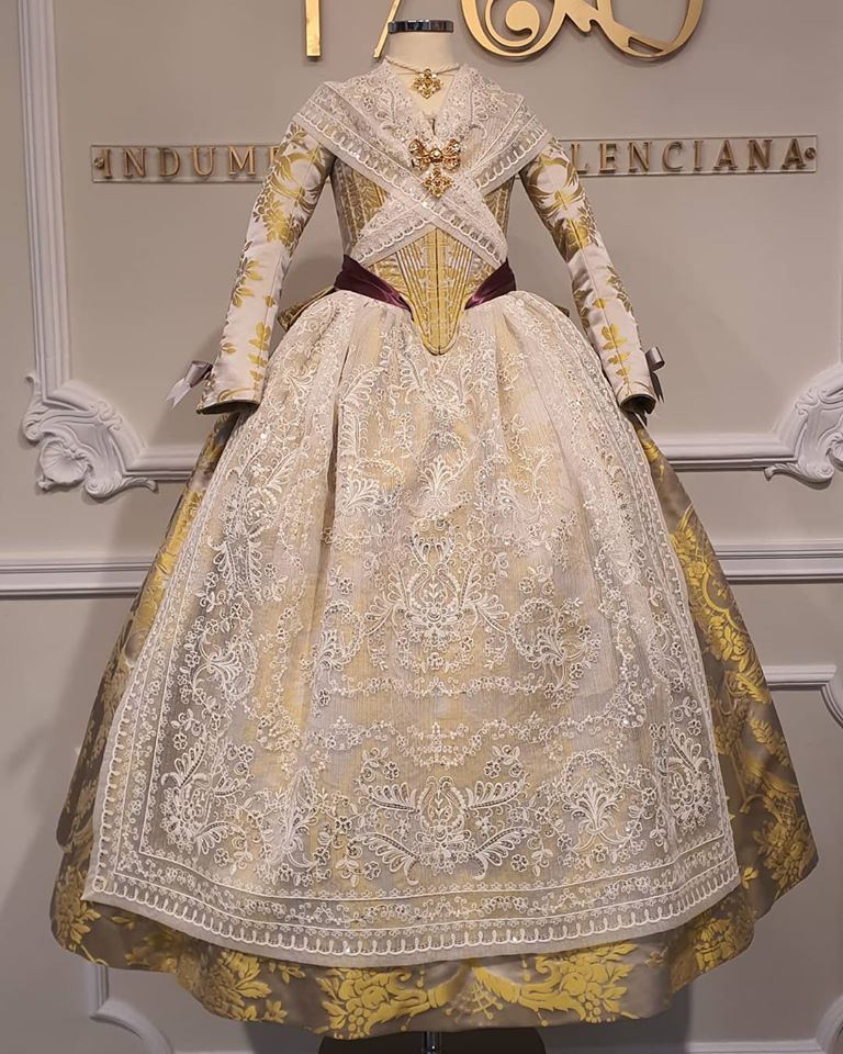 El fondo elegido fue el tono madreperla, un blanco atemporal y elegante, enriquecido con matices suaves y empolvados en los motivos florales, y adornado con metal oro volteado crema como elemento principal, logrando un tejido lleno de luz y armonía. El diseño fue fruto del trabajo del equipo de Vives y Marí, junto con la colaboración personal de la propia Fallera Mayor.