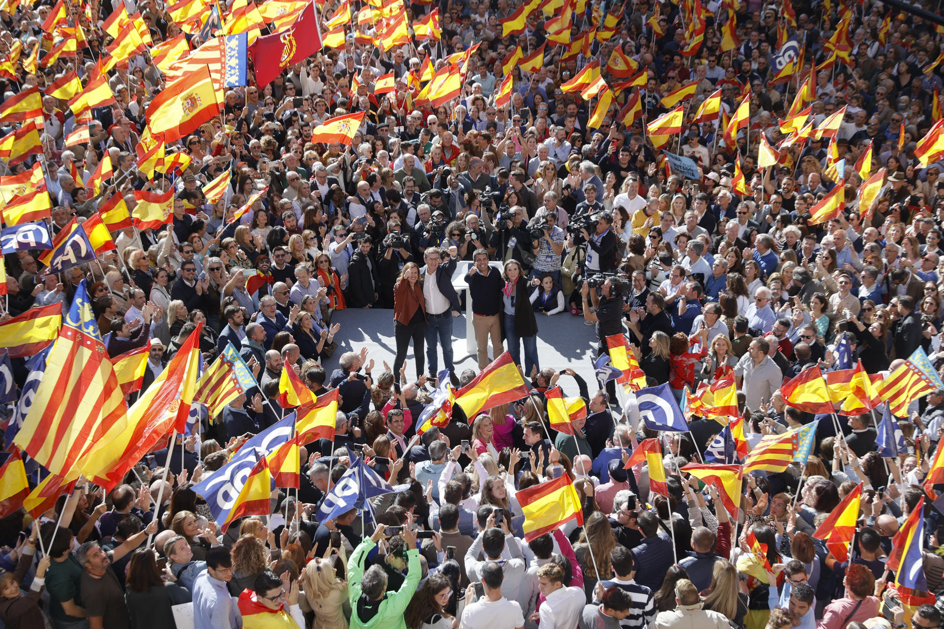 El acto se ha celebrado en la Plaza de los Fueros -las leyes por las que se rigió el antiguo Reino de Valencia del siglo XIII a comienzos del XVIII- y los asistentes, que llevaban banderas de España y han coreado lemas como «España no se vende» o «Puigdemont a prisión», han llenado también la calle Serranos (que desemboca en el Palau de la Generalitat) y la adyacente.