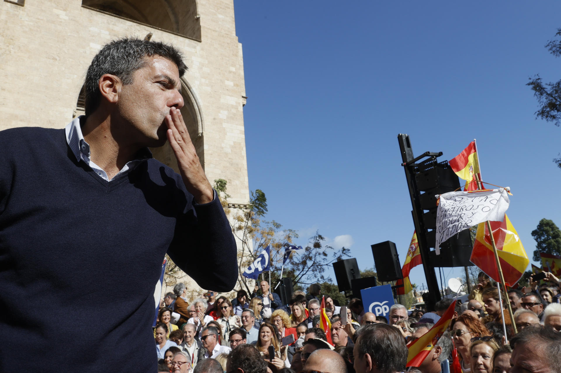 El president de la Generalitat y del PPCV, Carlos Mazón, da un discurso durante un acto contra la amnistía del «procés» y contra un referéndum de autodeterminación en Cataluña, este domingo en València. EFE/Juan Carlos Cárdenas