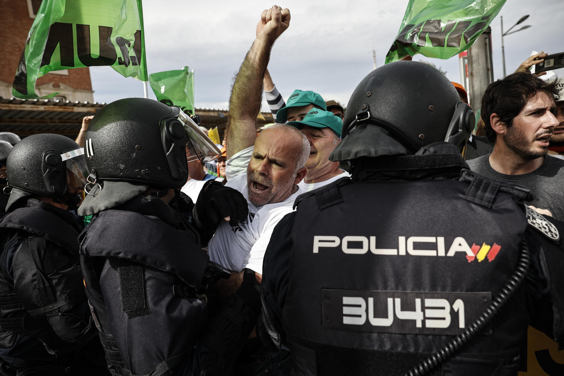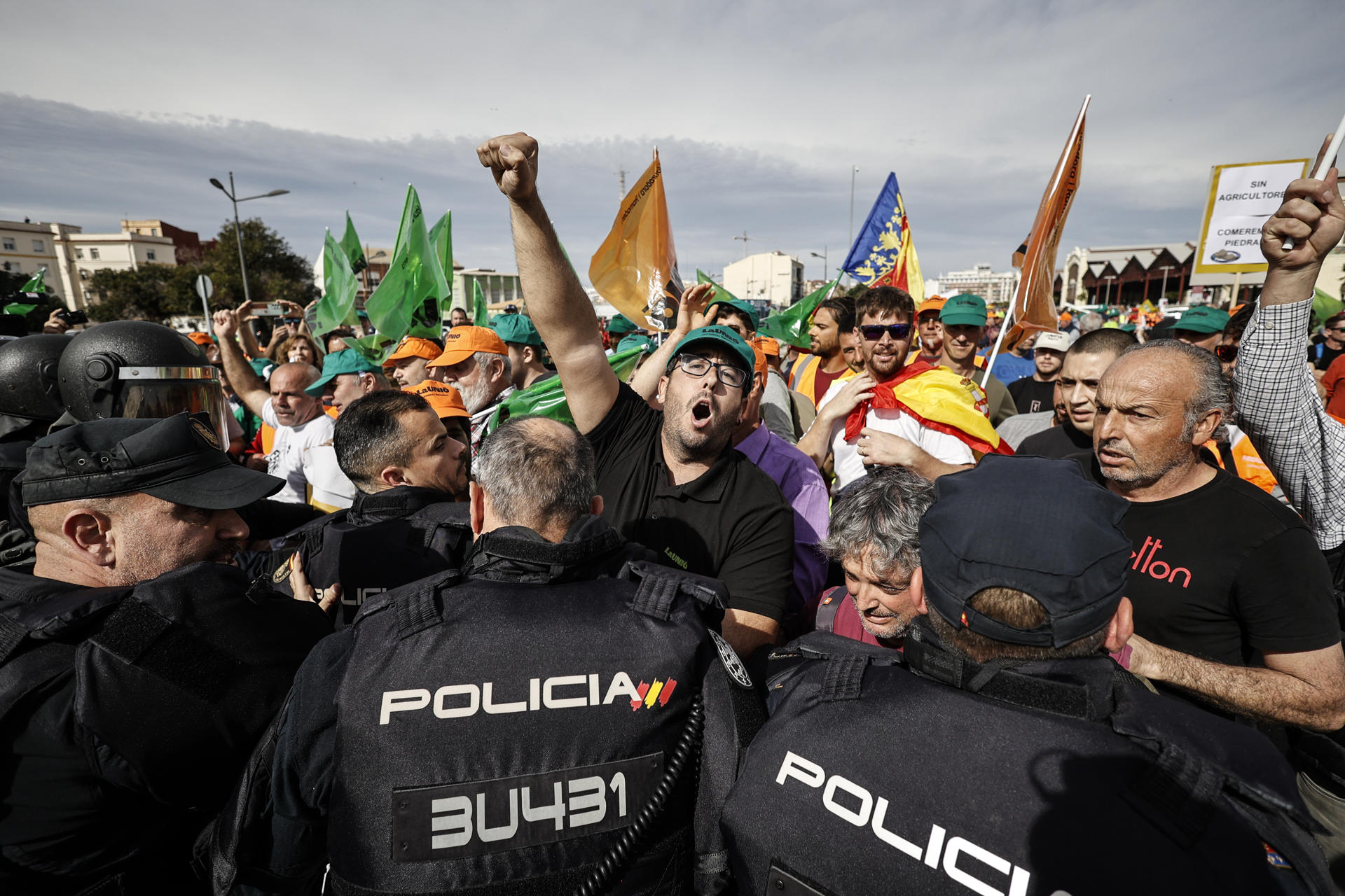 La Policía trata de contener a los cientos de agricultores que se han concentrado este jueves en el Puerto de València. EFE/Biel Aliño