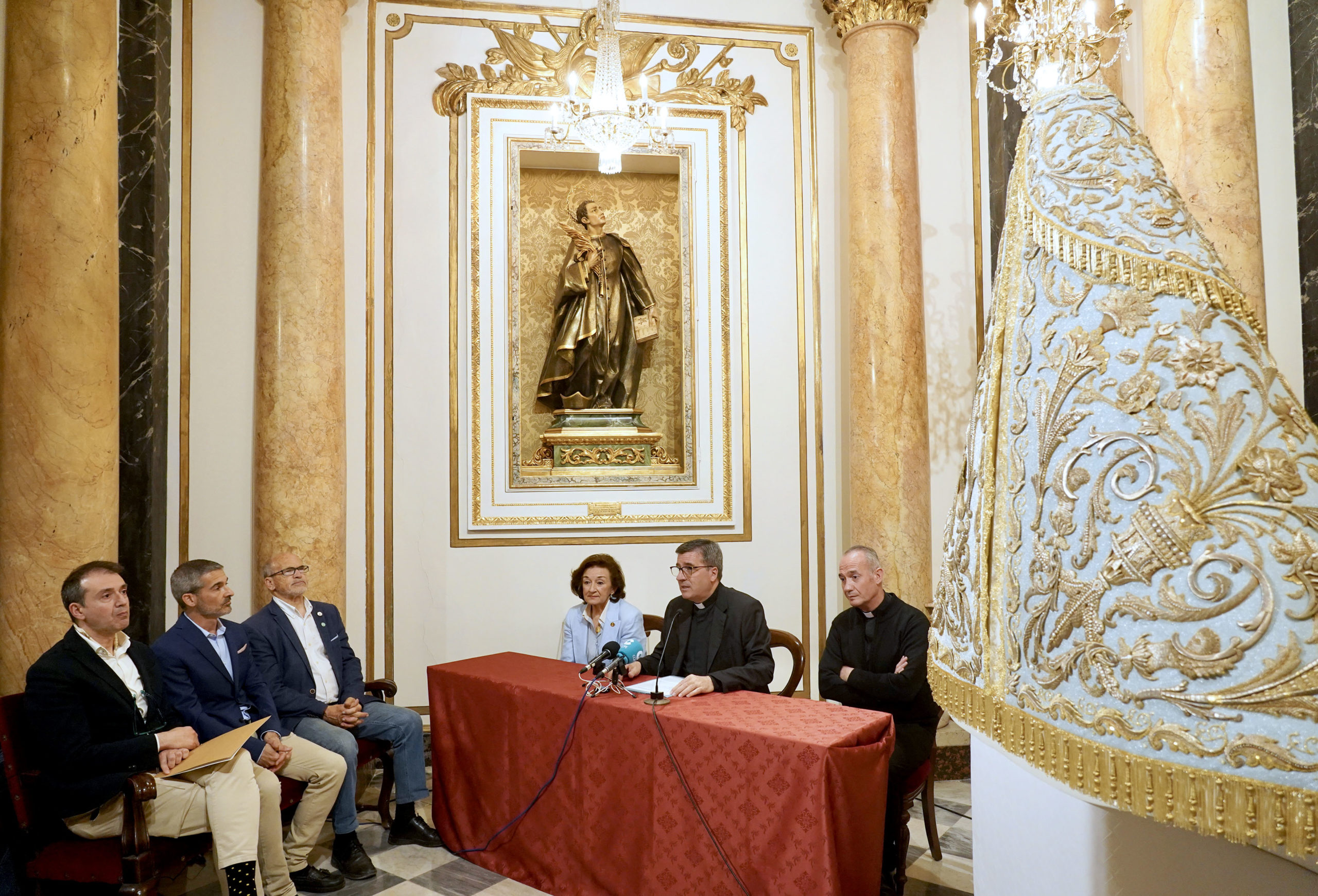 Se trata del manto “que la ciudad de Valencia regaló a la patrona en 1954 en el marco del Año Mariano convocado por el Papa Pío XII con motivo del centenario de la proclamación del Dogma de la Inmaculada Concepción”, tal y como ha explicado Juan Melchor Seguí, rector de la Basílica de la Virgen de los Desamparados.