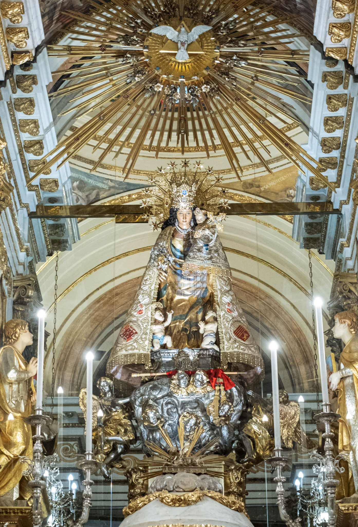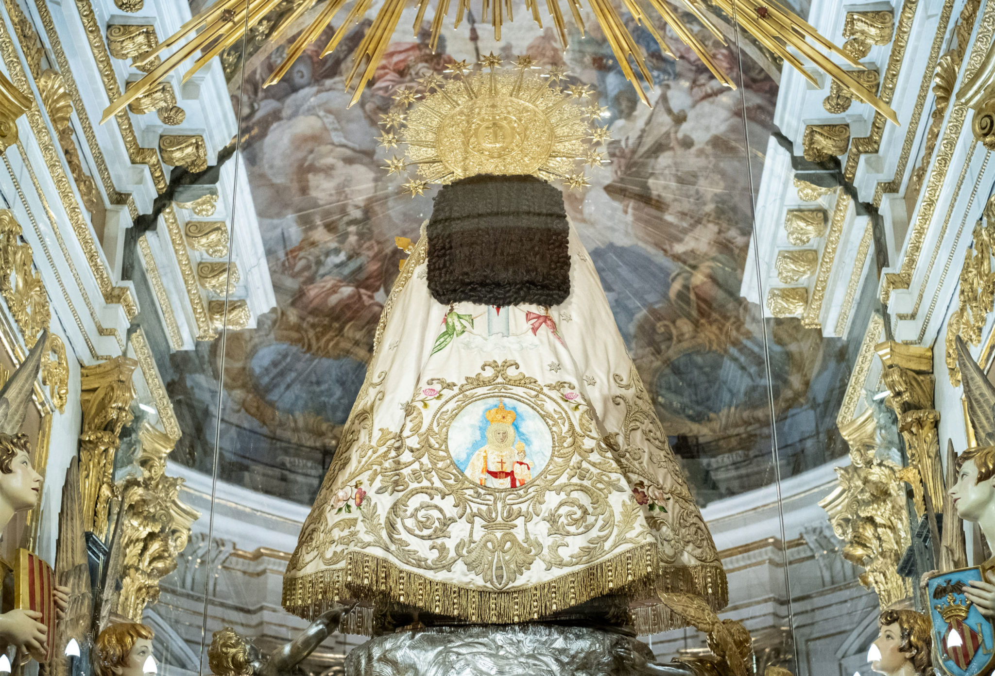 ARCHIDIÓCESIS DE VALENCIA, 12 DIC.- La imagen de la Virgen de los Desamparados del altar mayor de la Basílica luce desde hoy, y durante los próximos meses, un manto de seda y oro, del año 1957, que ha sido recientemente restaurado.