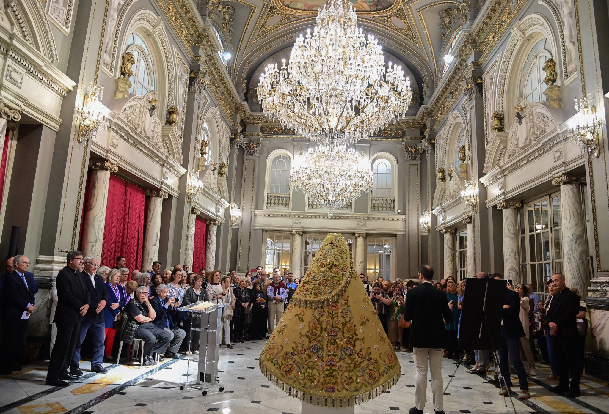 El Ayuntamiento de València ha acogido la presentación del manto que lucirá la Virgen de los Desamparados durante la procesión general del domingo 14 de mayo. Un ajuar restaurado a partir del terno arzobispal utilizado en la segunda coronación de la Virgen.